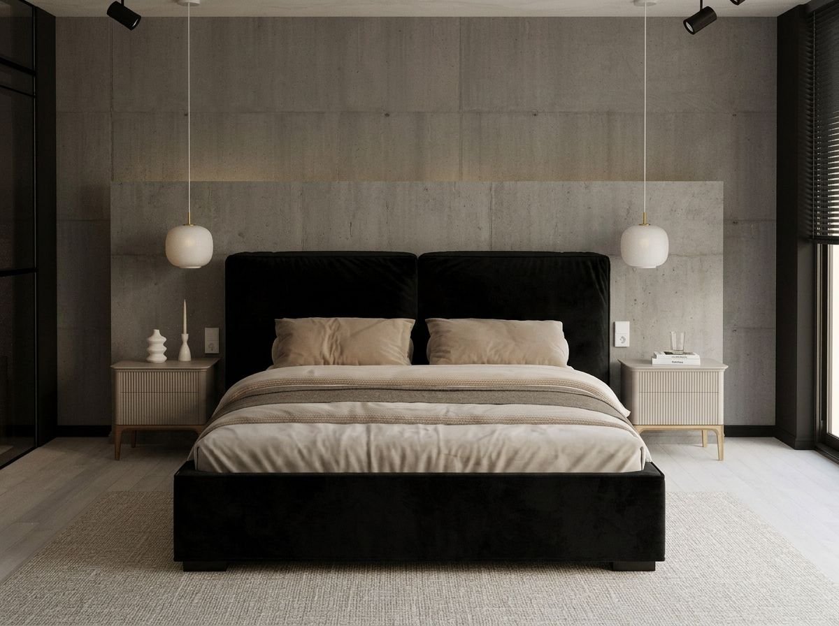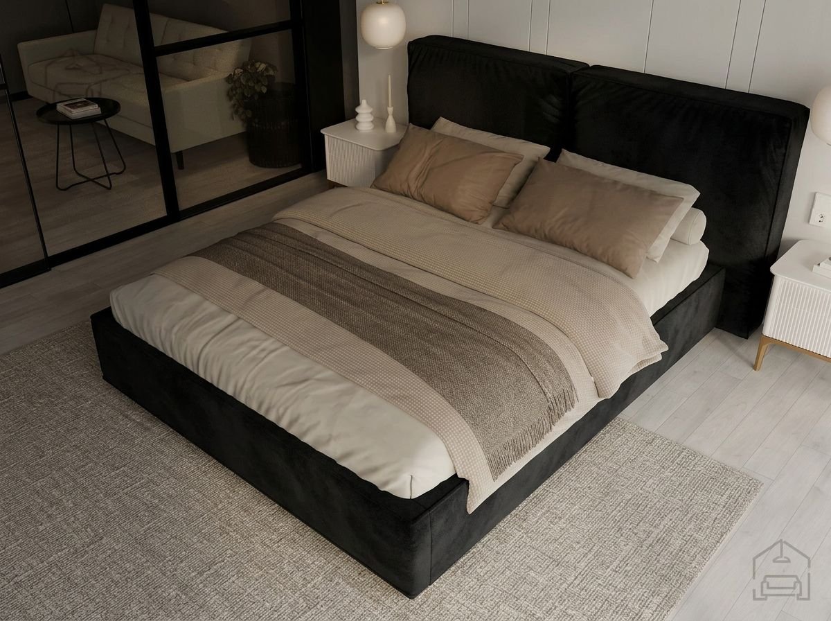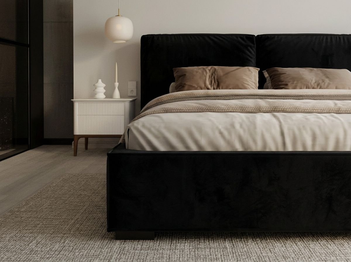 Krevet je izrađen od kombinacije pjene T-25, drveta i iverice. Ti materijali zajedno čine čvrstu i pouzdanu konstrukciju koja zadržava svoj oblik i stabilnost i nakon dulje uporabe. Tapecirani okvir dodatno je obložen, što krevetu daje mekan izgled i ugodan osjećaj na dodir. Na fotografiji je prikazana tkanina Trinity black, ali je u ponudi dostupno više varijanti boja, kako bi se model mogao u potpunosti prilagoditi unutarnjem stilu vaše spavaće sobe.