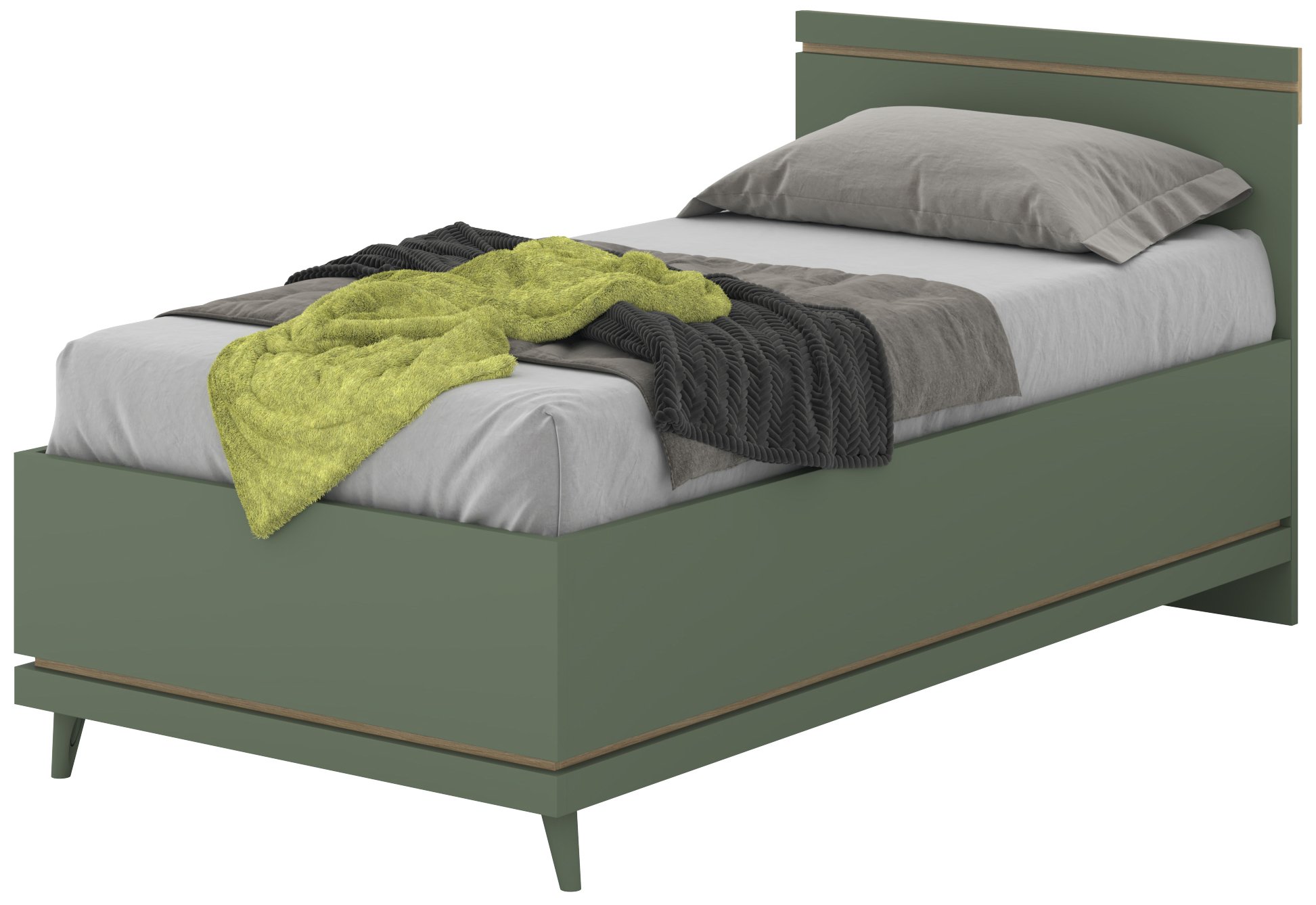 Svaki detalj pažljivo je osmišljen s mišlju na udobnost i estetiku. Površina u boji izblijedjelog zelenog hrasta djeluje prirodno i toplo, dok suptilne zelene nijanse dodaju moderan dodir koji se savršeno uklapa u različite stilove uređenja interijera – od skandinavskog minimalizma do rustikalno-modernih ambijenata. Krevet je rezultat precizne izrade u poznatoj tvornici Helvetia Meble iz Poljske, poznatoj po visokoj kvaliteti, inovativnosti i pažnji prema detaljima. Svaki komad namještaja dizajniran je tako da zadovolji potrebe suvremenog korisnika koji traži spoj estetike, udobnosti i trajnosti. Plastične nogice omogućuju stabilno postavljanje te štite pod od ogrebotina, a istovremeno dodaju suptilan kontrast prirodnoj boji drva. Zbog svog kompaktnog dizajna, ovaj se krevet savršeno uklapa i u manje i u veće prostore, pa je odličan izbor za sobe mladih, garsonijere ili moderne spavaće sobe.
