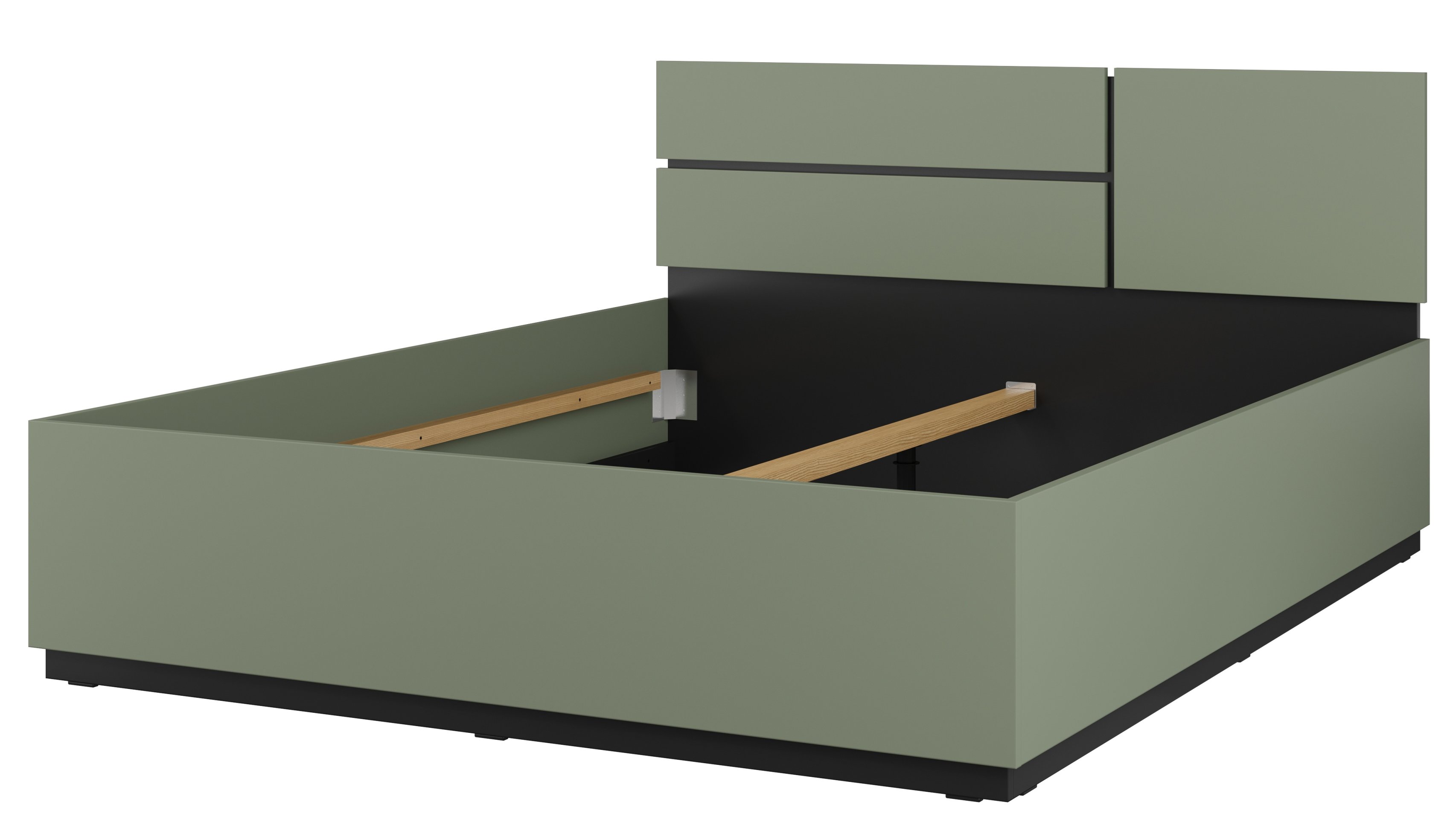 Model Cross S odlikuje se suvremenim, funkcionalnim dizajnom koji karakterizira uravnotežen kontrast između zelene površine i crnih naglasaka. Takva koloristička shema omogućuje da krevet postane središnji element spavaće sobe, a istodobno se lijepo uklapa s neutralnim zidovima, svijetlim parketom ili dodacima u metalnim tonovima. Jednostavna geometrija okvira i ravne linije omogućuju kombiniranje s različitim komadima namještaja – od modernih noćnih ormarića do minimalističkih garderobnih ormara iste marke.