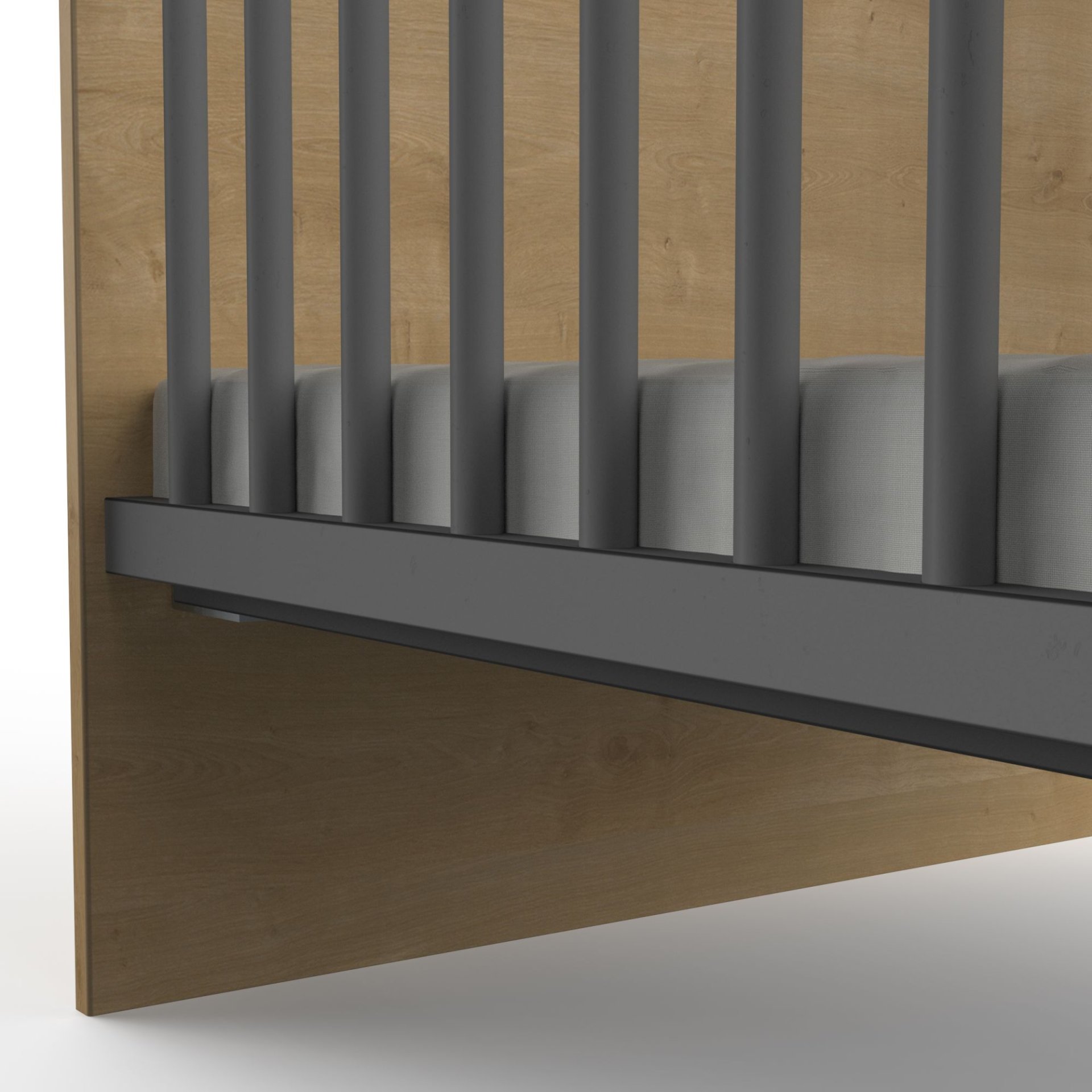 Sigurnost djeteta pri oblikovanju krevetića Gabin na prvom je mjestu. Bočne letvice u mat sivoj boji osiguravaju čvrstu zaštitu koja sprječava da dijete tijekom spavanja ili igre padne iz kreveta. Zaobljeni gornji dijelovi ograde smanjuju rizik od udaraca i stvaraju ugodan vizualni dojam. Letveno dno kreveta podesivo je po visini, što znači da se može prilagoditi dobi i potrebama djeteta – viši položaj za novorođenče i niži kada dijete počne samostalno ustajati.