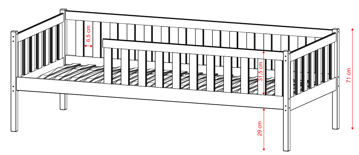 Ukupne dimenzije kreveta iznose 87x188x71 cm, što ga svrstava među prostorno učinkovita rješenja. Unatoč manjim vanjskim mjerama, nudi ležište standardnih dječjih dimenzija 80x180 cm, koje omogućuje udoban san. Visina od 71 cm osigurava optimalnu pristupačnost za djecu, a pritom omogućuje jednostavno čišćenje ispod kreveta ili po potrebi dodavanje niske kutije za pohranu igračaka.
