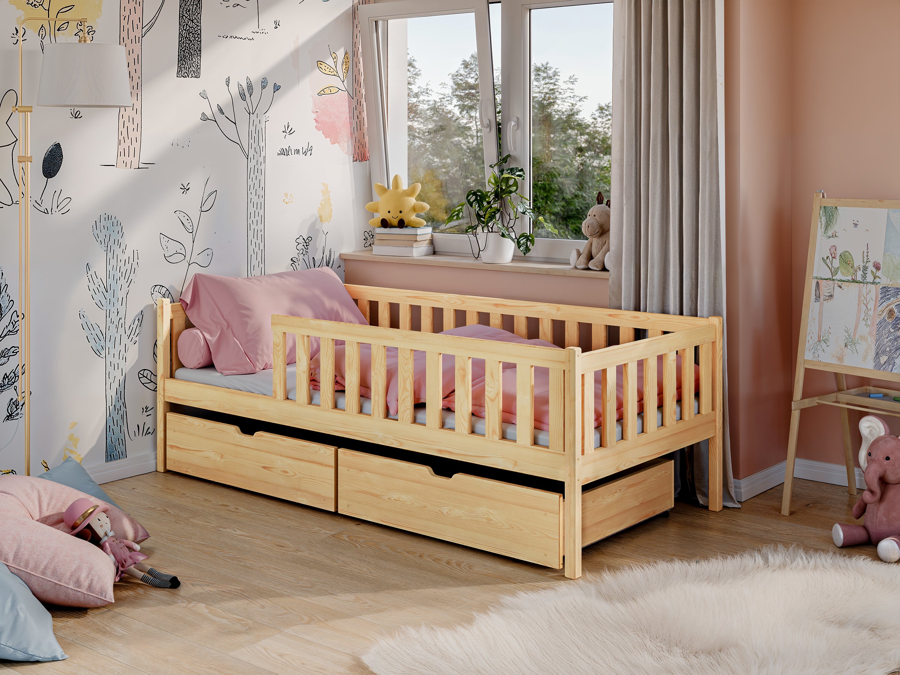 Pod ležištem se nalazi ladica za posteljinu koja omogućuje učinkovito pohranjivanje pokrivača, jastuka ili igračaka. Ladica se jednostavno izvlači i pruža dodatnu funkcionalnost bez potrebe za dodatnim ormarima. Krevet ima uključenu letvicu za podnicu, koja osigurava pravilnu potporu madracu te dobro prozračivanje površine za spavanje. Madrac nije uključen u cijenu, što omogućuje da ga odaberete prema individualnim potrebama djeteta – tvrđi ili mekši, od lateksa, pjene ili drugih materijala.