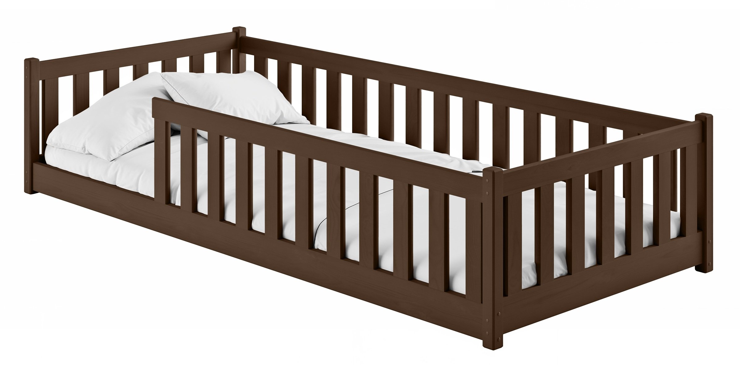 Dječji krevet Bella – Lano dizajniran je za udobje, sigurnost i dug vijek trajanja. Izrađen je od kvalitetnog borovog drva, koje zbog svoje prirodne čvrstoće i toplog izgleda stvara ugodan prostor za spavanje i igru. Tamno čokoladna boja drva daje krevetu moderan, a istovremeno domaći karakter, koji se lijepo uklapa s različitim stilovima dječjih soba. Ležajna površina mjeri 80x180 cm, što je idealno za dijete ili mladu osobu i omogućuje udoban san bez ograničavanja prostora u sobi.