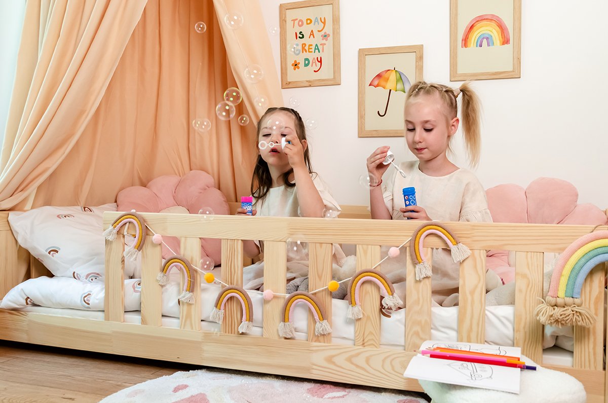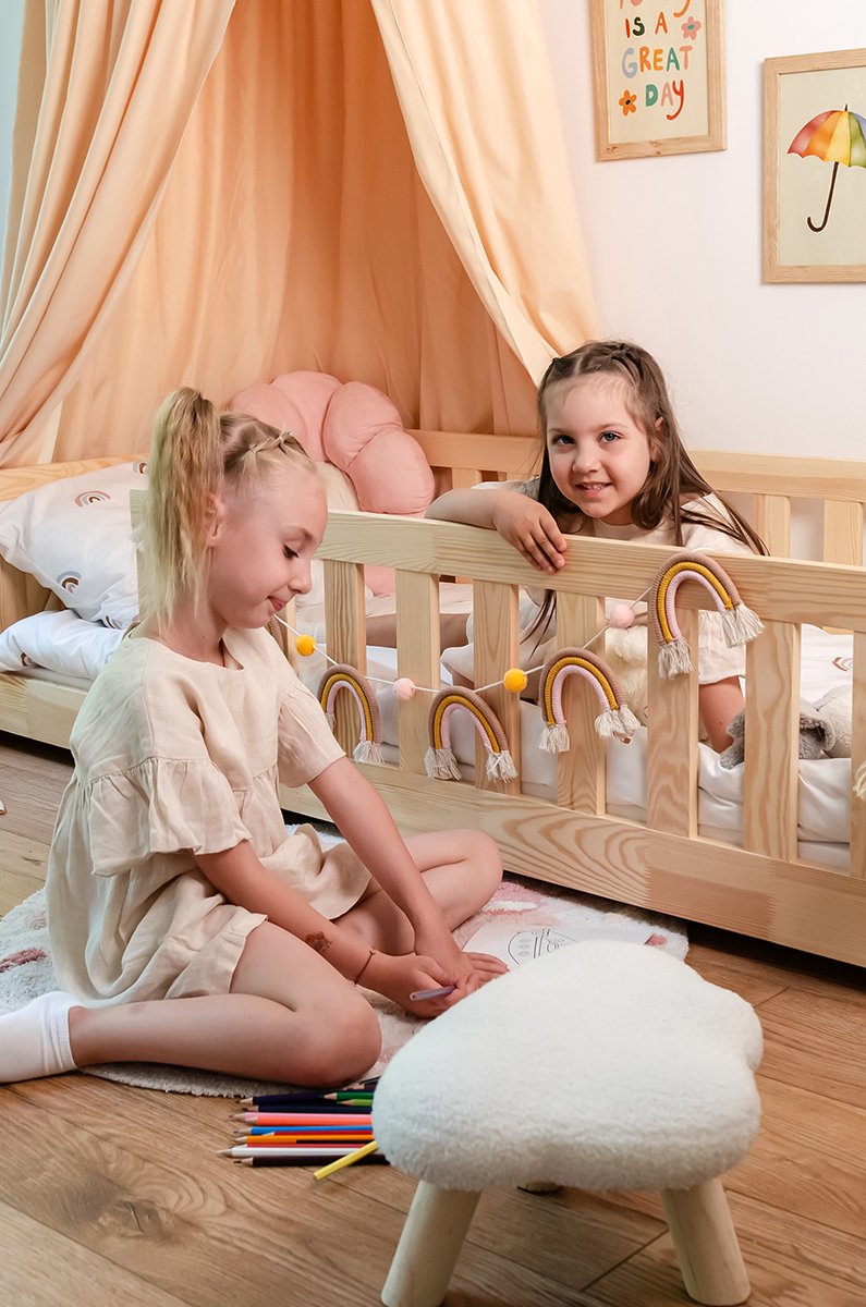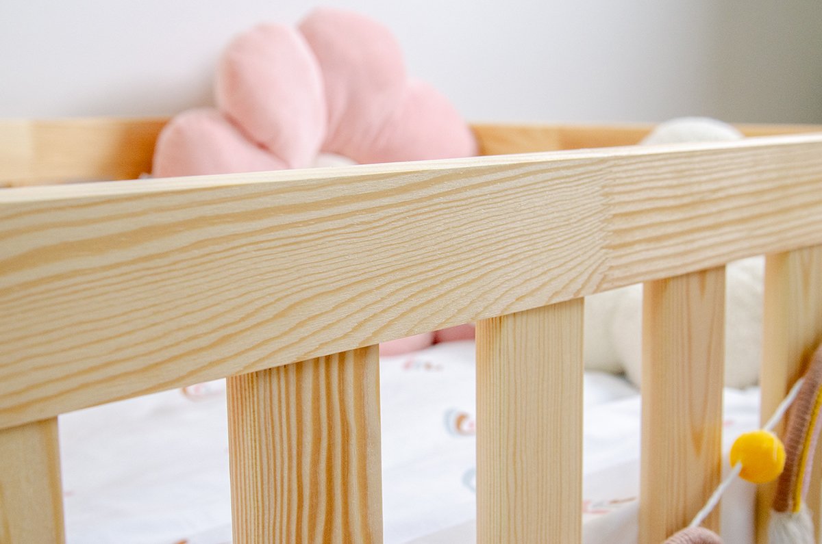 Krevet je u potpunosti izrađen od masivnog borovog drva, poznatog po svojoj izdržljivosti i ugodnoj svijetloj boji. Površina je obrađena tako da zadržava prirodnu teksturu drva, što pridonosi toplom i domaćem izgledu. Okvir od bora osigurava stabilnost i dug vijek trajanja, što je posebno važno kod dječjeg namještaja, koji mora podnijeti svakodnevna opterećenja.
