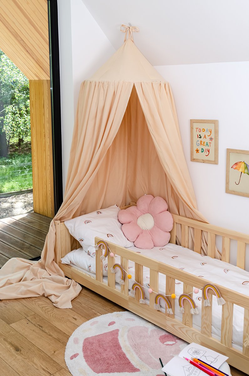 Boja bora daje krevetu prirodan i bezvremenski izgled. Svijetli ton drva vizualno povećava prostor i ispunjava ga osjećajem topline i mira. Zbog neutralne nijanse krevet Bella lako se kombinira s različitim bojama zidova, tekstila i dekoracije. Prikladan je i za klasično i za moderno uređene dječje sobe.