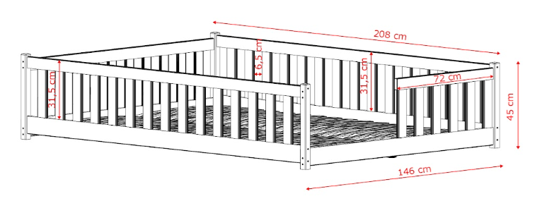 Ukupne dimenzije kreveta su 0x208x45 cm, što znači da je dizajniran tako da se optimalno uklapa u standardne dječje sobe i omogućuje jednostavno postavljanje uz zid ili u kut prostorije. Ležište mjeri 140x200 cm, što osigurava dovoljno prostora za spavanje i igru. Krevet je opremljen letvenim dnom koje omogućuje dobro prozračivanje ležišta te produžuje vijek trajanja madraca. Madrac nije uključen u cijenu, što omogućuje da ga odaberete prema vlastitim željama o tvrdoći, visini i materijalima.