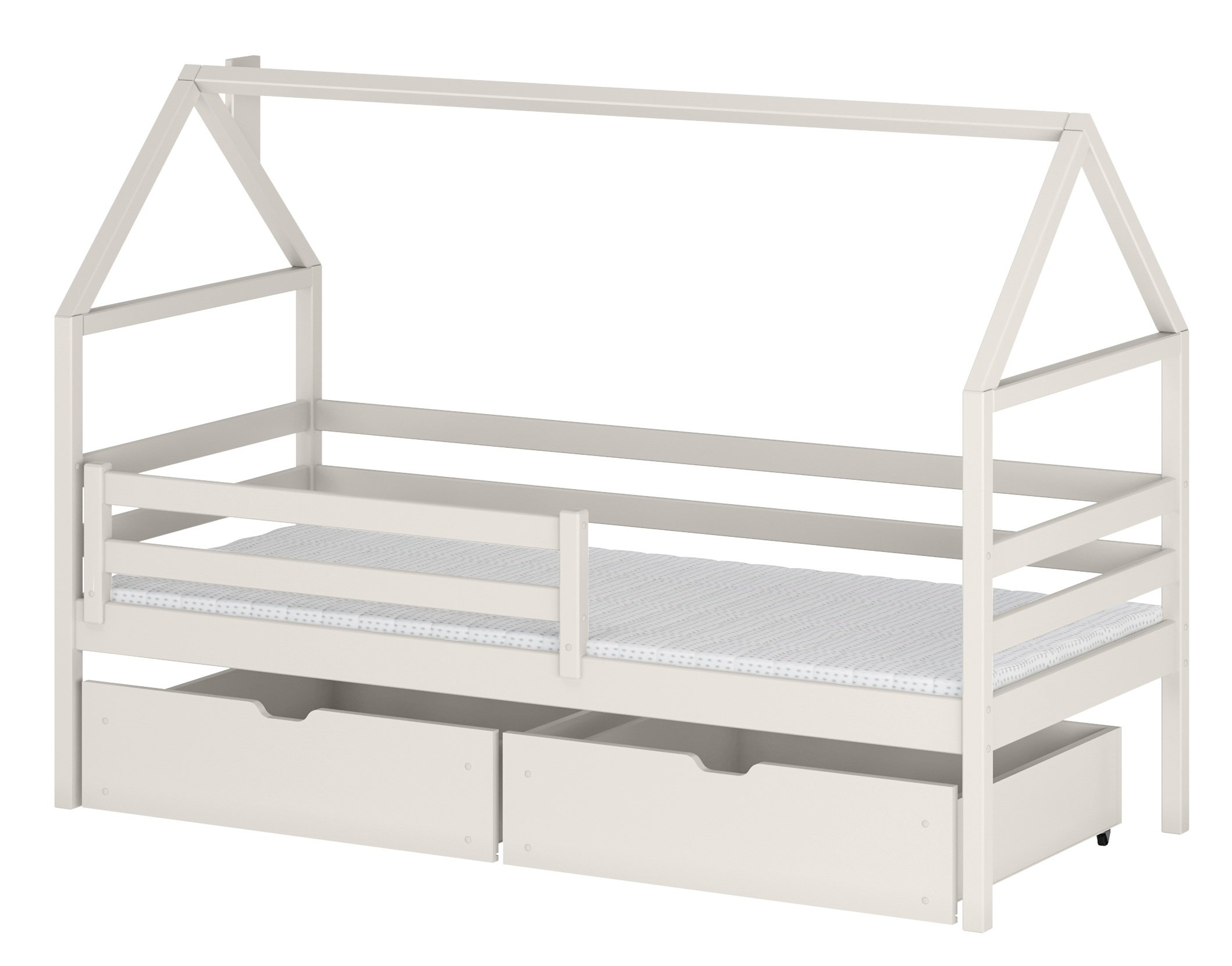 Dječji krevet kućica Aron – Lano spaja estetiku i praktičnost. U osnovi je opremljen s dvije prostrane ladice, koje su idealne za pohranu posteljine, igračaka ili drugih osobnih predmeta. Ladice su smještene ispod ležišta, što omogućuje optimalno iskorištenje prostora u dječjoj sobi. Dodatnu funkcionalnost osigurava fiksna pregrada, koja je uključena u cijenu kreveta. Ova pregrada djeluje kao zaštita od pada i istovremeno kao vizualni element koji naglašava kućasti oblik kreveta. Po želji ju je moguće ukloniti, što omogućuje prilagodbu prema dobi djeteta i potrebama prostora.