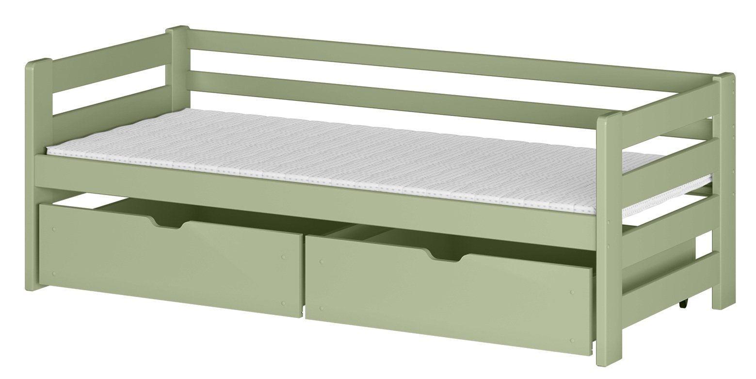 Krevet uključuje fiksnu pregradu koja osigurava sigurnost tijekom spavanja, osobito kod mlađe djece. Letvičasta podnica već je priložena, pa omogućuje dobro prozračivanje madraca i stabilnu potporu tijekom cijele noći. U donjem dijelu nalazi se praktična ladica za posteljinu, u koju se mogu spremiti deke, jastuci ili igračke, čime se štedi dragocjen prostor u sobi.
