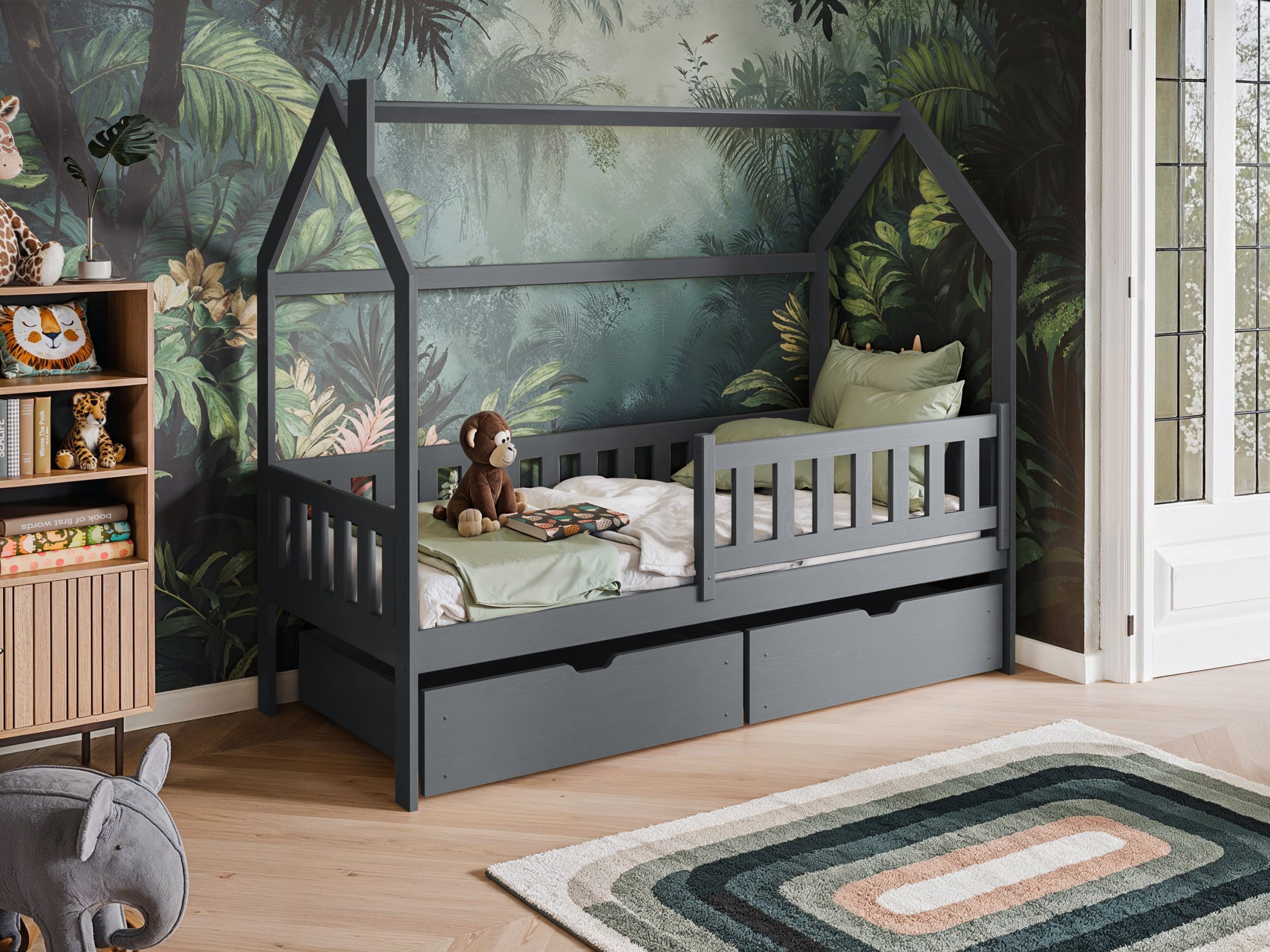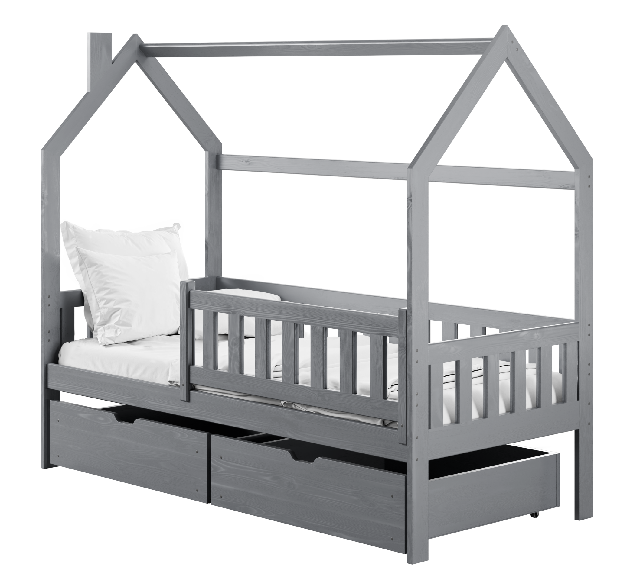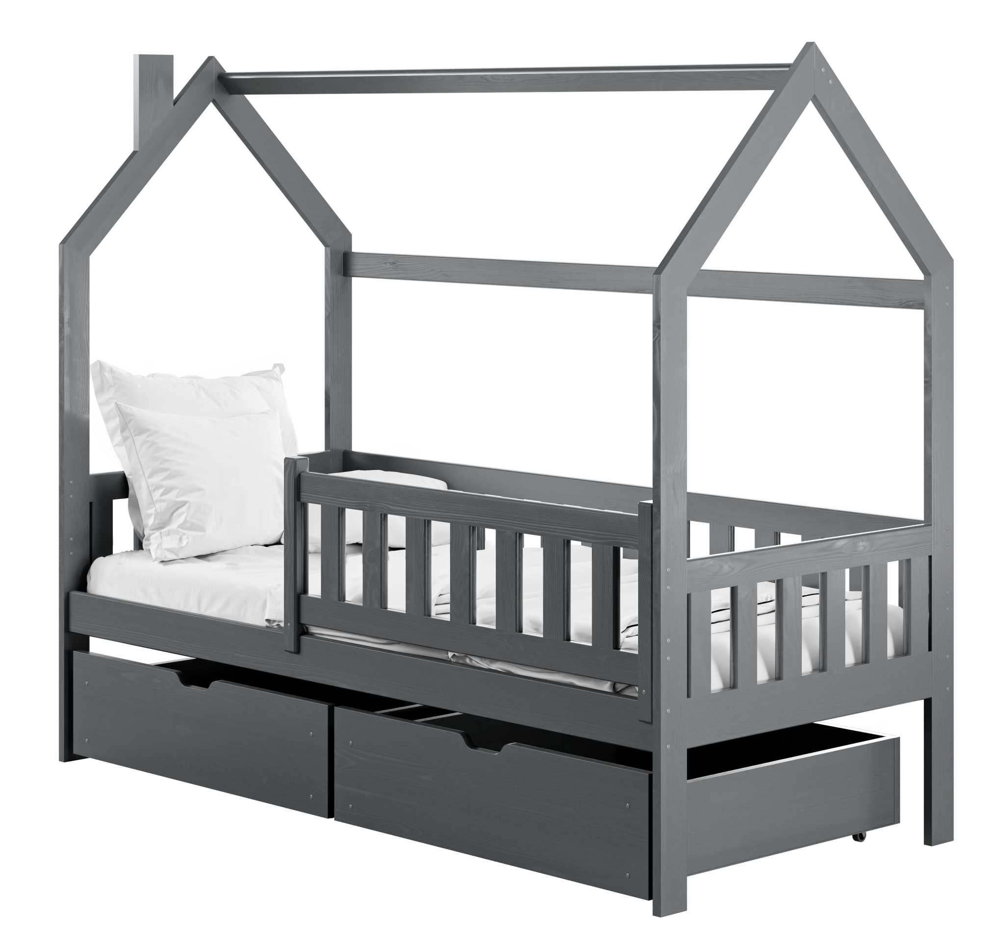 Kućasti oblik okvira daje krevetu karakter koji dječju sobu pretvara u bajkovit prostor. Djeca ga mogu ukrasiti svjetlima, girlandama ili tkaninama i tako stvoriti svoj mali dom unutar sobe. Odabirom boje možete naglasiti prirodan izgled drva ili stvoriti neutralno, suvremeno okruženje. Bijela boja donosi svjetlost i prozračnost, nijansa bora naglašava prirodnu strukturu drva, dok grafit, siva, kašmir i maslina dodaju moderan dodir.