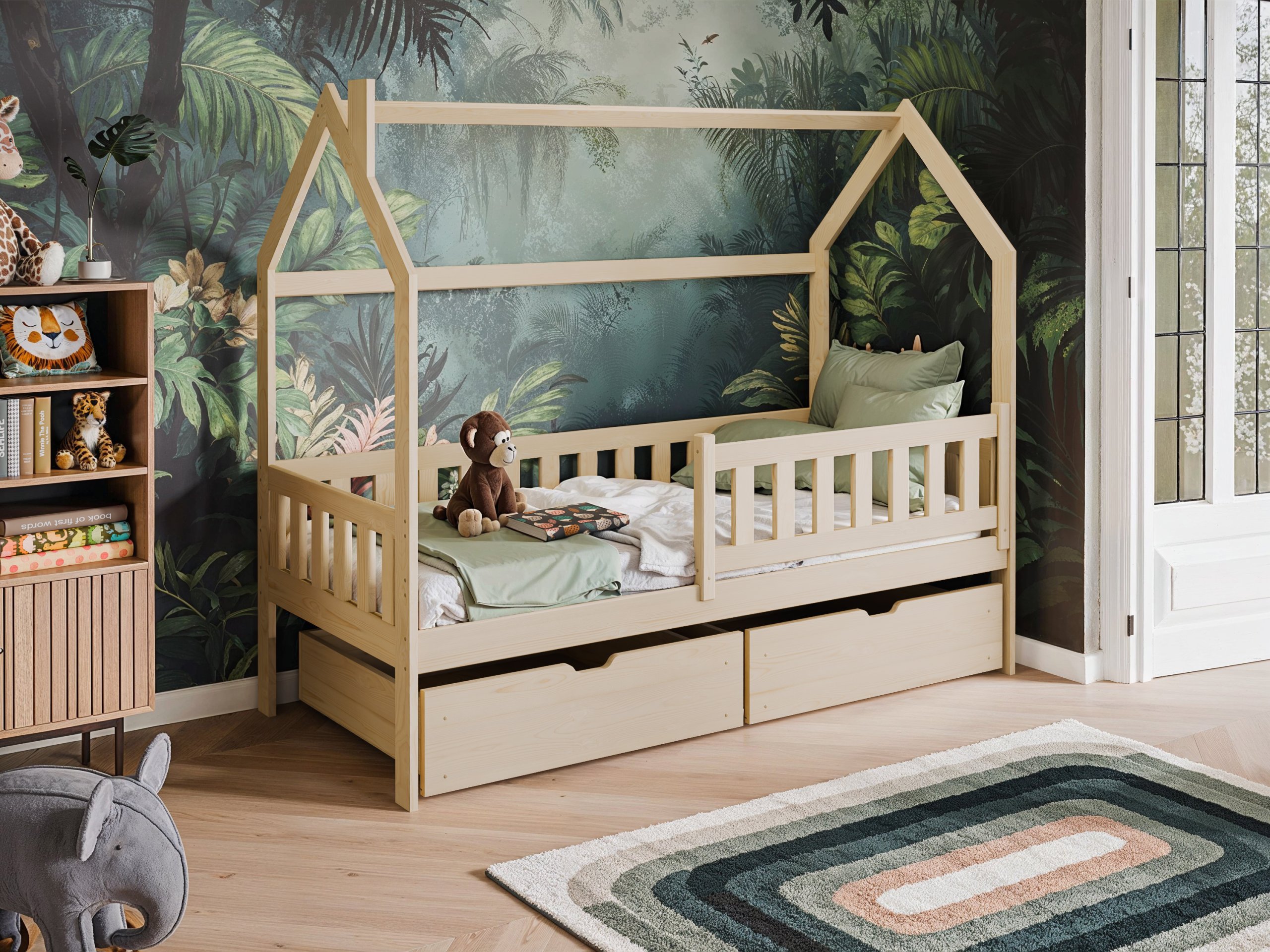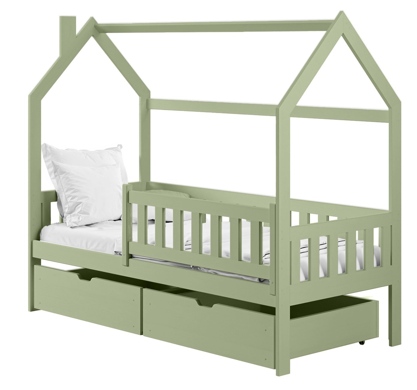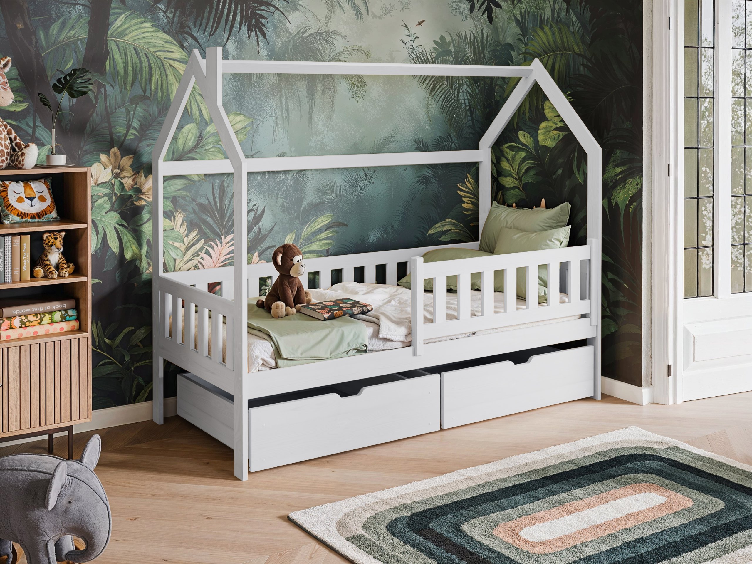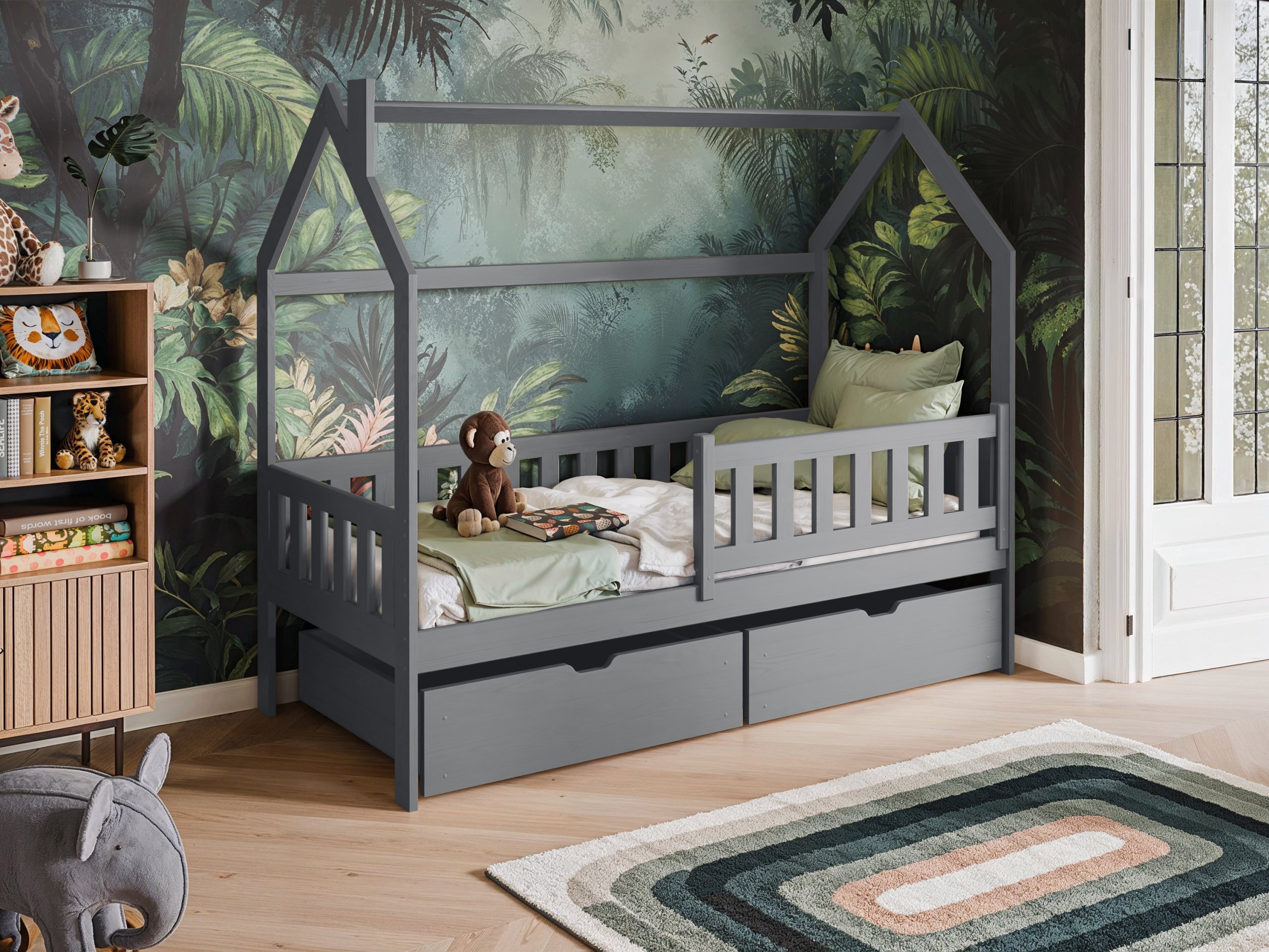 Kućasti oblik okvira daje krevetu karakter koji dječju sobu pretvara u bajkovit prostor. Djeca ga mogu ukrasiti svjetlima, girlandama ili tkaninama i tako stvoriti svoj mali dom unutar sobe. Odabirom boje možete naglasiti prirodan izgled drva ili stvoriti neutralno, suvremeno okruženje. Bijela boja donosi svjetlost i prozračnost, nijansa bora naglašava prirodnu strukturu drva, dok grafit, siva, kašmir i maslina dodaju moderan dodir.