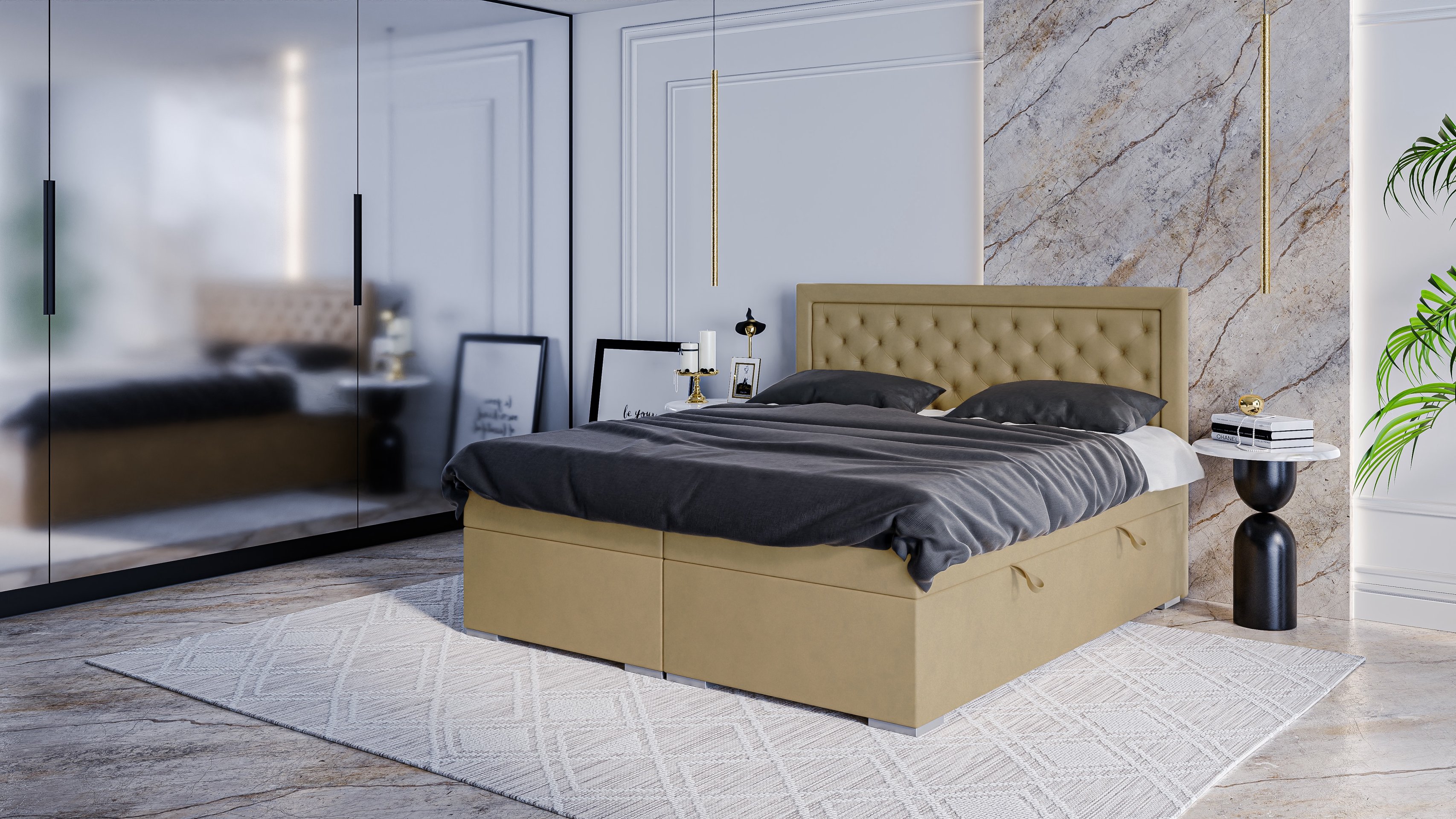 Veliki kraljevski krevet s dekorativnim uzglavljem i boxspring osnovom.