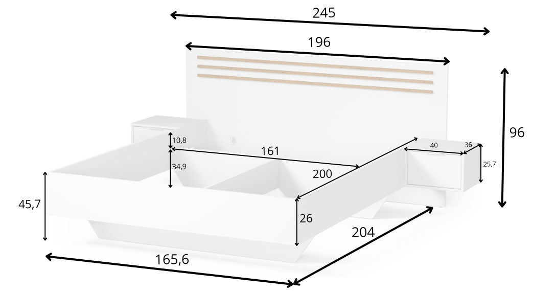 Dimenzije 204,4 x 265,2 x 95,2 cm osiguravaju prostrano ležište 180x200 cm, prikladno za udoban san dviju osoba. S priloženim noćnim ormarićima imat ćete sve što vam treba uvijek pri ruci – od knjiga i naočala do noćne svjetiljke ili čaše vode. Za još veću praktičnost dostupna je i mogućnost dokupa ladice koja se diskretno skriva ispod kreveta i nudi dodatni prostor za pohranu posteljine ili drugih predmeta.