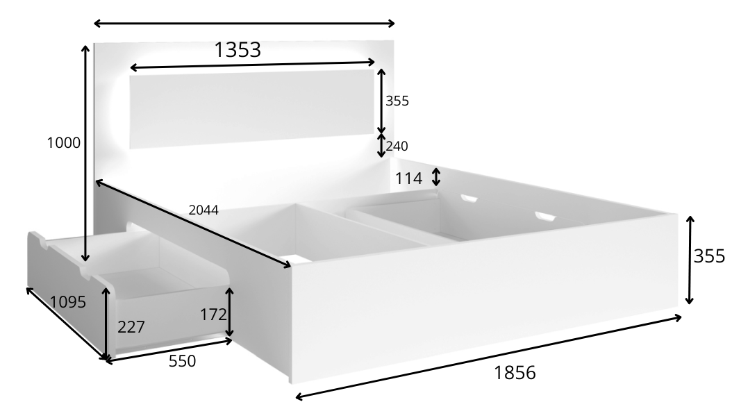 Dimenzije kreveta iznose 187x204,4x100 cm, što omogućuje prostrano ležište veličine 180x200 cm. Zbog svojih dimenzija pogodan je i za parove i za pojedince koji žele više slobode i udobnosti tijekom spavanja. Iako ležište i podnica nisu uključeni, to omogućuje da odaberete upravo onakvo ležište koje najbolje odgovara vašim potrebama i željama.