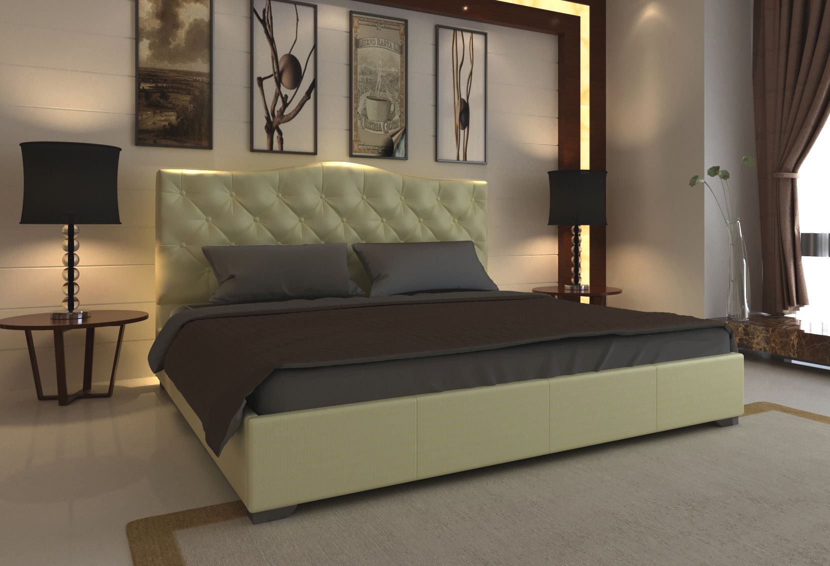 Uzglavlje i konstrukcija su napravljeni iz iverice s ispunom PU pjene, tapecirano tkaninom ili umjetnom kožom (kvaliteta i izgled umjetne kože dostojno zamjenjuju pravu kožu). Uzglavlje nudi maksimalan komfort, udobnost i trajnost (visina uzglavlja - 119 cm).