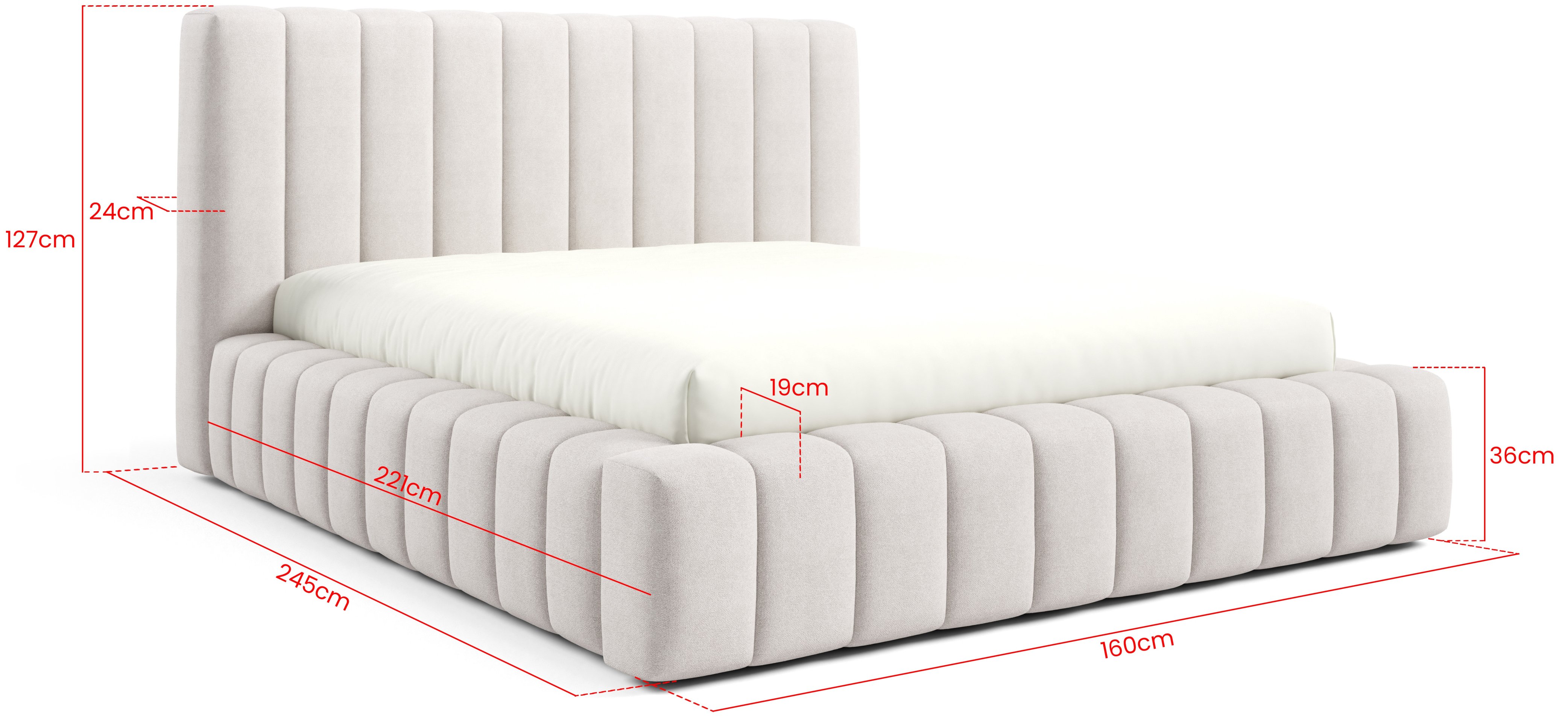 Ukupne dimenzije kreveta iznose 245x127 cm, pri čemu visina uzglavlja mjeri 127 cm, visina bočnice 36 cm, debljina bočnice 19 cm, debljina uzglavlja 24 cm, a visina nožica 1 cm (klizači). Dostupan je u različitim širinama ležajne površine: 120 pri duljini 200 cm. Korisnik može birati između različitih kombinacija boja i vrsta tkanina, što omogućuje potpunu prilagodbu unutarnjem stilu spavaće sobe.