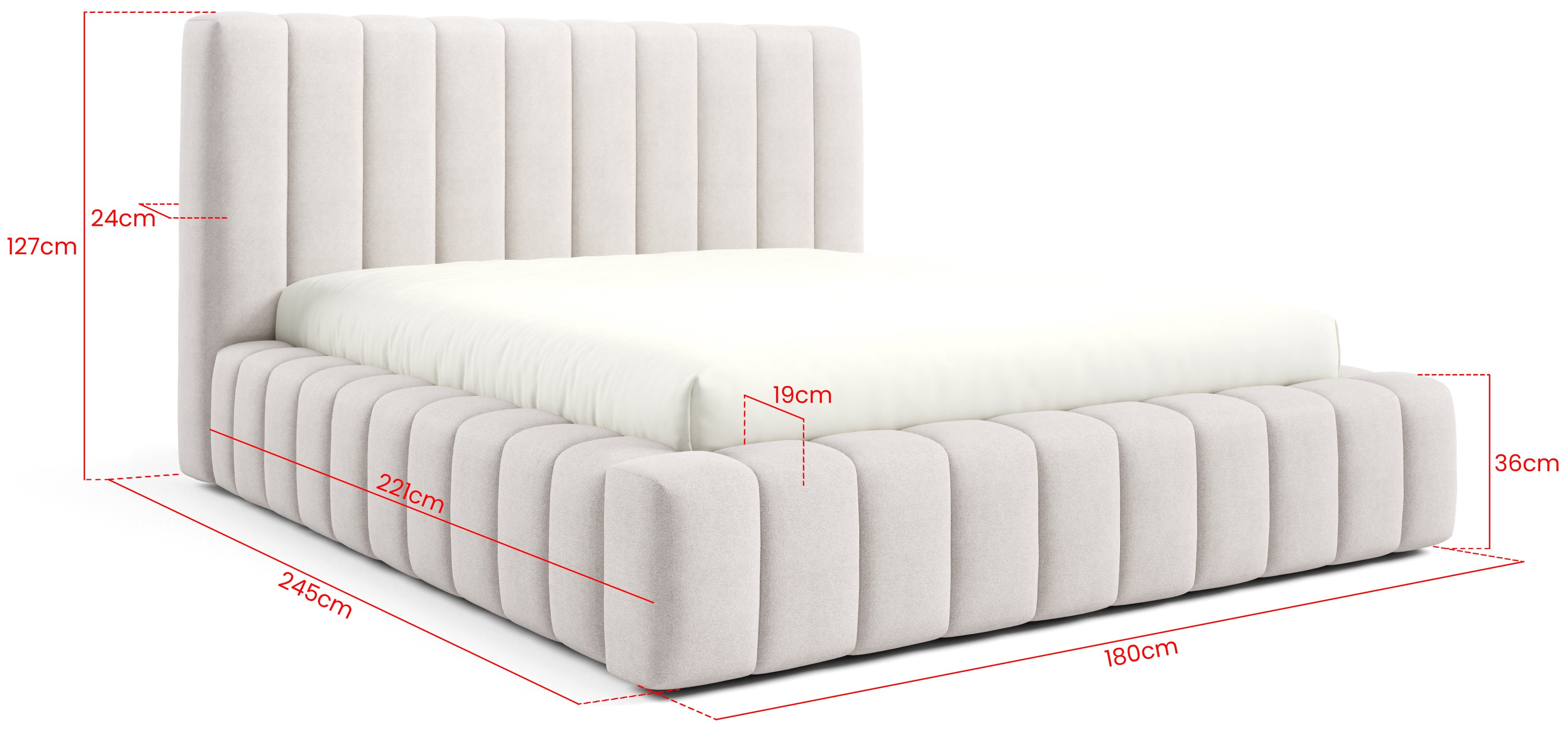 Ukupne dimenzije kreveta iznose 245x127 cm, pri čemu je visina uzglavlja 127 cm, visina bočnice 36 cm, debljina bočnice 19 cm, debljina uzglavlja 24 cm, a visina nožica 1 cm (klizači). Dostupan je u različitim širinama ležajne površine: 140 pri duljini 200 cm. Korisnik može birati između različitih kombinacija boja i vrsta tkanina, što omogućuje potpunu prilagodbu unutarnjem stilu spavaće sobe.