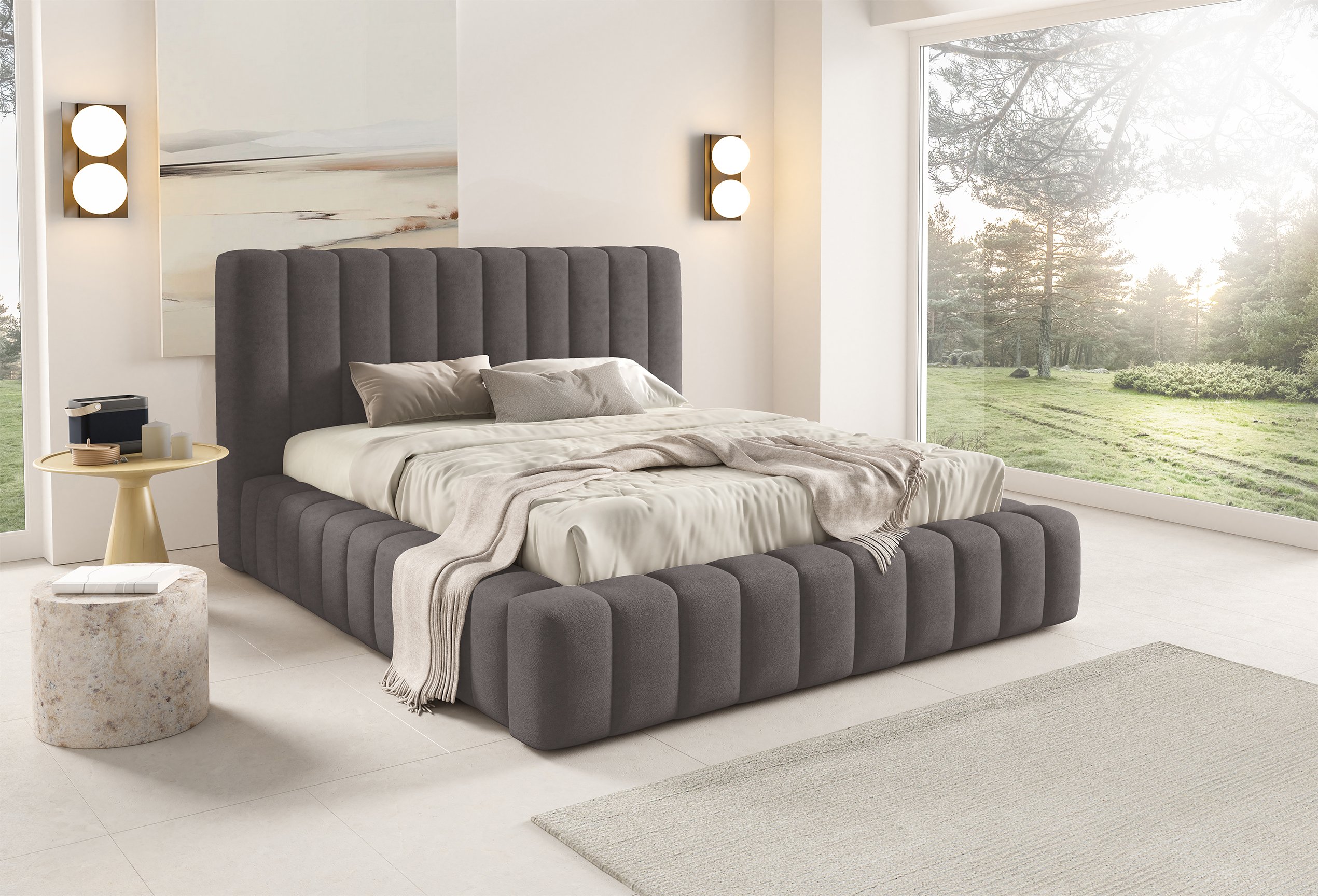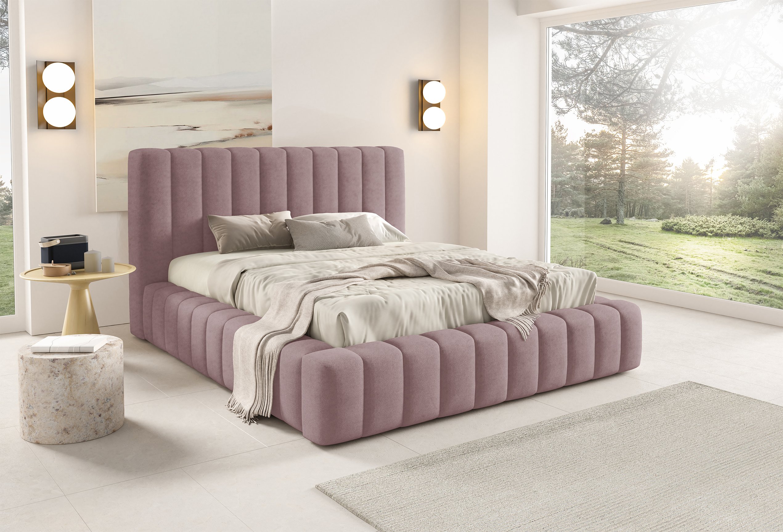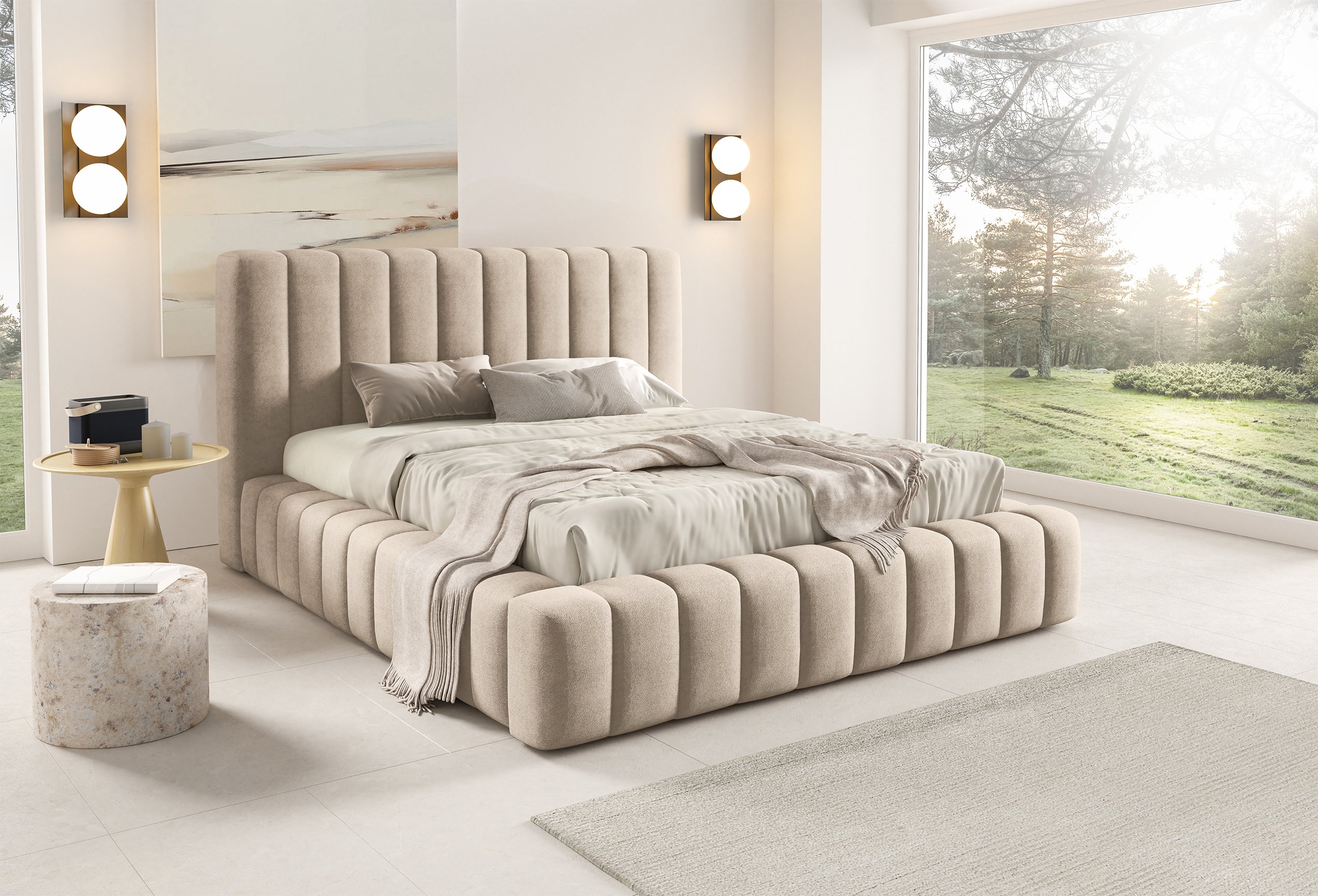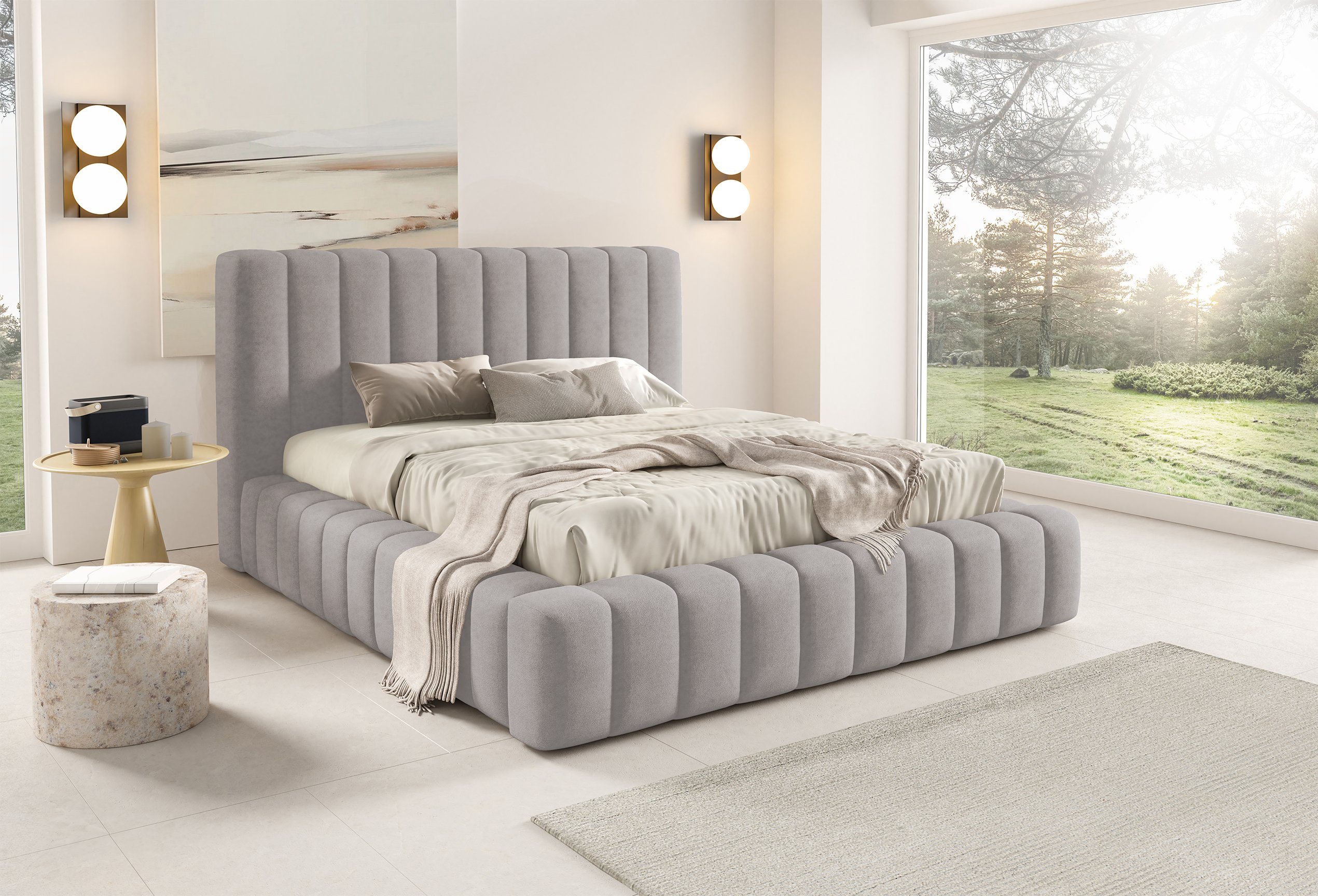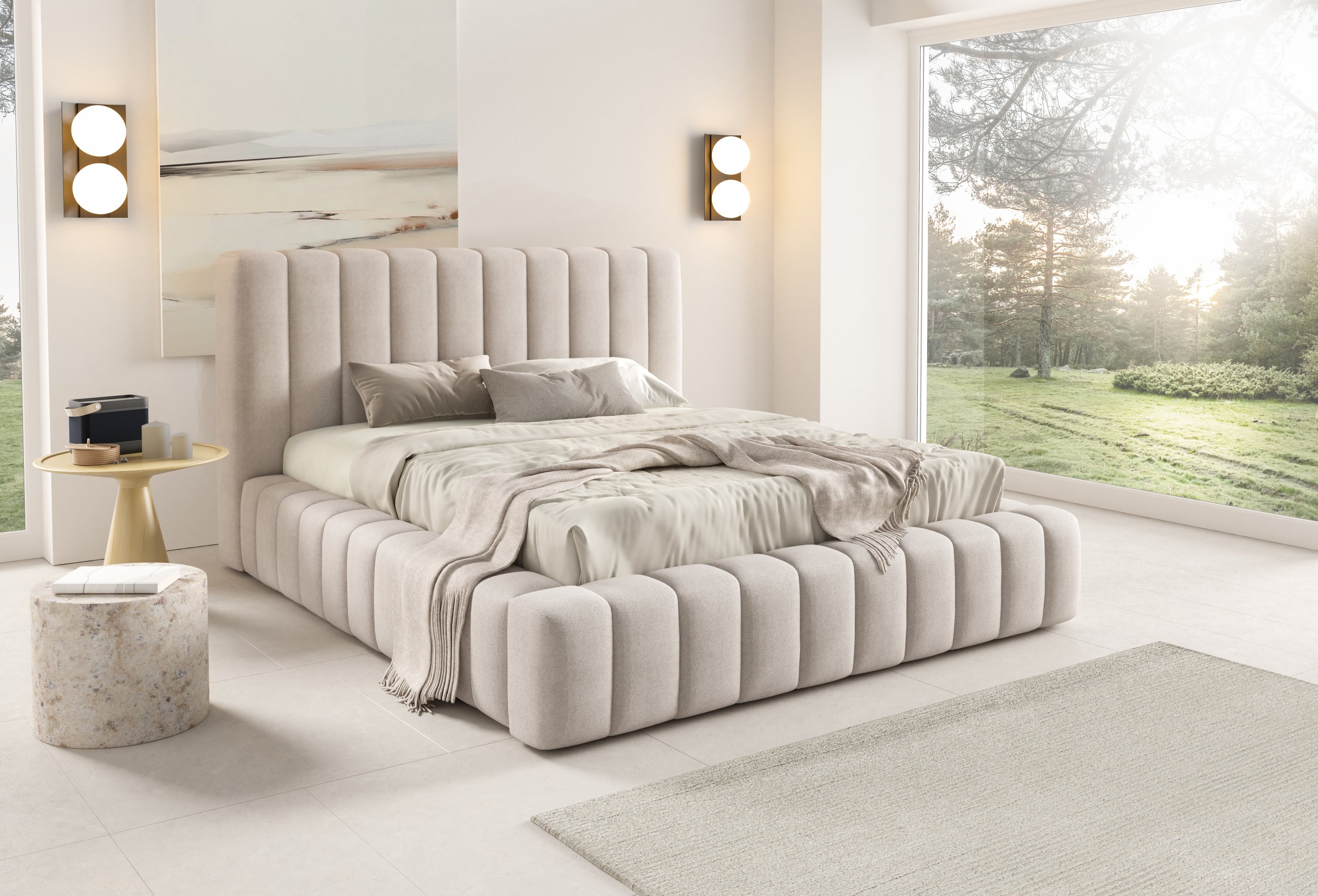 Krevet je presvučen mekom tkaninom koja daje ugodan osjećaj i dodaje toplinu prostoru. Na prezentacijskoj fotografiji korištena je tkanina Velluto 01, koja se odlikuje baršunastom teksturom i bogatim izgledom. Kombinacija tkanine i masivnog drva u konstrukciji osigurava stabilnost i dug vijek trajanja. Drveni elementi zadržavaju prirodnu čvrstoću, dok tekstilni dijelovi osiguravaju udobnost i estetski dojam.