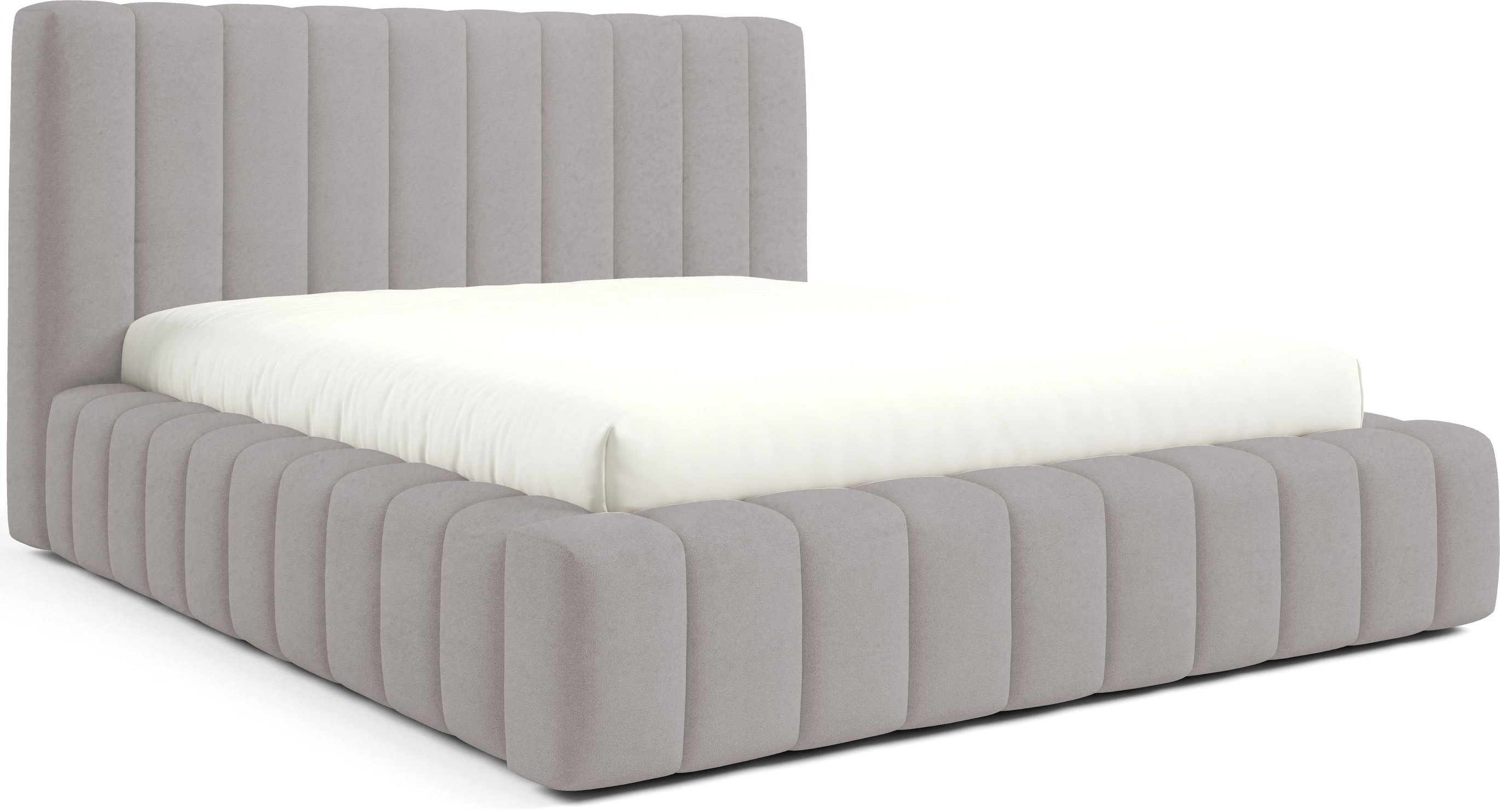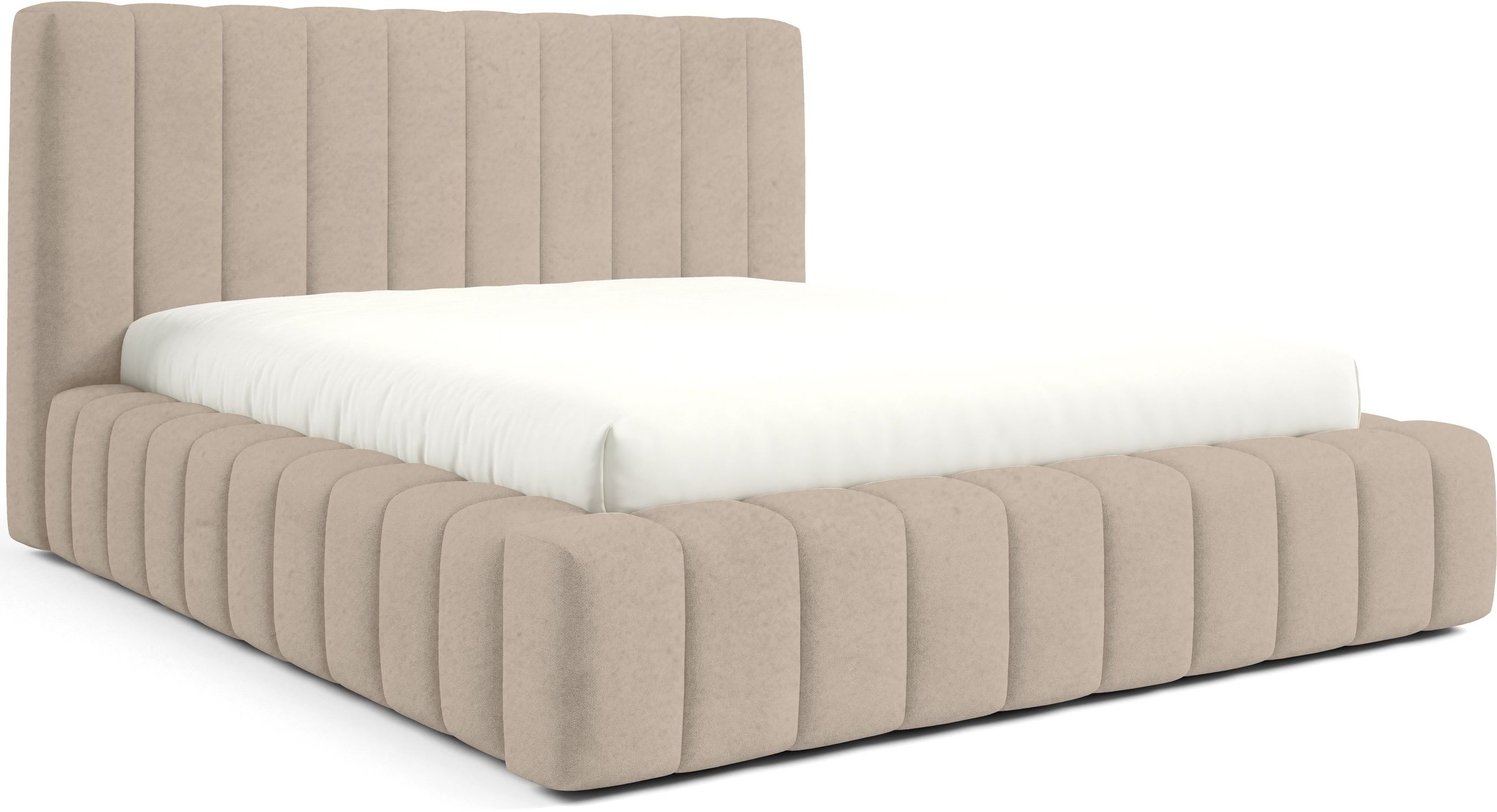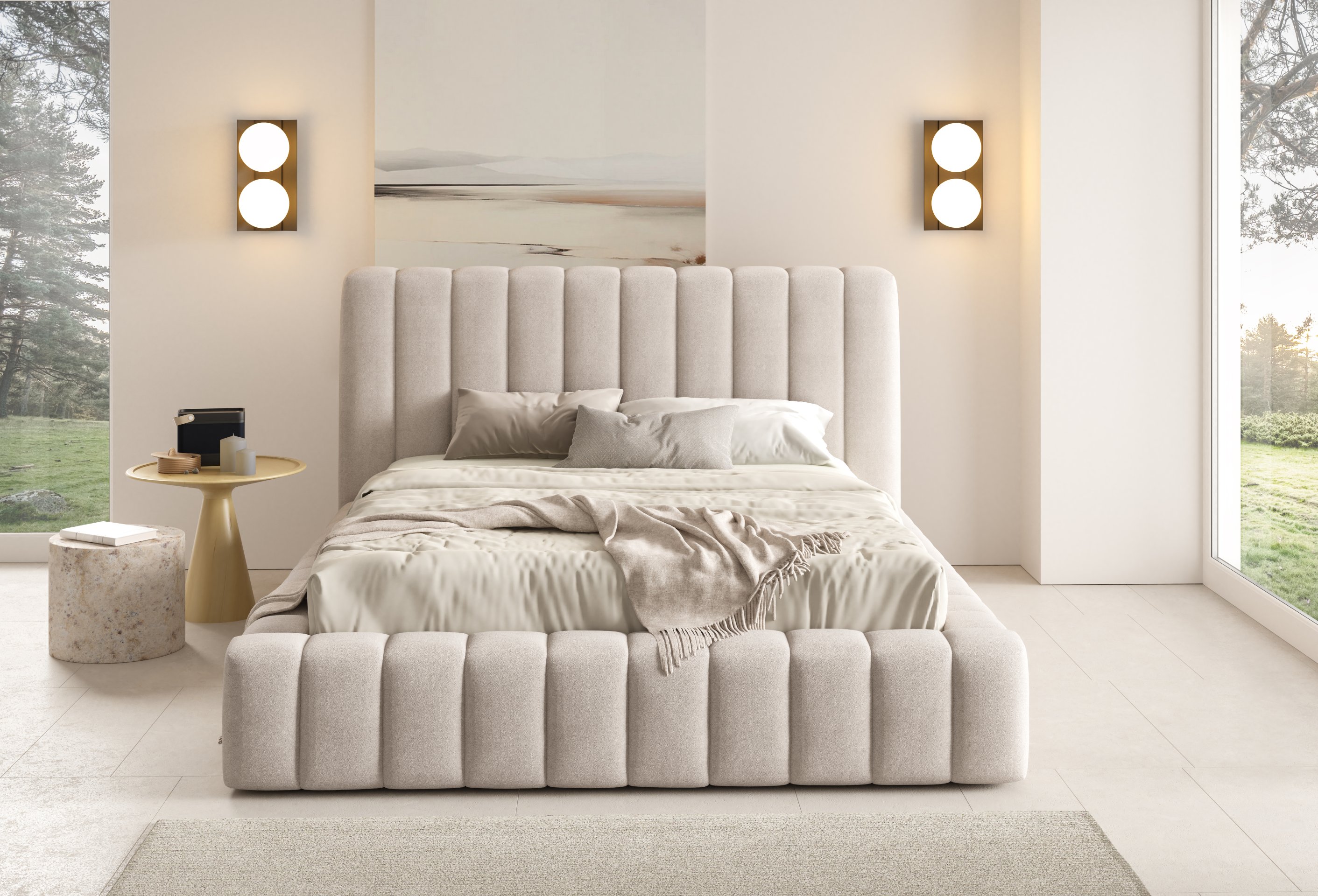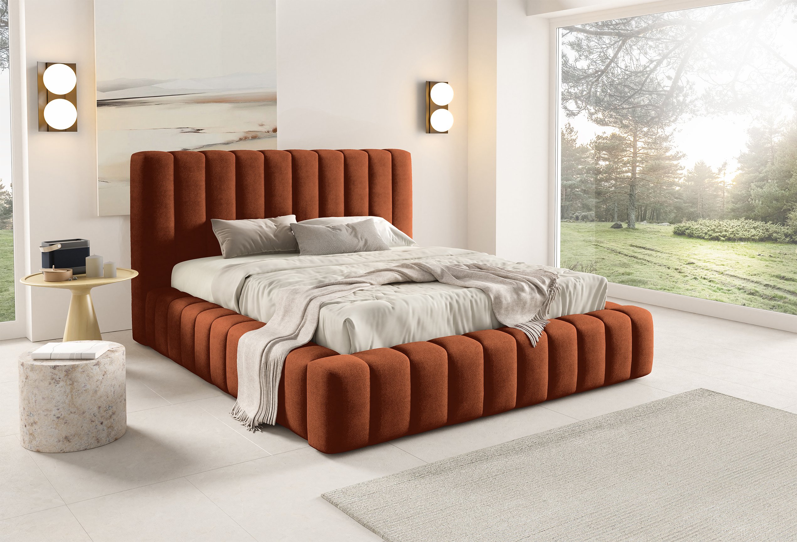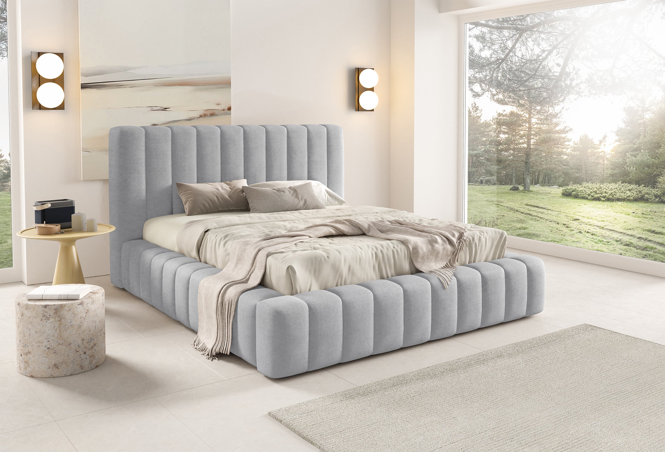 Krevet je presvučen mekom tkaninom koja daje ugodan osjećaj i dodaje toplinu prostoru. Na prezentacijskoj fotografiji korištena je tkanina Velluto 01, koja se odlikuje baršunastom teksturom i bogatim izgledom. Kombinacija tkanine i masivnog drva u konstrukciji osigurava stabilnost i dug vijek trajanja. Drveni elementi zadržavaju prirodnu čvrstoću, dok tekstilni dijelovi osiguravaju udobnost i estetski dojam.