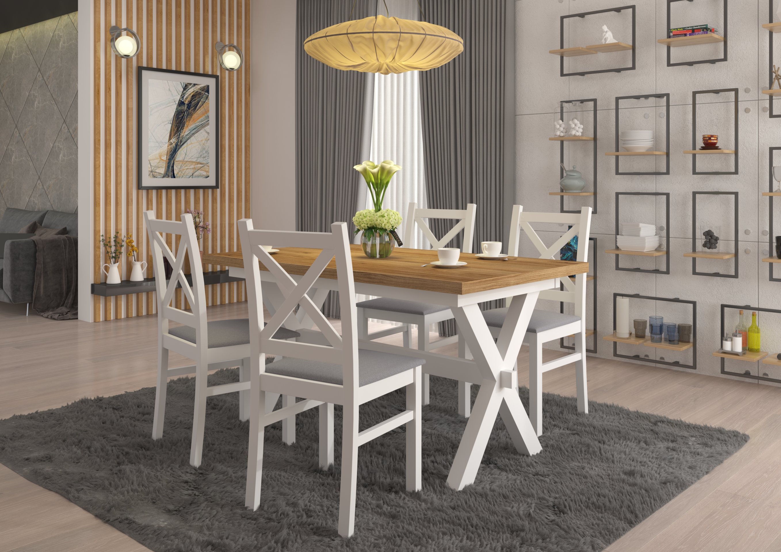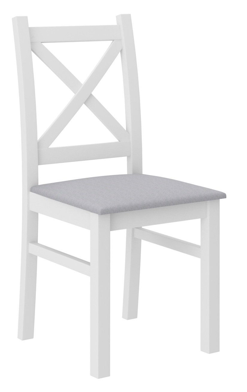Stolica je izrađena od kvalitetnog MDF okvira, koji osigurava izvrsnu stabilnost i izdržljivost čak i pri svakodnevnoj upotrebi. Mekano tapecirano sjedalo i naslon presvučeni su ugodnom tkaninom koja pruža iznimnu udobnost i odlikuje se dugim vijekom trajanja. Kombinacija bijele i sive boje stvara harmoničan izgled koji se lako uklapa s različitim paletama boja prostora – od svijetlih skandinavskih kuhinja do klasičnih blagovaonica u toplim tonovima drva.