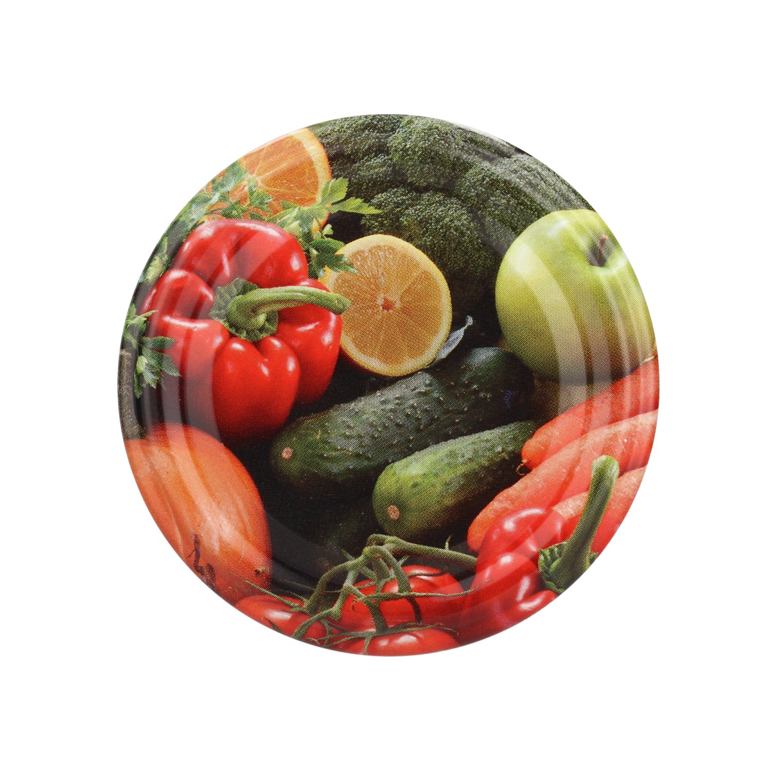 Poklopci su izrađeni od kvalitetnog metala s zaštitnim premazom koji sprječava hrđanje te omogućuje višekratnu upotrebu ako se pravilno očiste i pohrane. Površina poklopaca je obojena tiskom s motivima povrća i voća, što staklenkama daje privlačan, domaći izgled i olakšava prepoznavanje sadržaja. Precizno oblikovan navoj fi82 savršeno pristaje standardnim staklenkama, što osigurava nepropusno zatvaranje bez opasnosti da se poklopac tijekom sterilizacije odvrne ili olabavi.