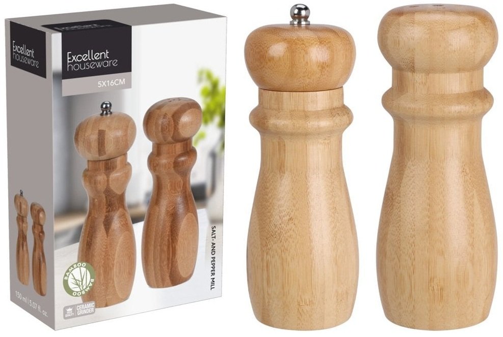 Komplet uključuje dva odvojena mlinca – jedan za papar i drugi za sol. Njihov dizajn omogućuje jednostavno punjenje i podešavanje stupnja mljevenja. Bambusov poklopac sprječava prodor vlage te održava svježinu začina, a ujedno štiti mehanizam od trošenja. Iako dimenzije proizvoda nisu posebno navedene, komplet je dizajniran tako da se udobno uklapa u ruku i može se bez poteškoća koristiti pri svakodnevnom kuhanju ili posluživanju hrane.