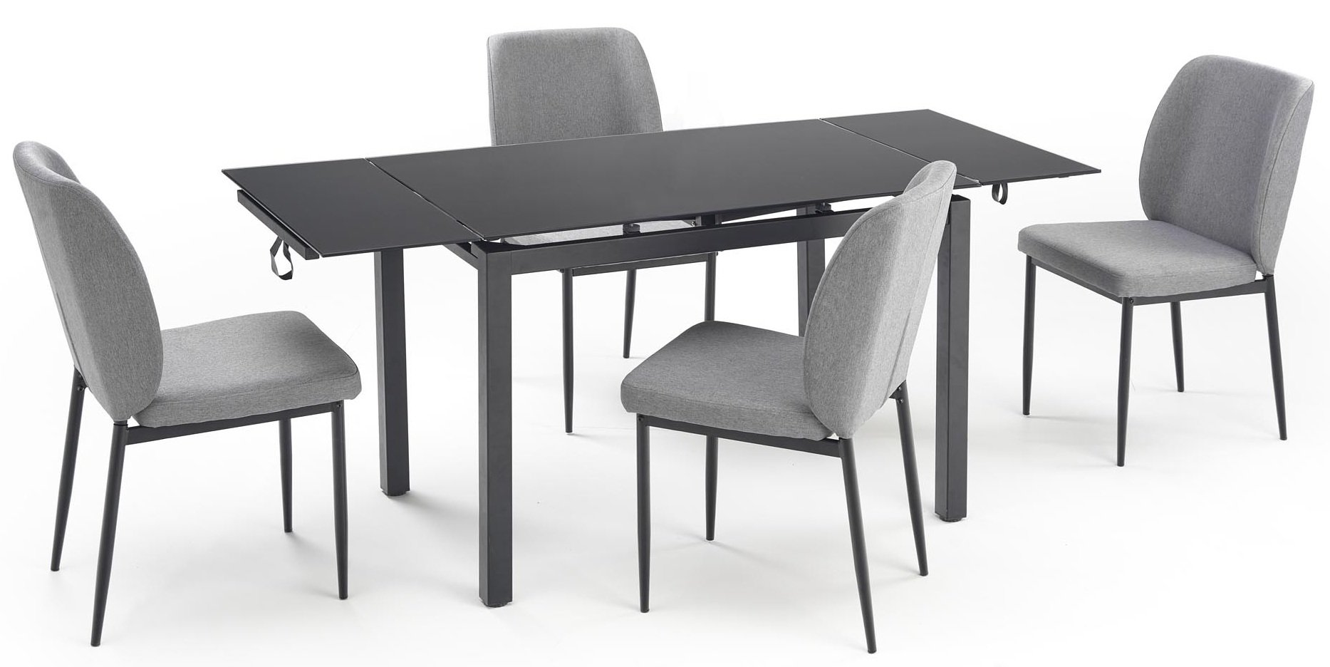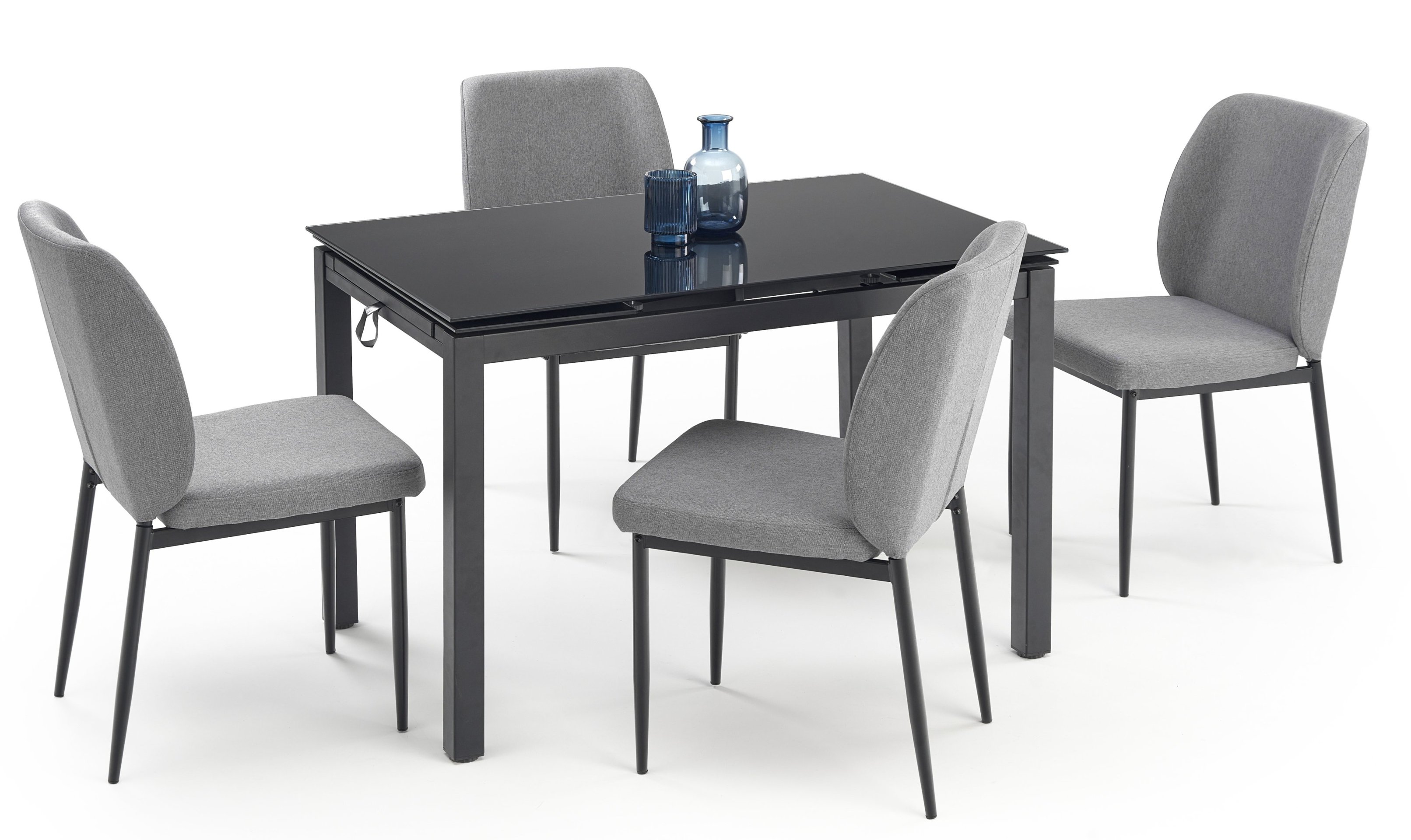Set za blagovaonicu Jasper tvrtke Halmar spaja moderan dizajn, kvalitetne materijale i promišljenu funkcionalnost. Ovaj set je namijenjen svima koji cijene estetiku, izdržljivost i praktičnost u jednom proizvodu. Kombinacijom stakla i prašno lakiranog čelika u crno-sivoj boji stvara elegantan izgled koji se lijepo uklapa i u moderne i u klasične interijere. Idealan je za manje prostore gdje je važna prilagodljivost, jer nudi mogućnost razvlačenja stola i udobno sjedenje za četiri osobe.