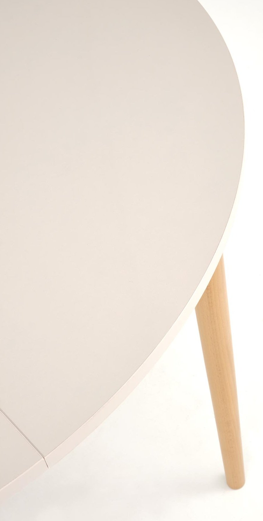 Kombinacija boja u nijansi kašmira na ploči i prirodne boje na nogama stvara elegantan kontrast koji se lijepo uklapa u različite palete boja – od svijetlih skandinavskih interijera do toplijih klasičnih ambijenata. Površina laminirane ploče ugodno je glatka, a istovremeno dovoljno otporna da podnese svakodnevnu uporabu bez vidljivih tragova.
