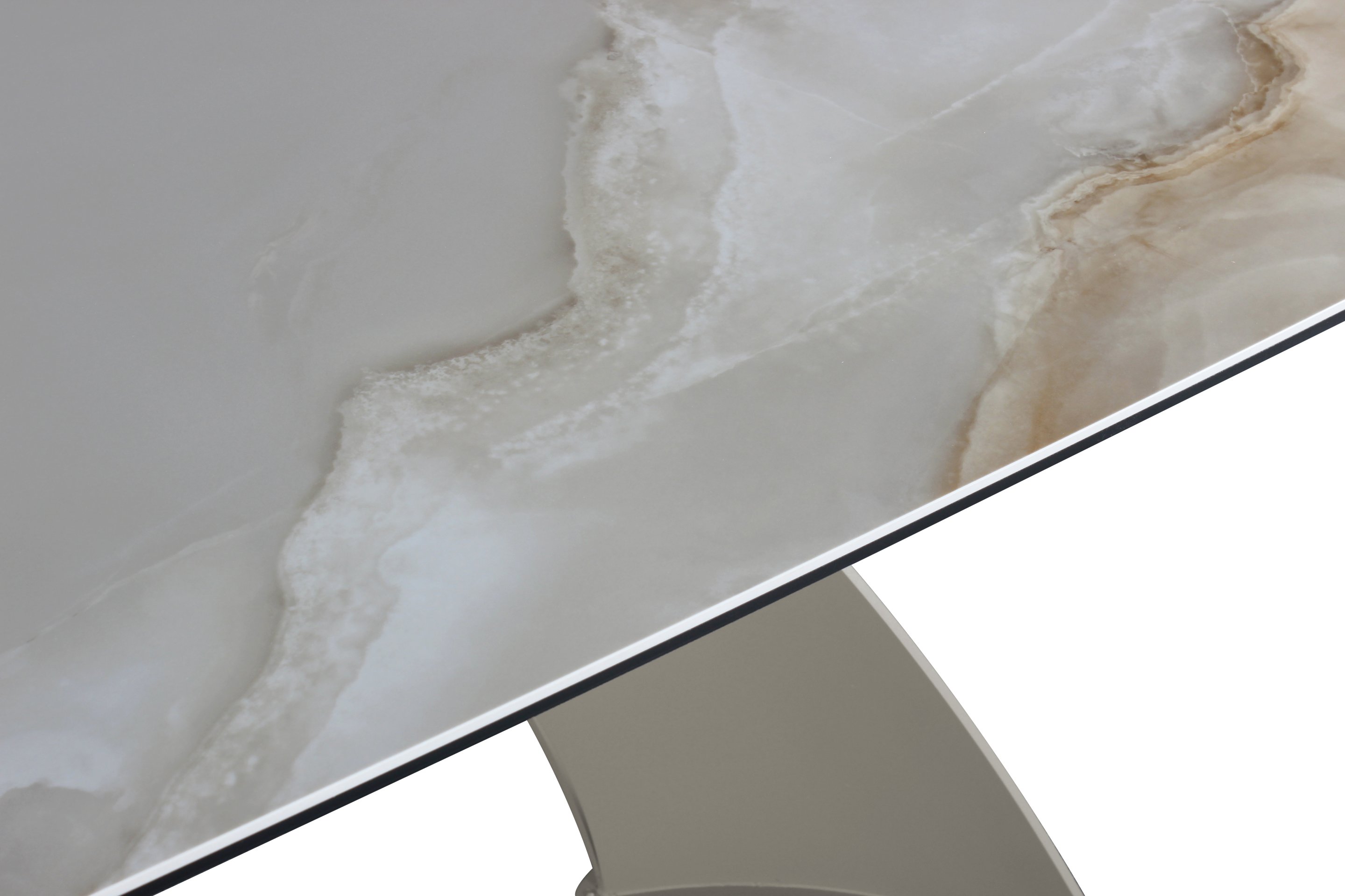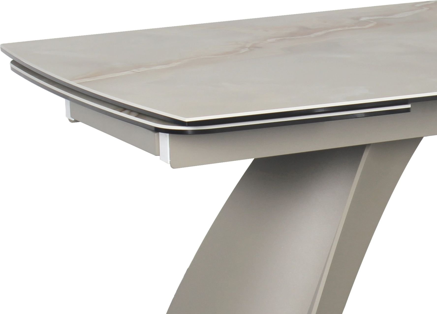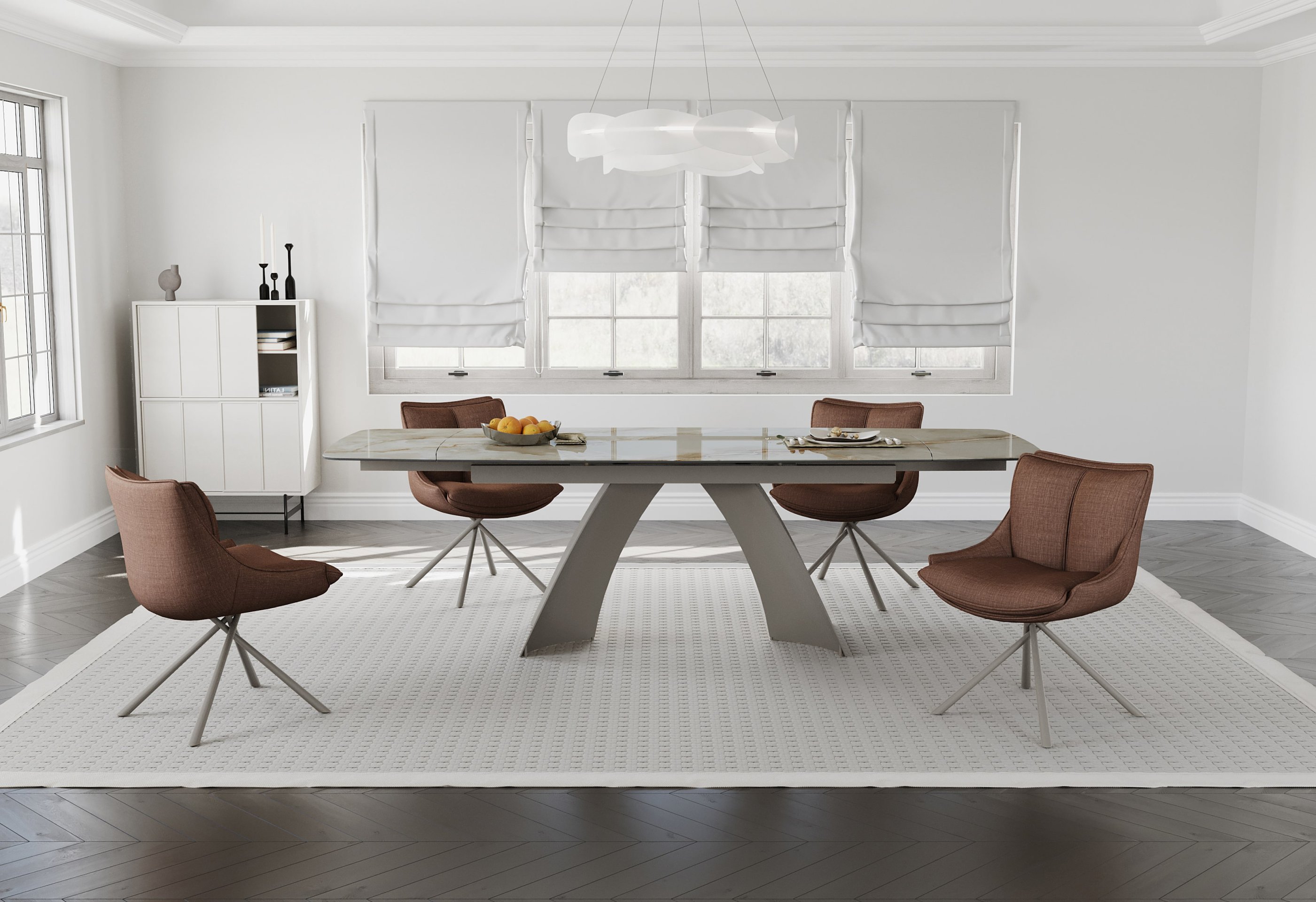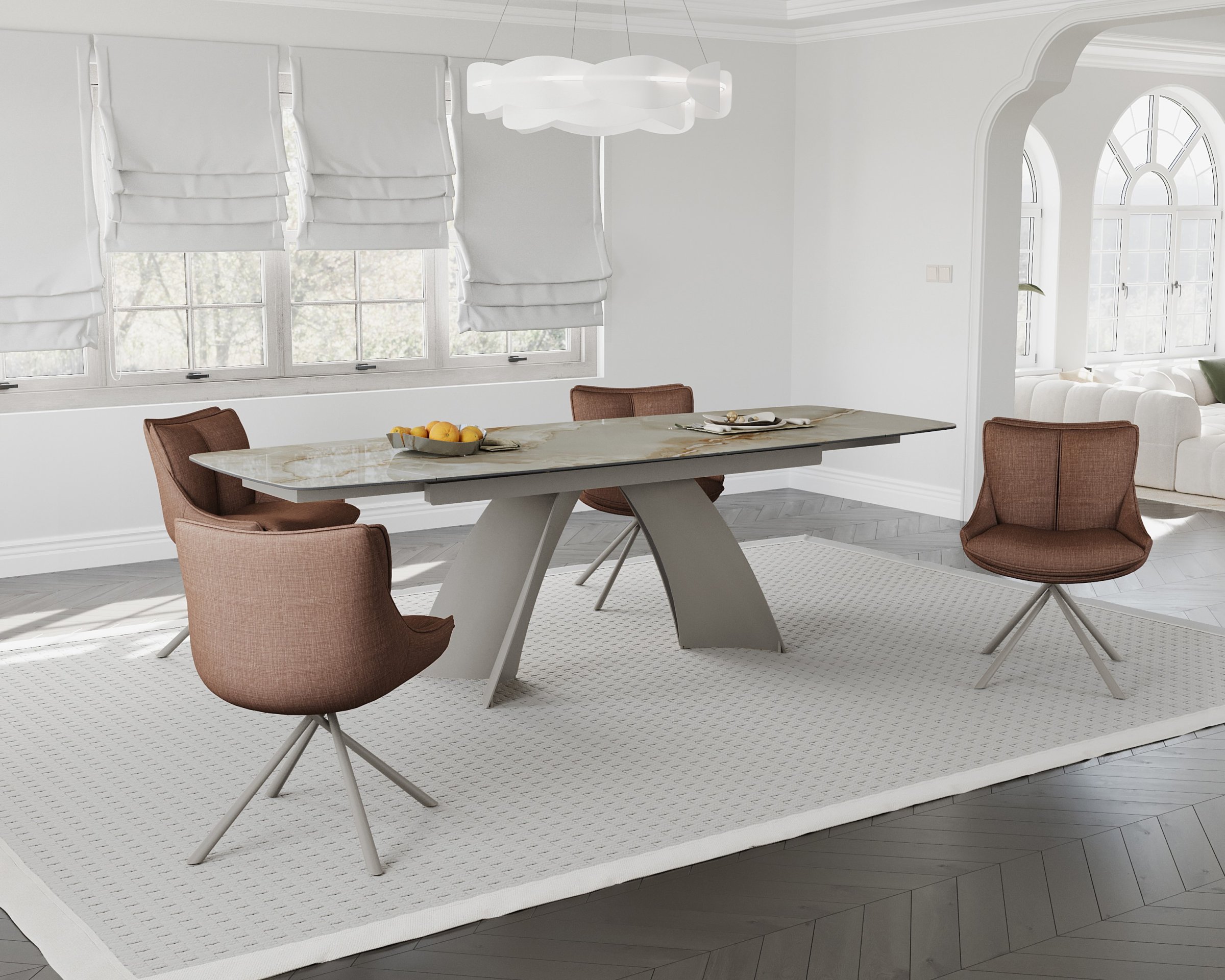 Ploča stola sastoji se od kombinacije keramike i kaljenog stakla, što stvara izdržljivu, elegantnu i lako održivu površinu. Gornji sloj od keramike s izgledom smeđeg mramora donosi dojam prirodnog kamena s bogatom teksturom i dubinom, dok donji stakleni sloj osigurava stabilnost i dodatnu otpornost na udarce. Ta hibridna konstrukcija smanjuje toplinsko širenje, održava dimenzijsku stabilnost i omogućuje jednostavno čišćenje površine. Kombinacija boja smeđeg mramora i neutralnog sivog postolja stvara uravnotežen i suvremen izgled, prikladan za različite interijerske stilove – od minimalističkog do industrijskog.