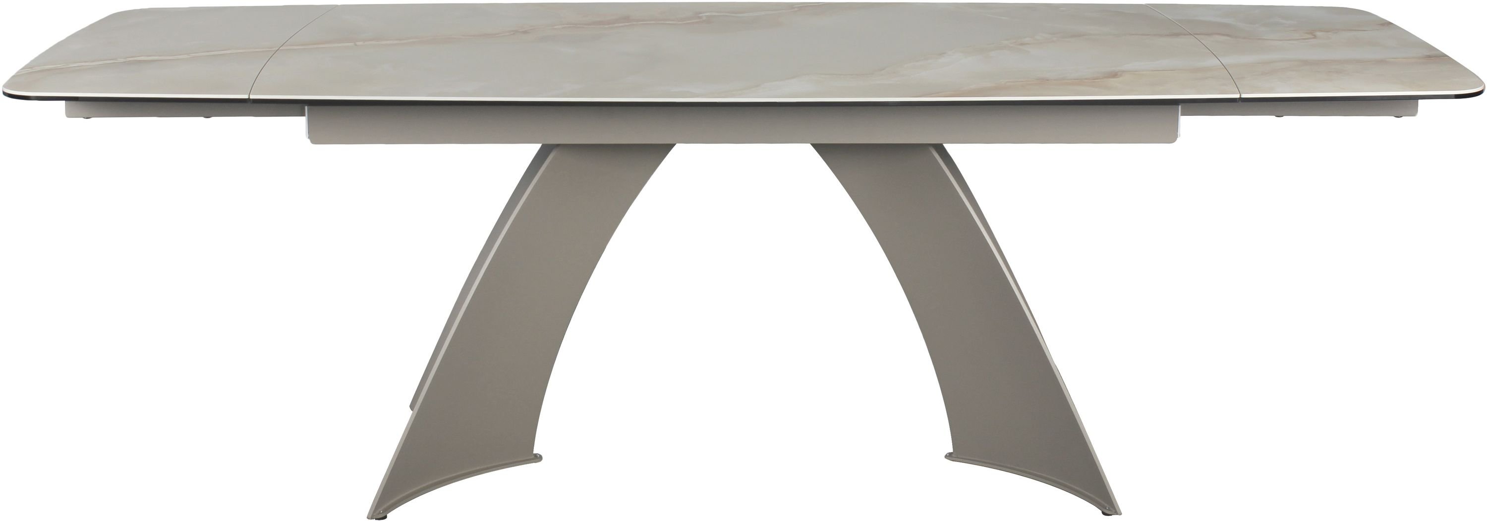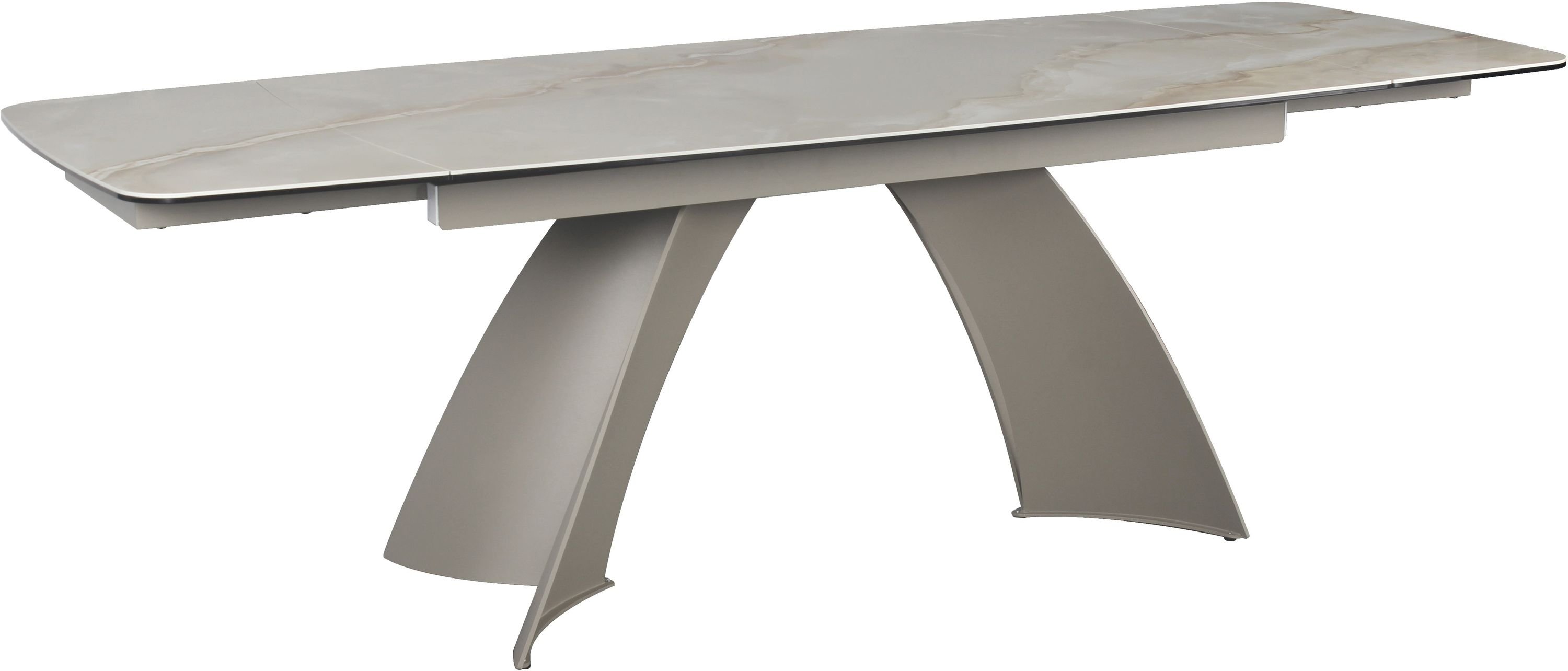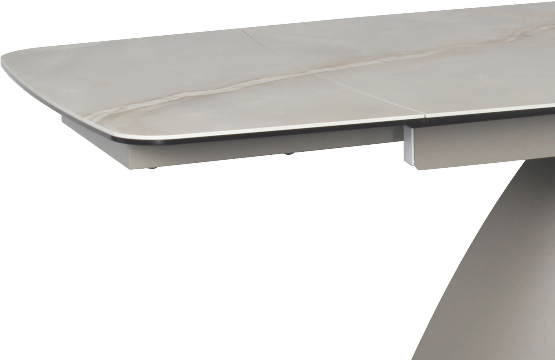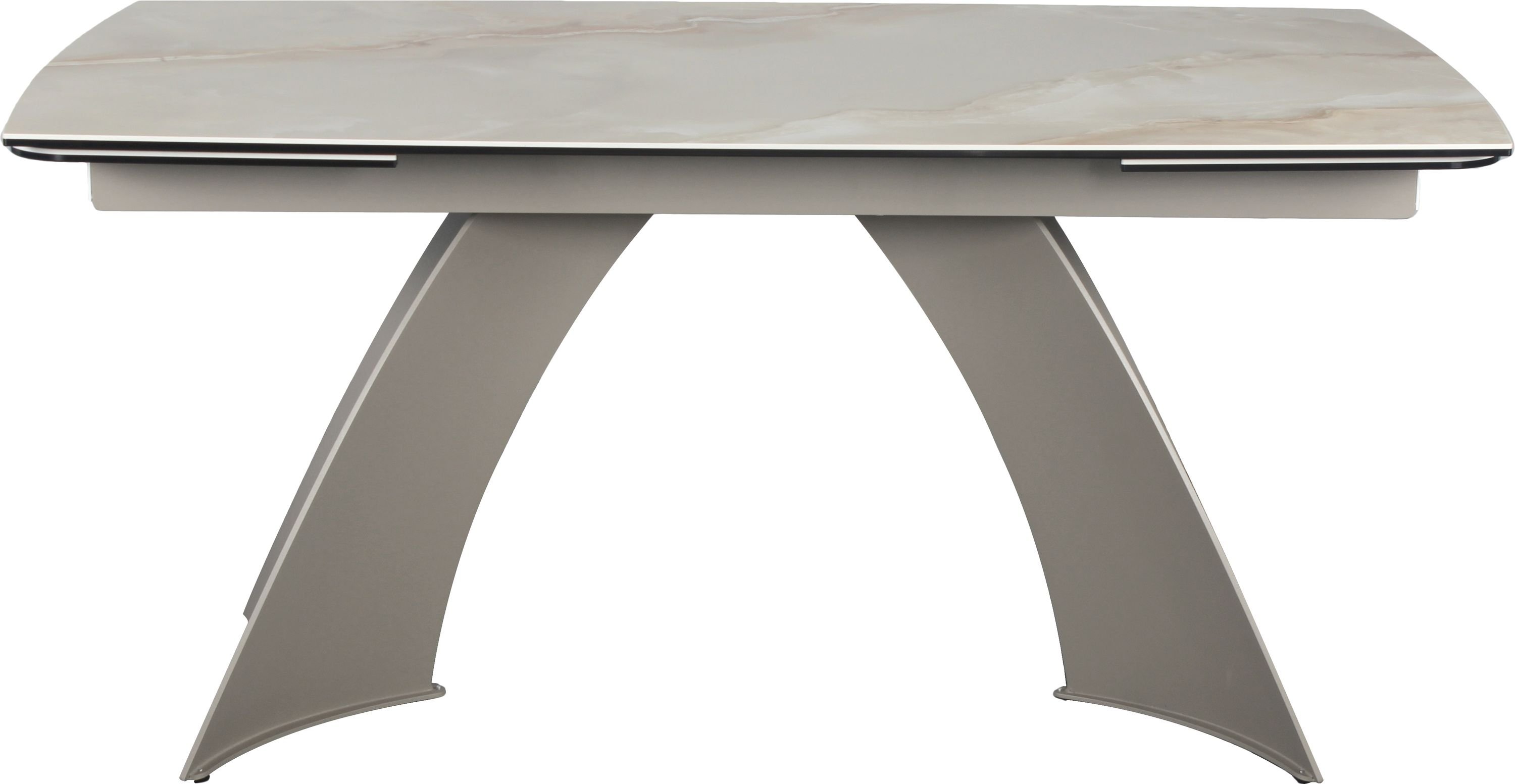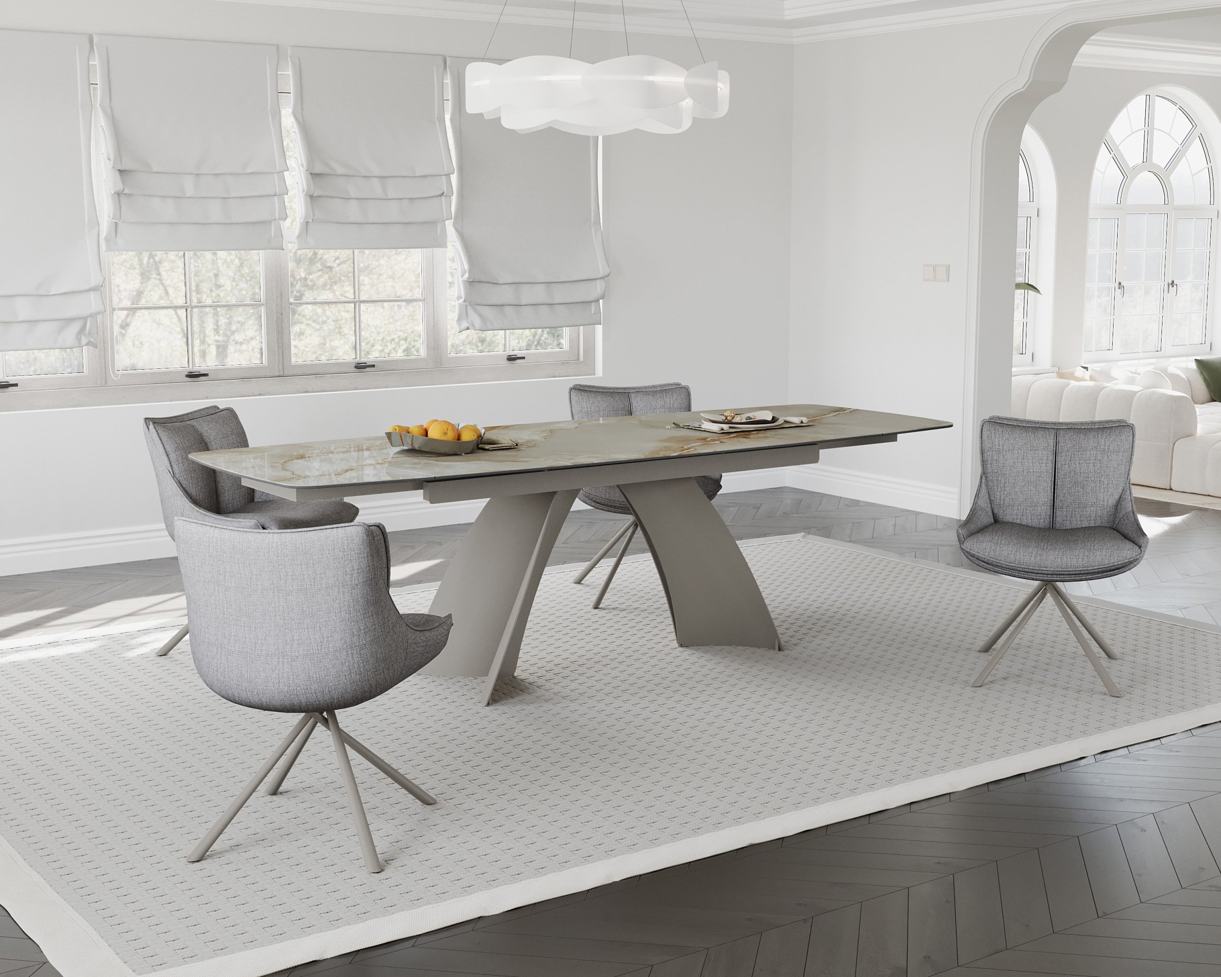 Ploča stola sastoji se od kombinacije keramike i kaljenog stakla, što stvara izdržljivu, elegantnu i lako održivu površinu. Gornji sloj od keramike s izgledom smeđeg mramora donosi dojam prirodnog kamena s bogatom teksturom i dubinom, dok donji stakleni sloj osigurava stabilnost i dodatnu otpornost na udarce. Ta hibridna konstrukcija smanjuje toplinsko širenje, održava dimenzijsku stabilnost i omogućuje jednostavno čišćenje površine. Kombinacija boja smeđeg mramora i neutralnog sivog postolja stvara uravnotežen i suvremen izgled, prikladan za različite interijerske stilove – od minimalističkog do industrijskog.