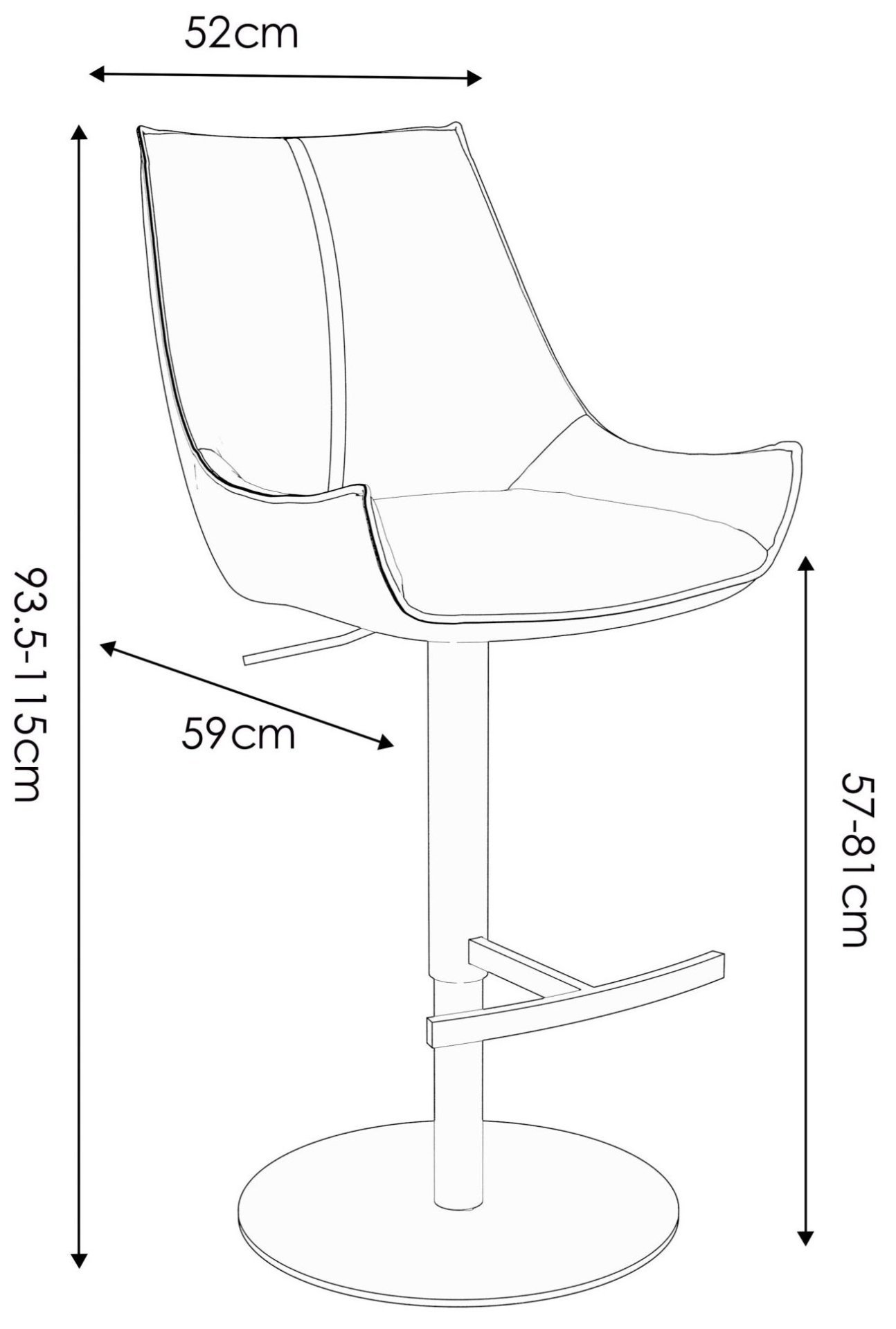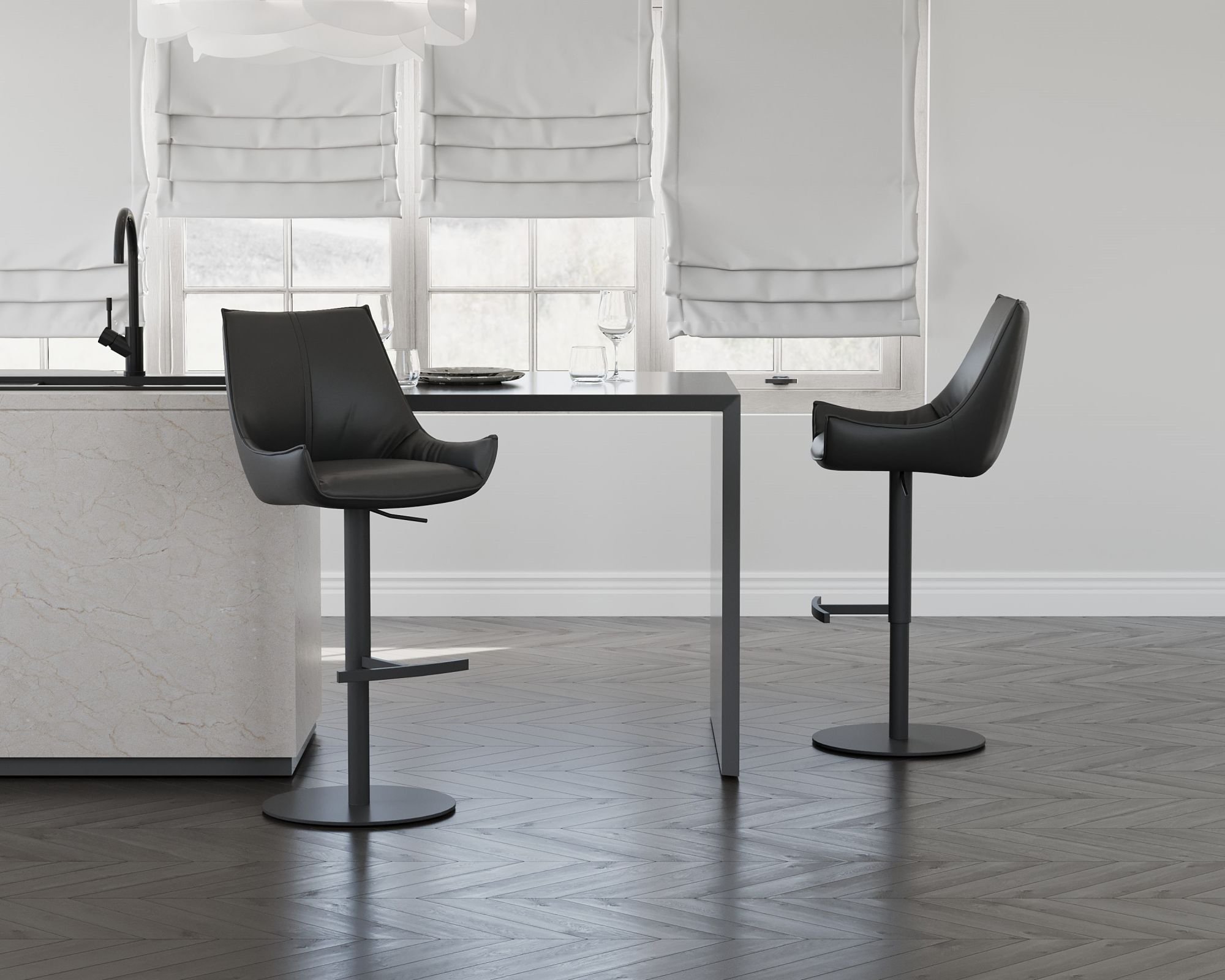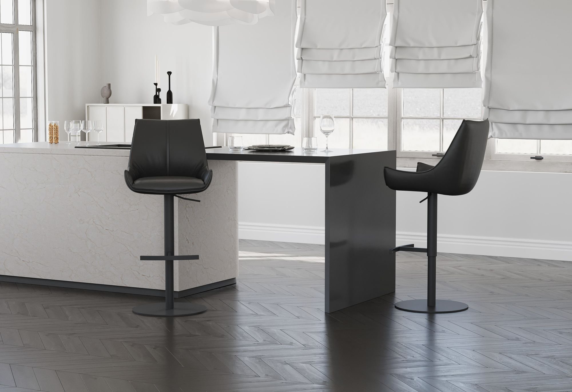 Praktična barska stolica, dostupna u potpuno crnoj boji. Stolica se može slobodno okretati i podesiva je po visini, s plinskim dizalom u glavnom stupu. Sjedalo i naslon stolice presvučeni su goveđom kožom koja pruža visoku otpornost na mrlje te jednostavno održavanje.
