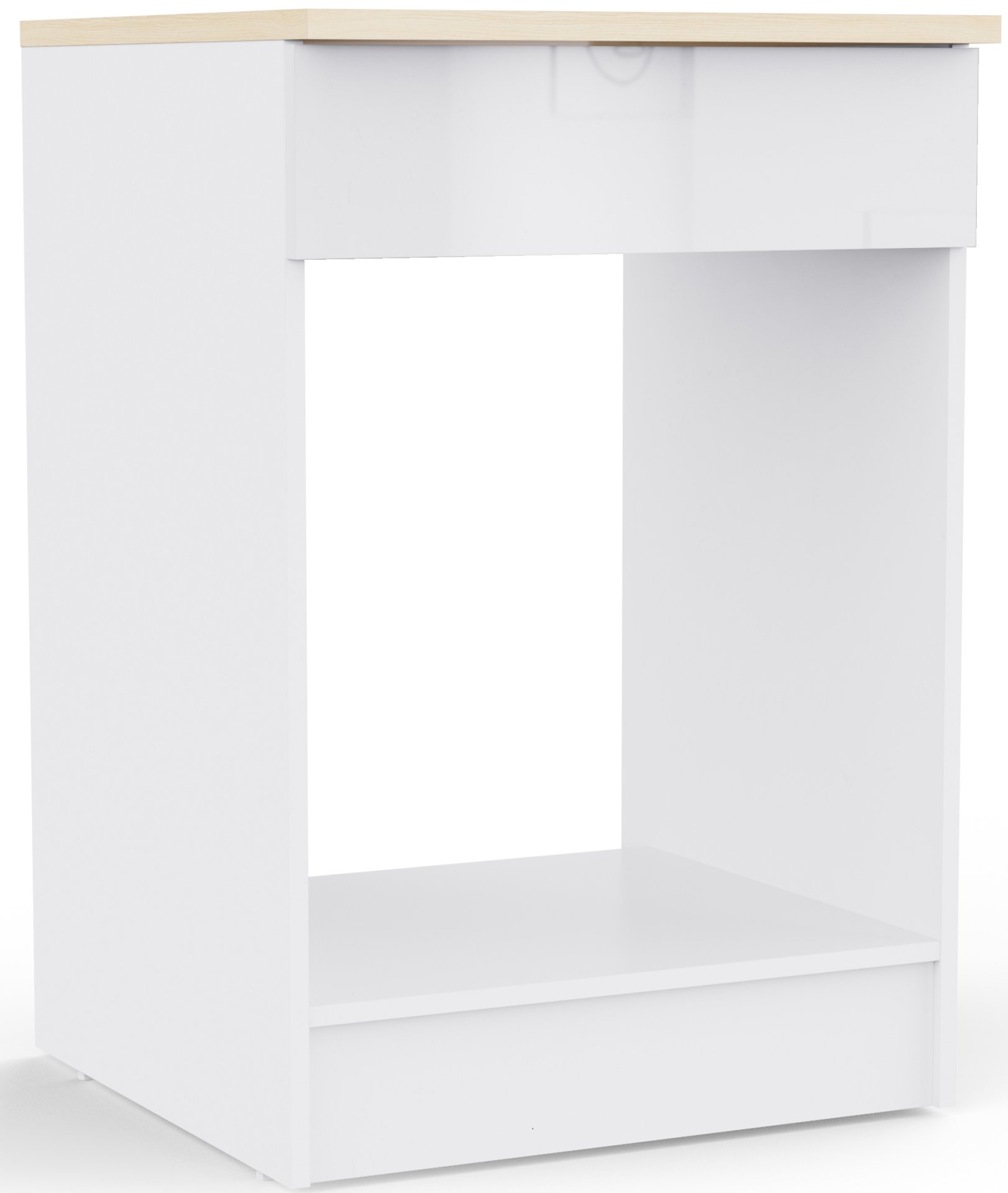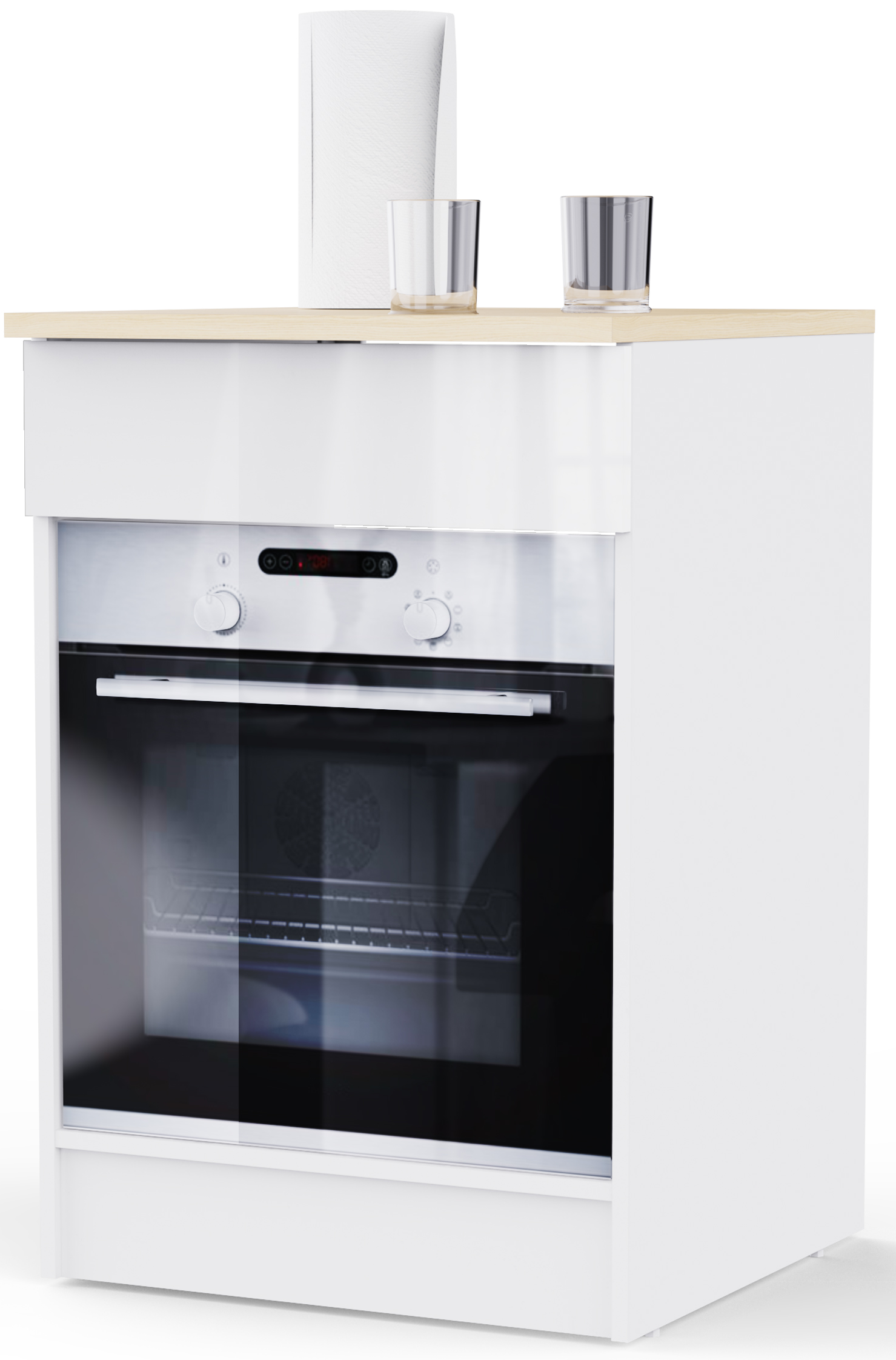 U središnjem dijelu ormarića nalazi se otvorena niša namijenjena ugradnji standardne pećnice. Konstrukcija omogućuje sigurnu i stabilnu ugradnju aparata s opterećenjem do približno 50 kg. Podesiva prednja ploča omogućuje precizno prilagođavanje različitim modelima ugradbenih pećnica, što osigurava jedinstven izgled nakon montaže. Ta prilagodljivost posebno je korisna pri zamjeni aparata, jer nema potrebe za zamjenom cijelog ormarića.