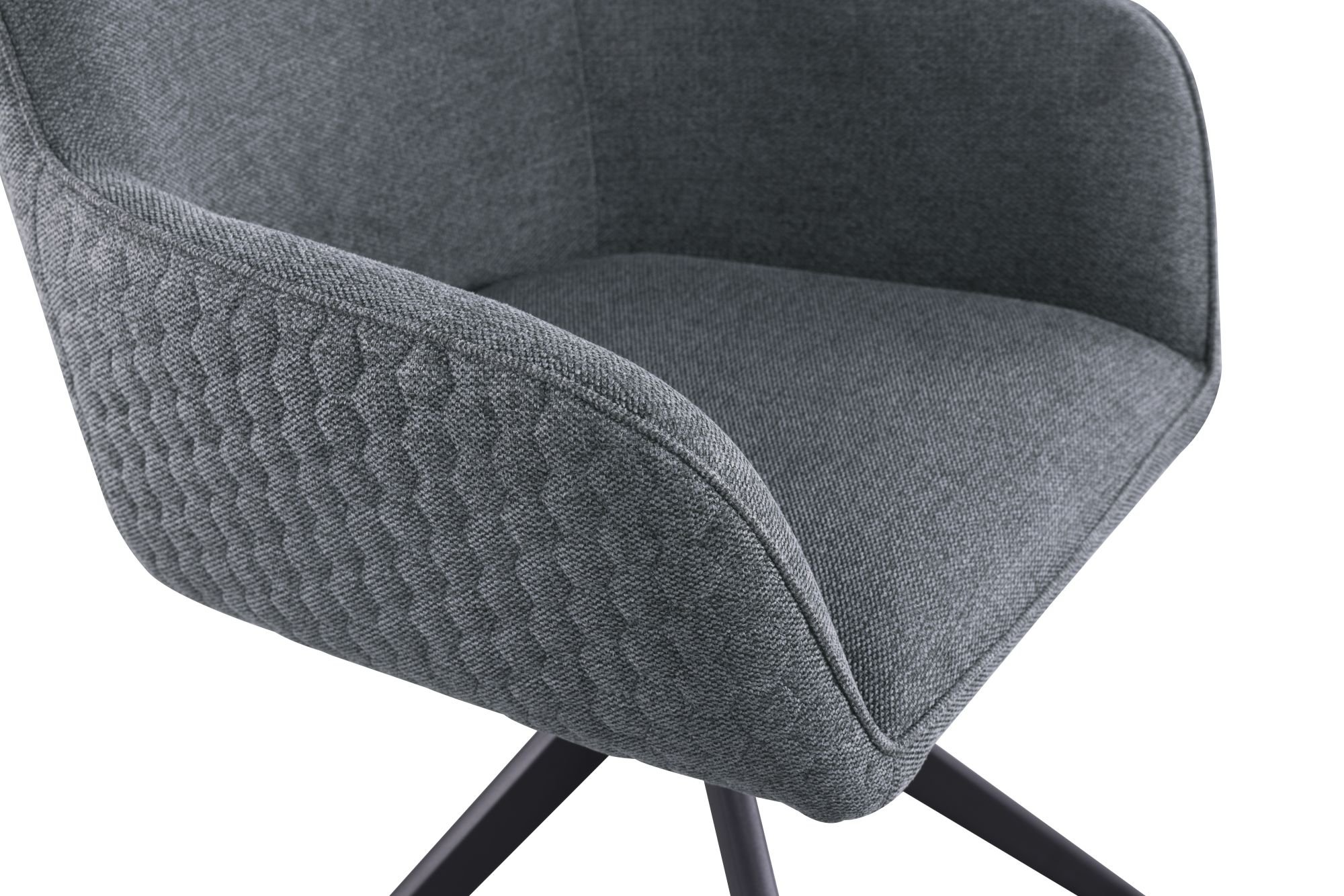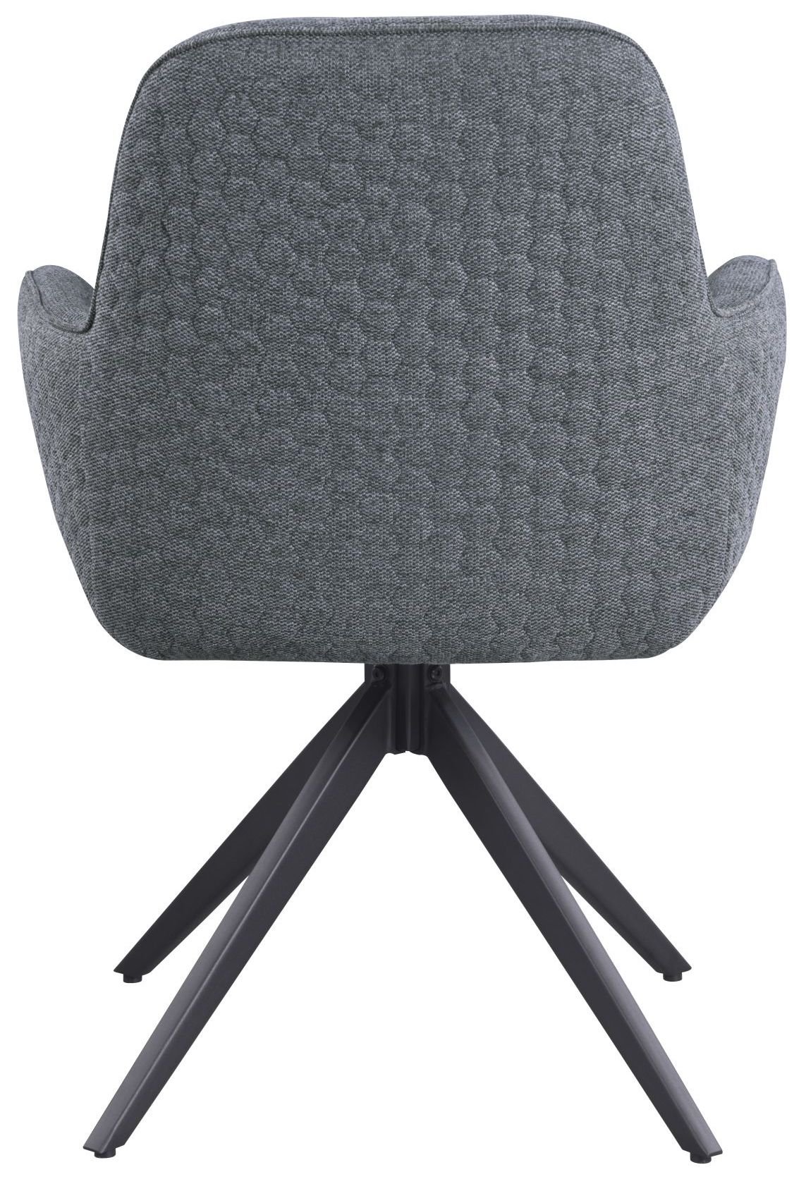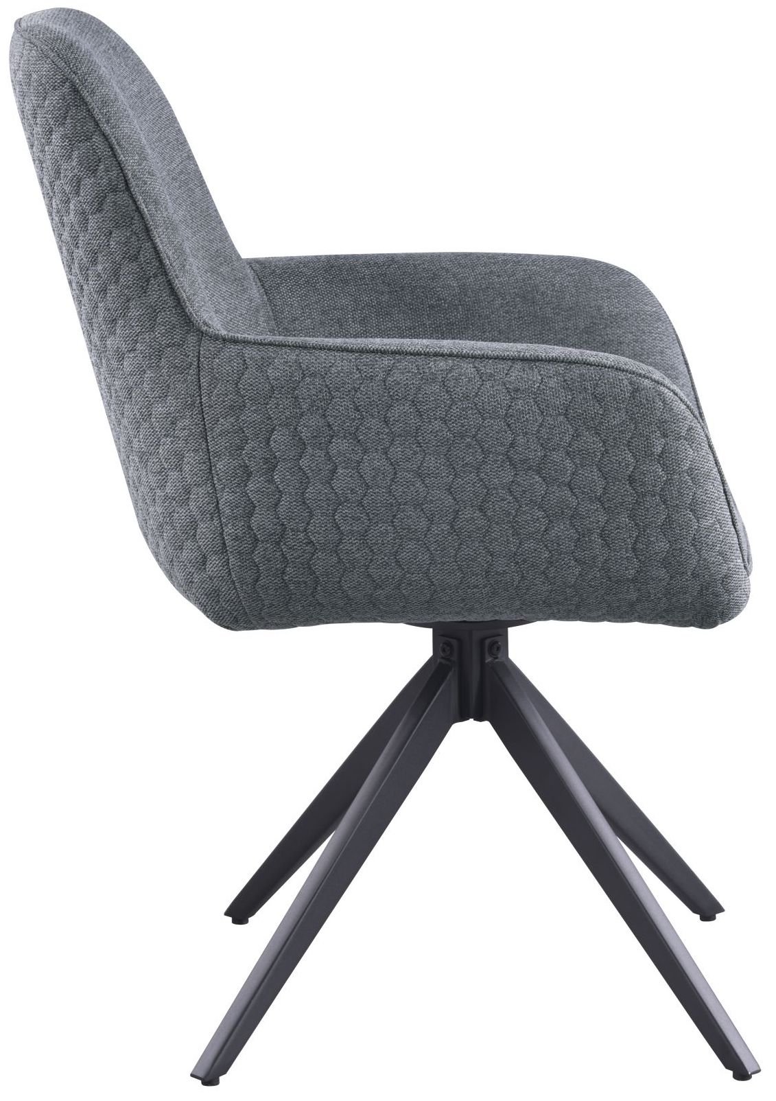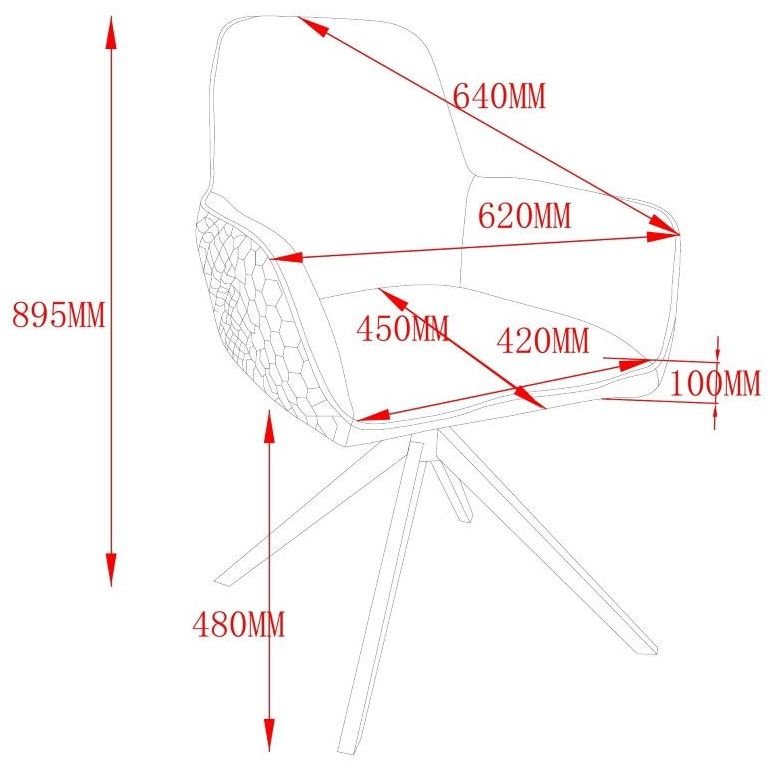 Vanjska strana naslona i naslona za ruke ukrašena je dekorativnim šavom u šesterokutnom uzorku, što stolici daje profinjen, a istovremeno moderan karakter. Nasloni za ruke integrirani su u oblik stolice i osiguravaju dodatnu udobnost pri jelu ili opuštanju. Okretni mehanizam omogućuje okretanje za 180°, što je praktično pri razgovoru za stolom ili pri ustajanju, bez potrebe za pomicanjem stolice.