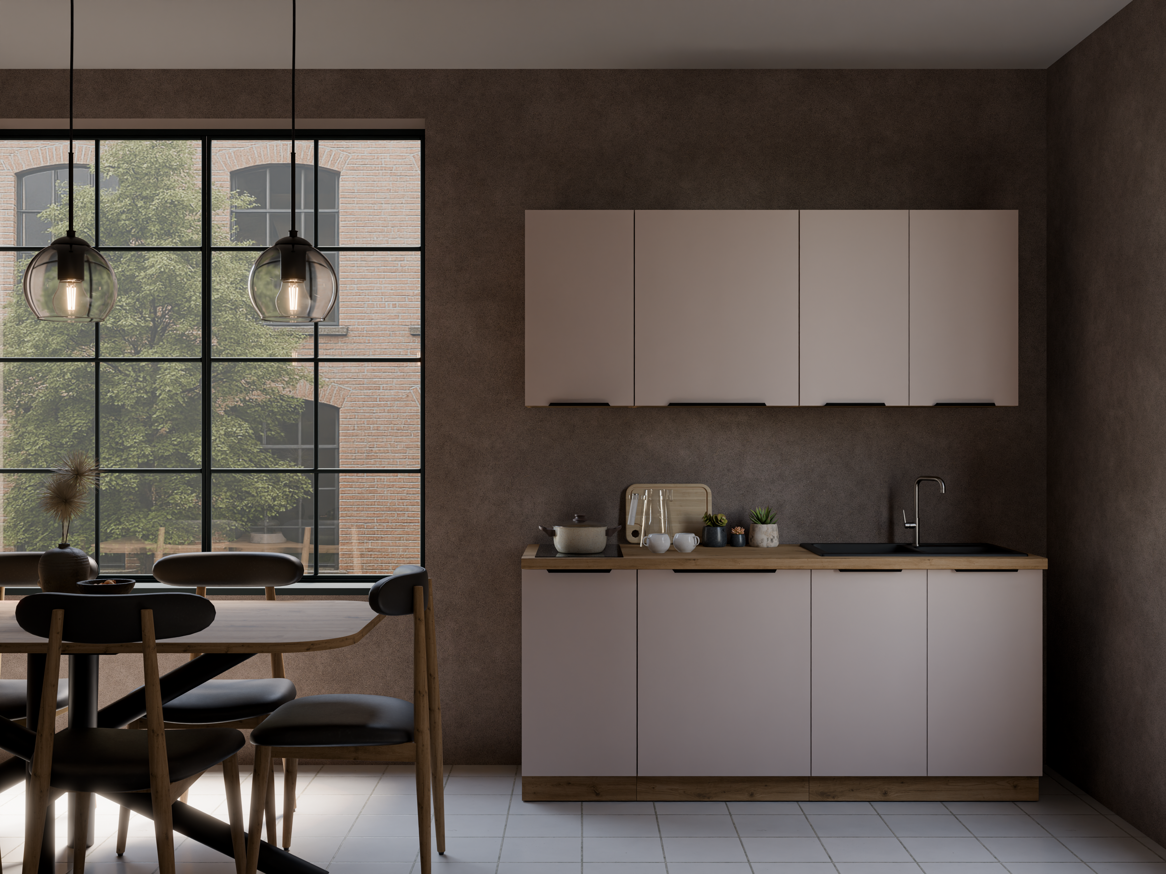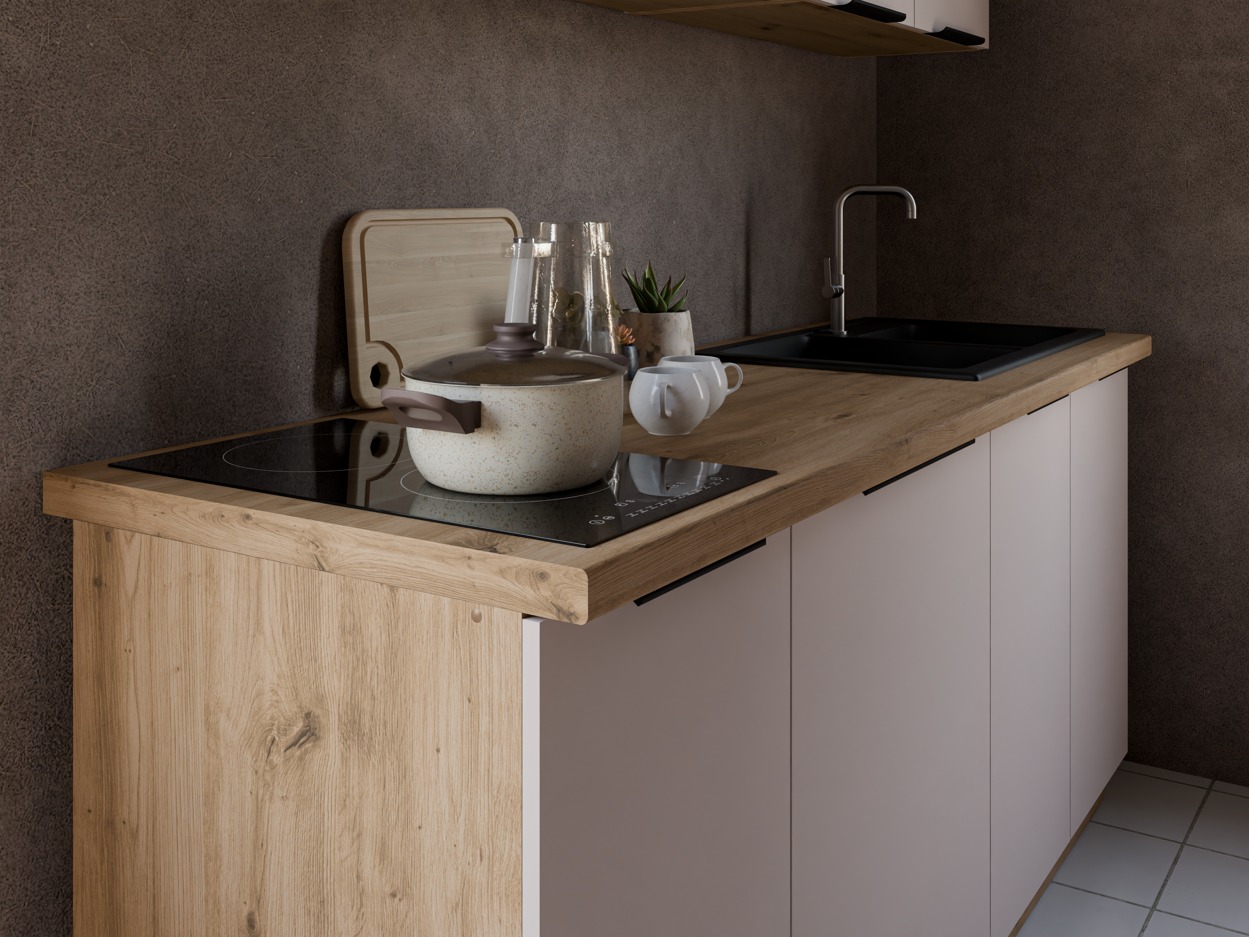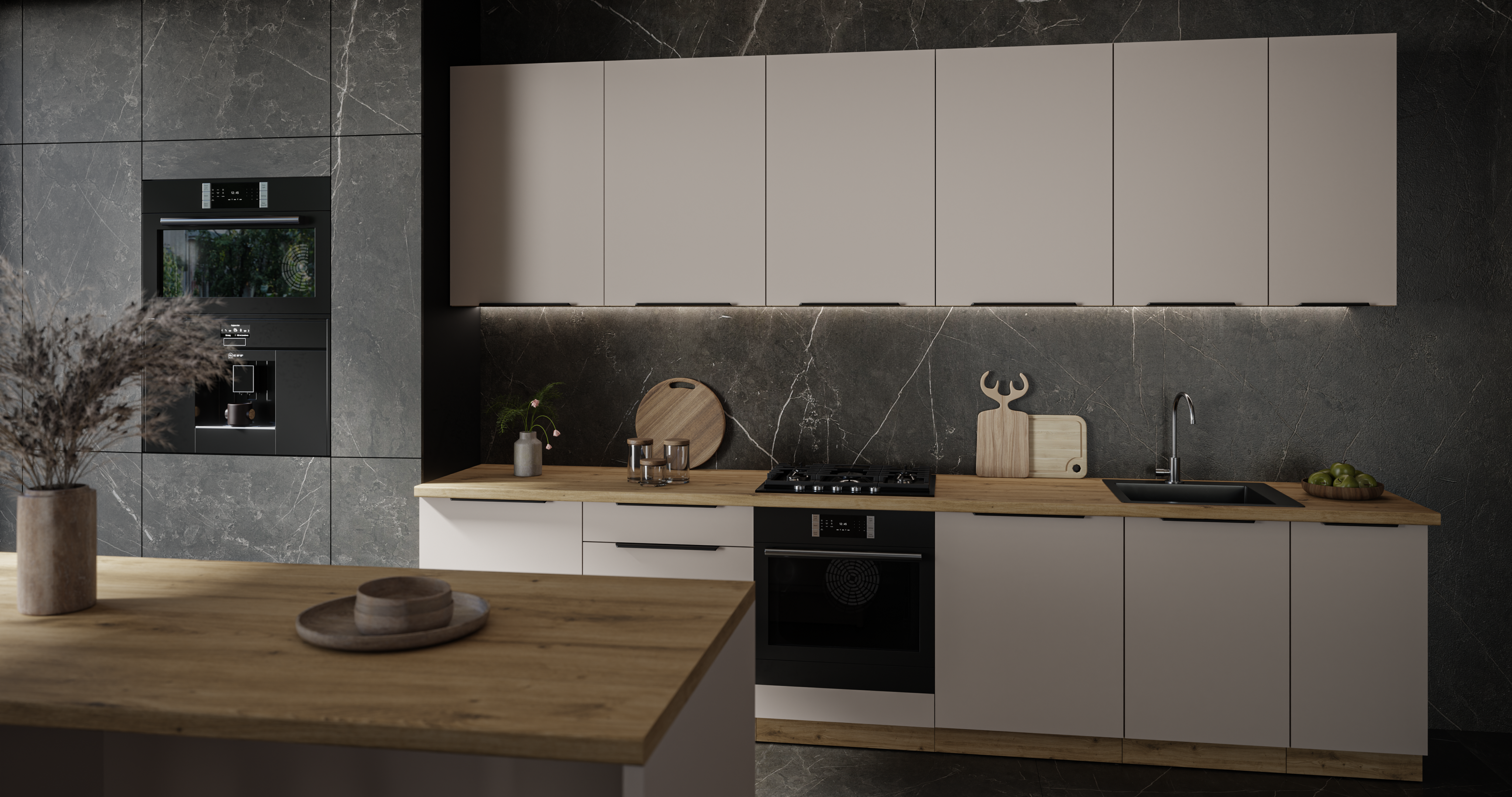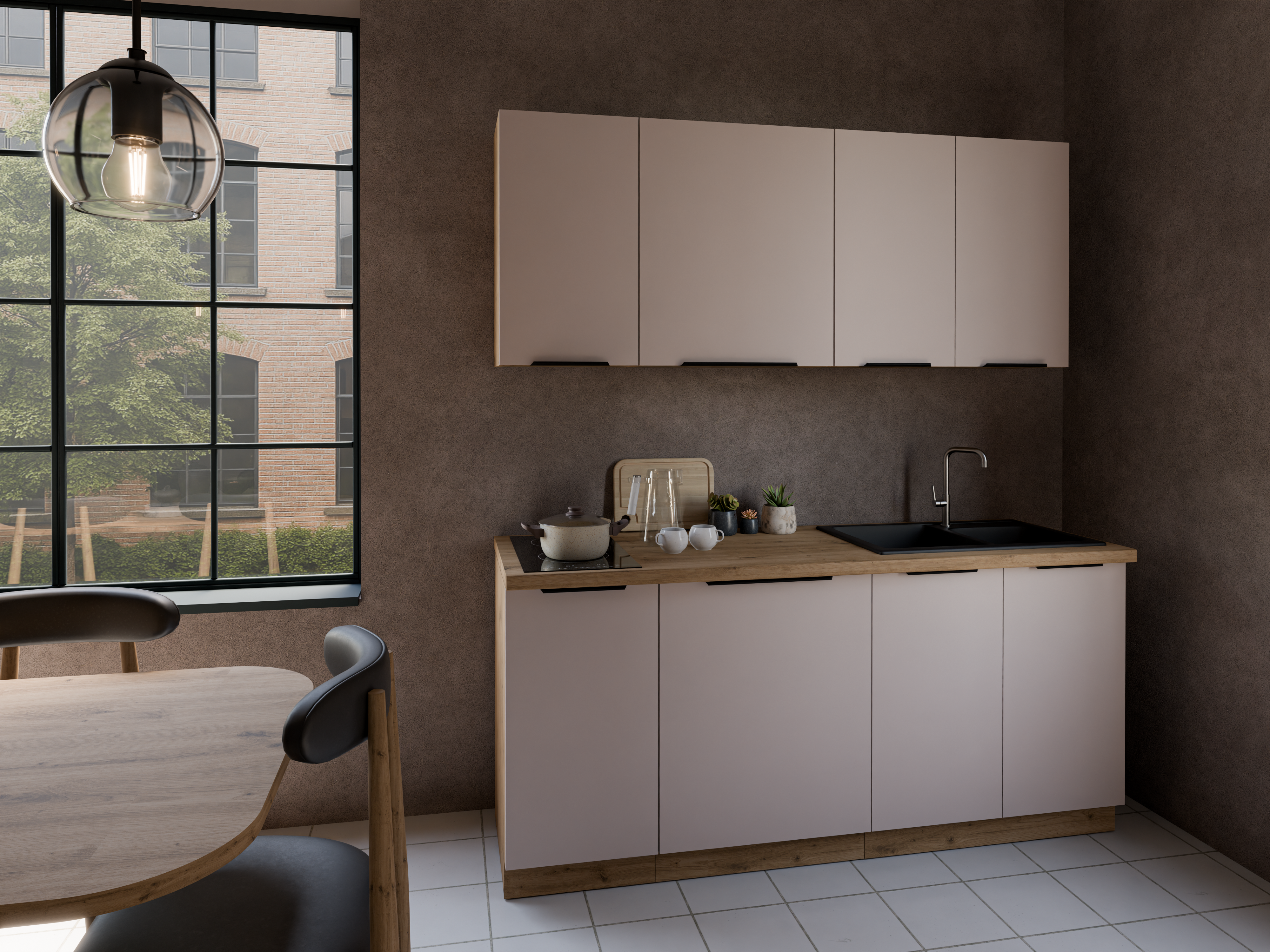 Kuhinjski set Solea odlikuje se visokokvalitetnim materijalima i promišljenom shemom boja. Okvir od laminirane ploče debljine 16 mm osigurava izdržljivost i dugotrajnu upotrebu, dok boja korpusa u nijansi artisan hrasta dodaje dašak prirodne topline. Fronta u elegantnom kašmiru daje sofisticiran izgled koji se savršeno uklapa s modernim ili klasičnim dekorativnim elementima vašeg doma.