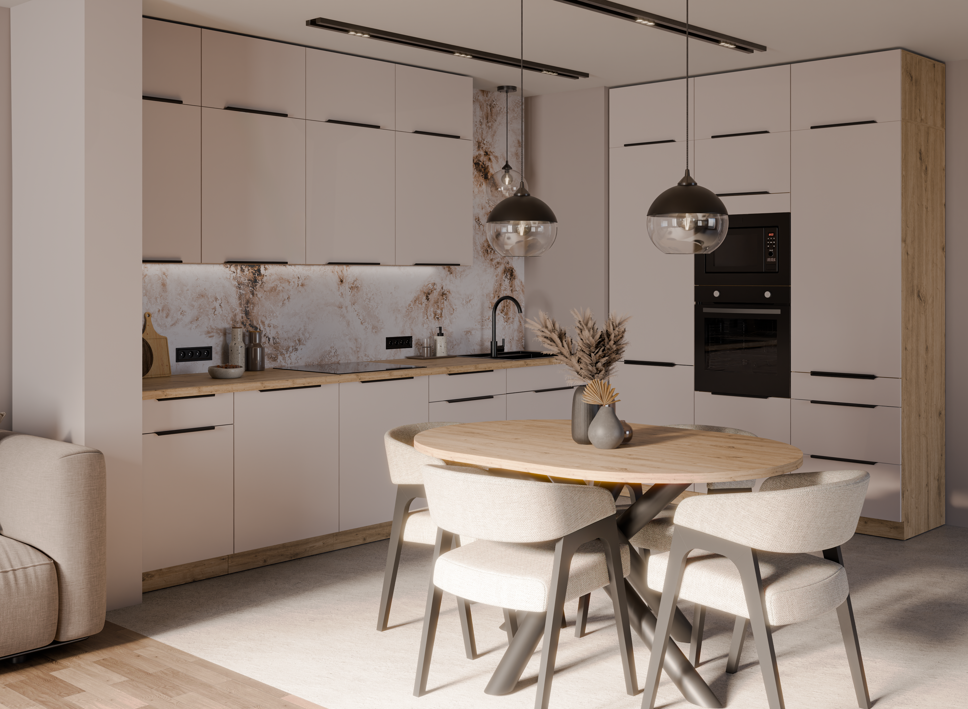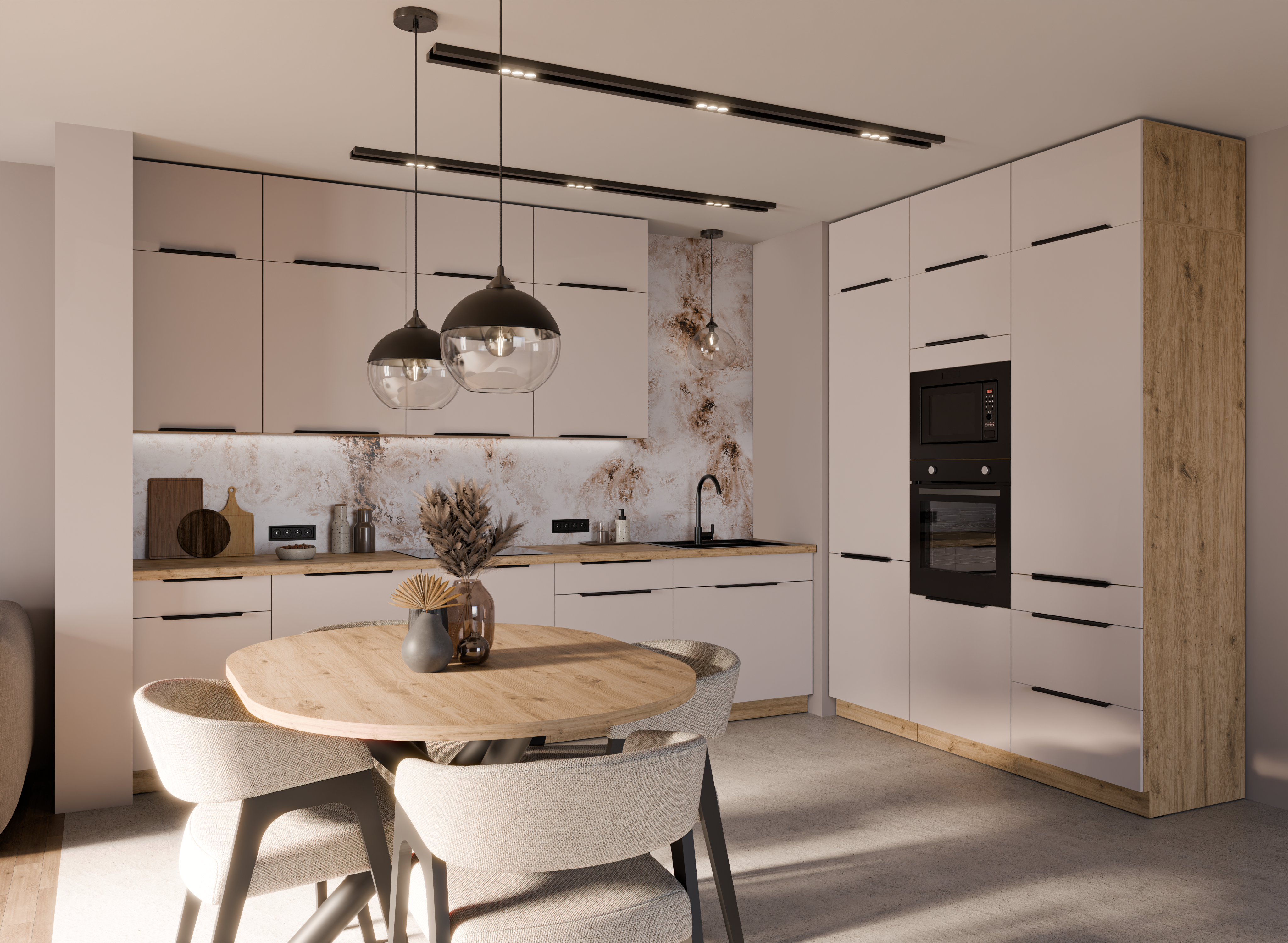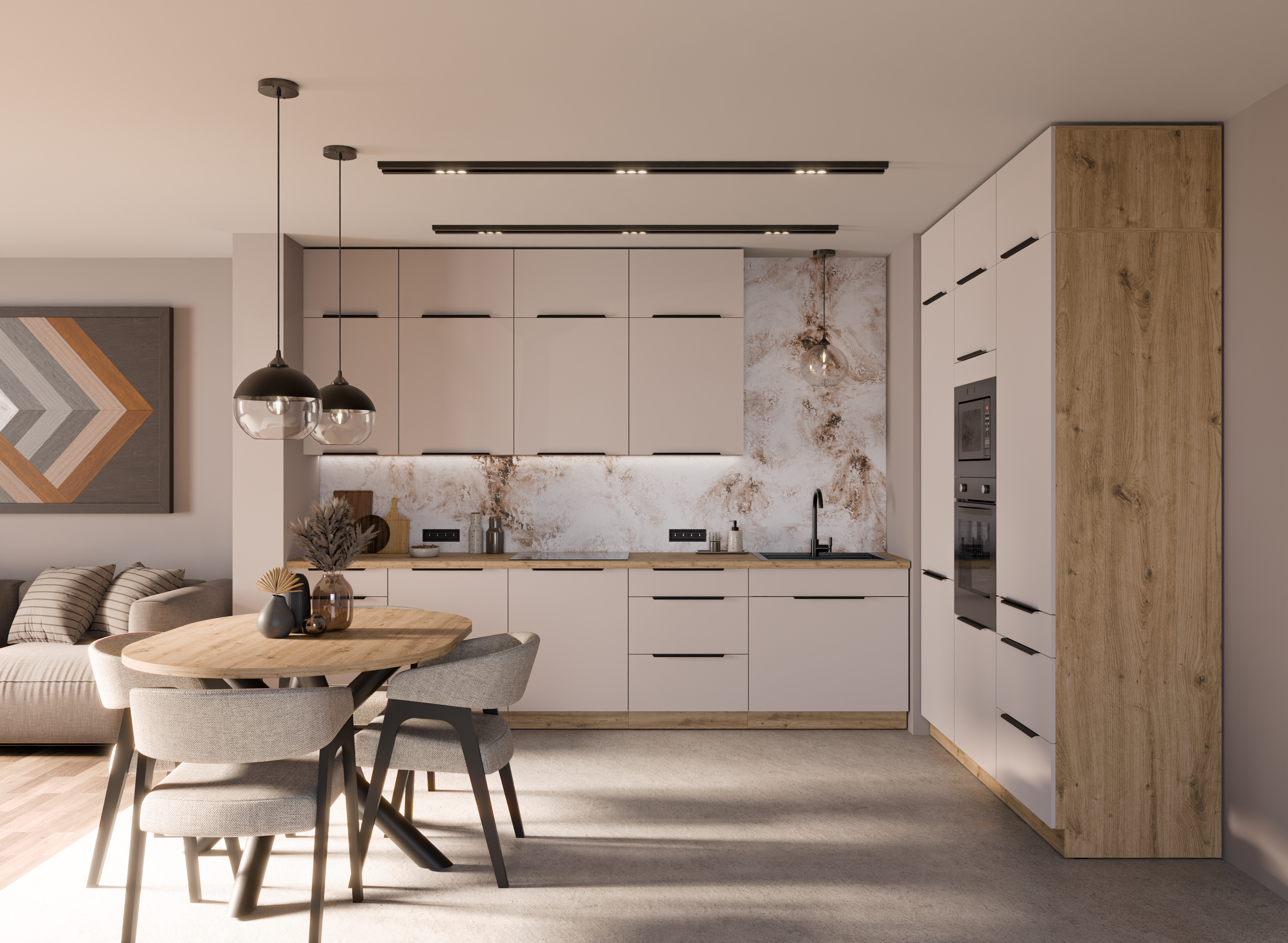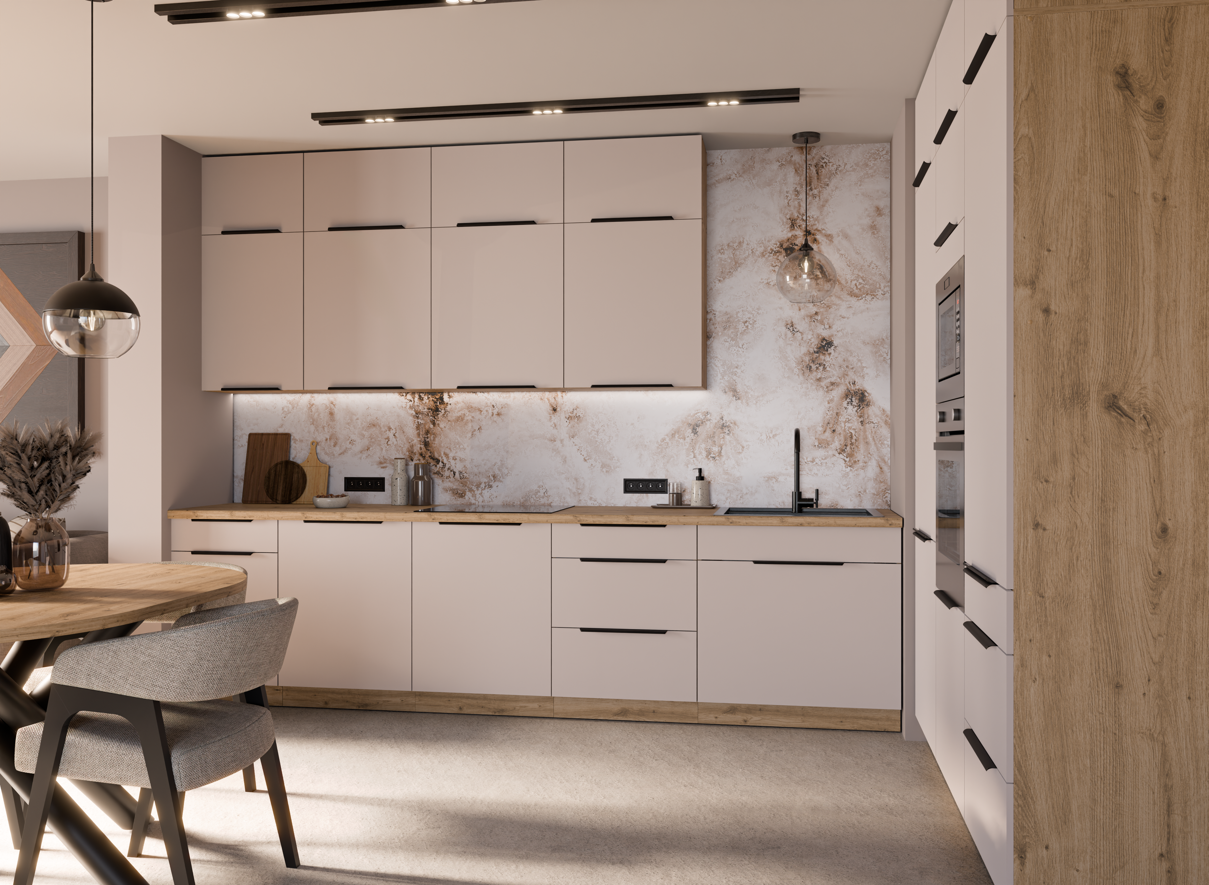Kuhinjski set Solea odlikuje se visokokvalitetnim materijalima i promišljenom shemom boja. Okvir od laminirane ploče debljine 16 mm osigurava izdržljivost i dugotrajnu upotrebu, dok boja korpusa u nijansi artisan hrasta dodaje dašak prirodne topline. Fronta u elegantnom kašmiru daje sofisticiran izgled koji se savršeno uklapa s modernim ili klasičnim dekorativnim elementima vašeg doma.