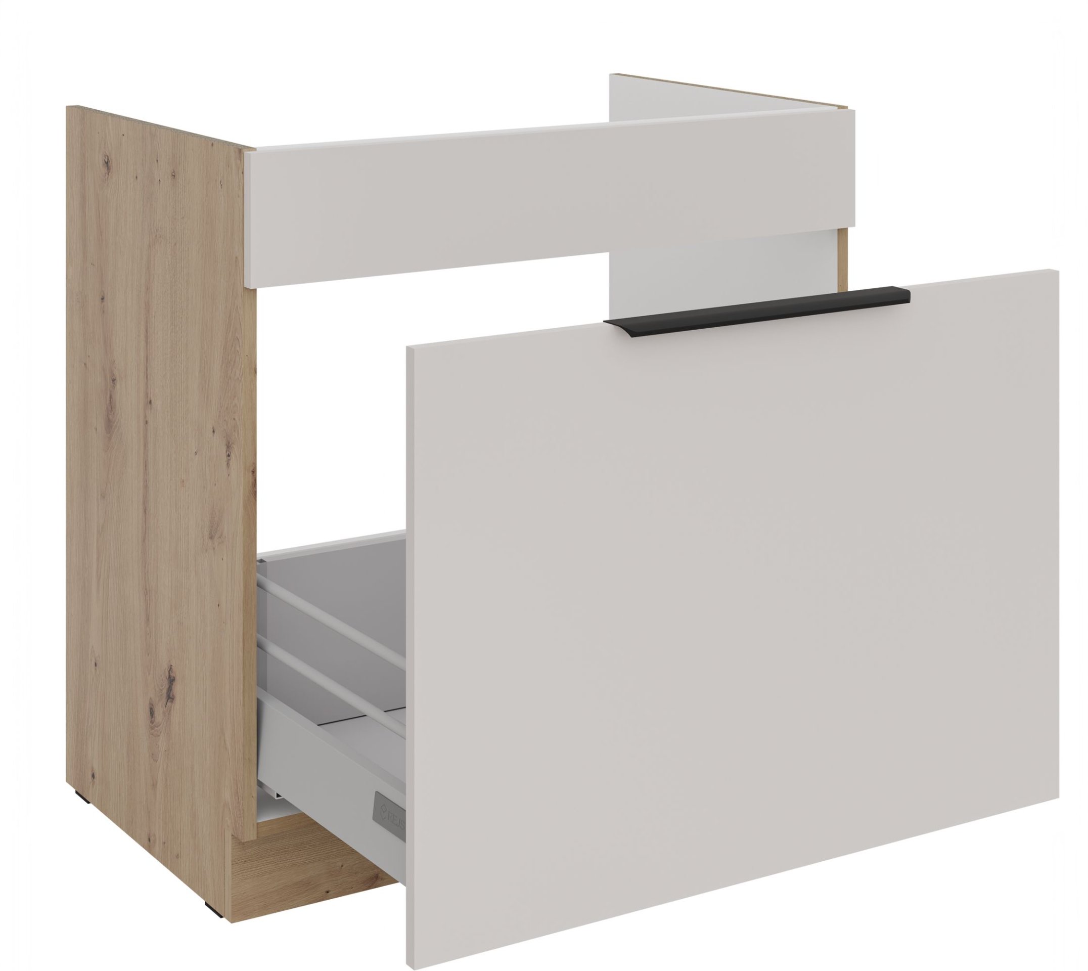 Kuhinjski set Solea odlikuje se visokokvalitetnim materijalima i promišljenom shemom boja. Okvir od laminirane ploče debljine 16 mm osigurava izdržljivost i dugotrajnu upotrebu, dok boja korpusa u nijansi artisan hrasta dodaje dašak prirodne topline. Fronte u elegantnom kašmiru daju sofisticiran izgled koji se savršeno uklapa s modernim ili klasičnim dekorativnim elementima vašeg doma.