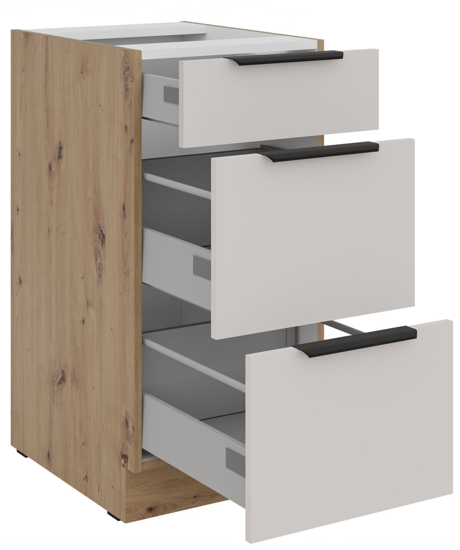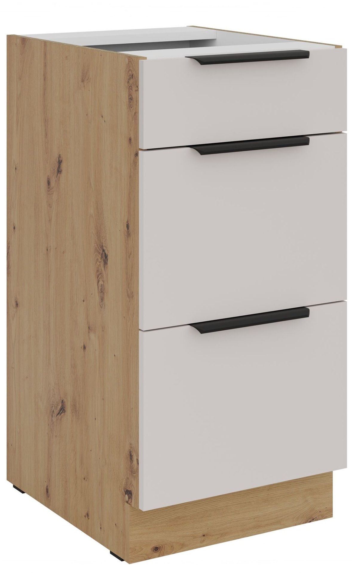 Kuhinjski set Solea odlikuje se visokokvalitetnim materijalima i promišljenom shemom boja. Okvir od laminirane ploče debljine 16 mm osigurava izdržljivost i dugotrajnu upotrebu, dok boja korpusa u nijansi artisan hrasta dodaje dašak prirodne topline. Fronta u elegantnoj kašmir boji pruža sofisticiran izgled koji se savršeno uklapa s modernim ili klasičnim dekorativnim elementima vašeg doma.
