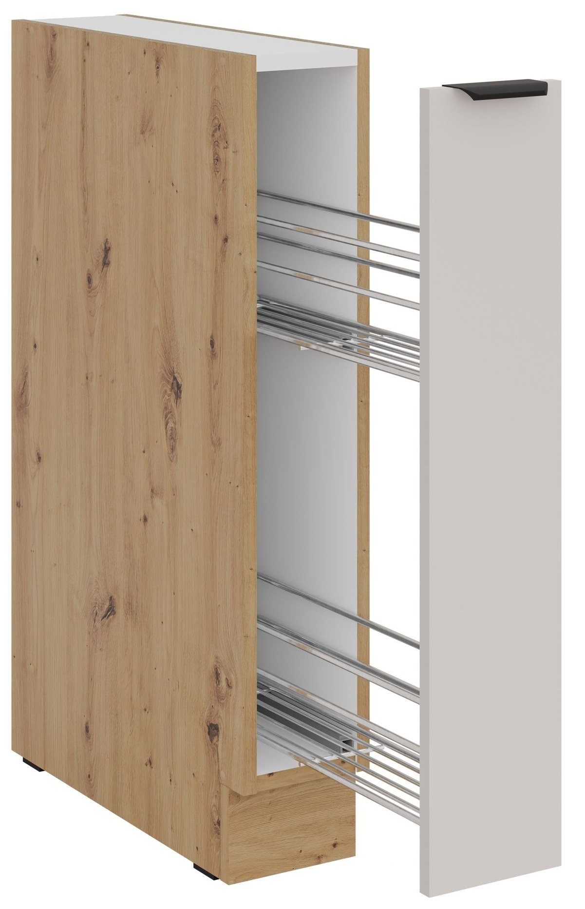 Kuhinjski set Solea odlikuje se visokokvalitetnim materijalima i promišljenom shemom boja. Okvir od laminirane ploče debljine 16 mm osigurava izdržljivost i dugotrajnu upotrebu, dok boja korpusa u nijansi artisan hrasta daje dašak prirodne topline. Fronta u elegantnom kašmiru pridonosi sofisticiranom izgledu koji se savršeno uklapa s modernim ili klasičnim dekorativnim elementima vašeg doma.
