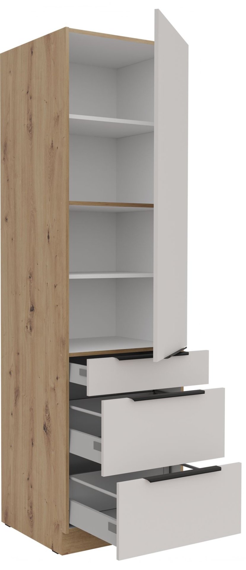 Kuhinjski set Solea odlikuje se visokokvalitetnim materijalima i promišljenom shemom boja. Okvir od laminirane ploče debljine 16 mm osigurava izdržljivost i dugotrajnu upotrebu, dok boja korpusa u nijansi artisan hrasta dodaje dašak prirodne topline. Fronta u elegantnom kašmiru pruža sofisticiran izgled koji se savršeno uklapa s modernim ili klasičnim dekorativnim elementima vašeg doma.