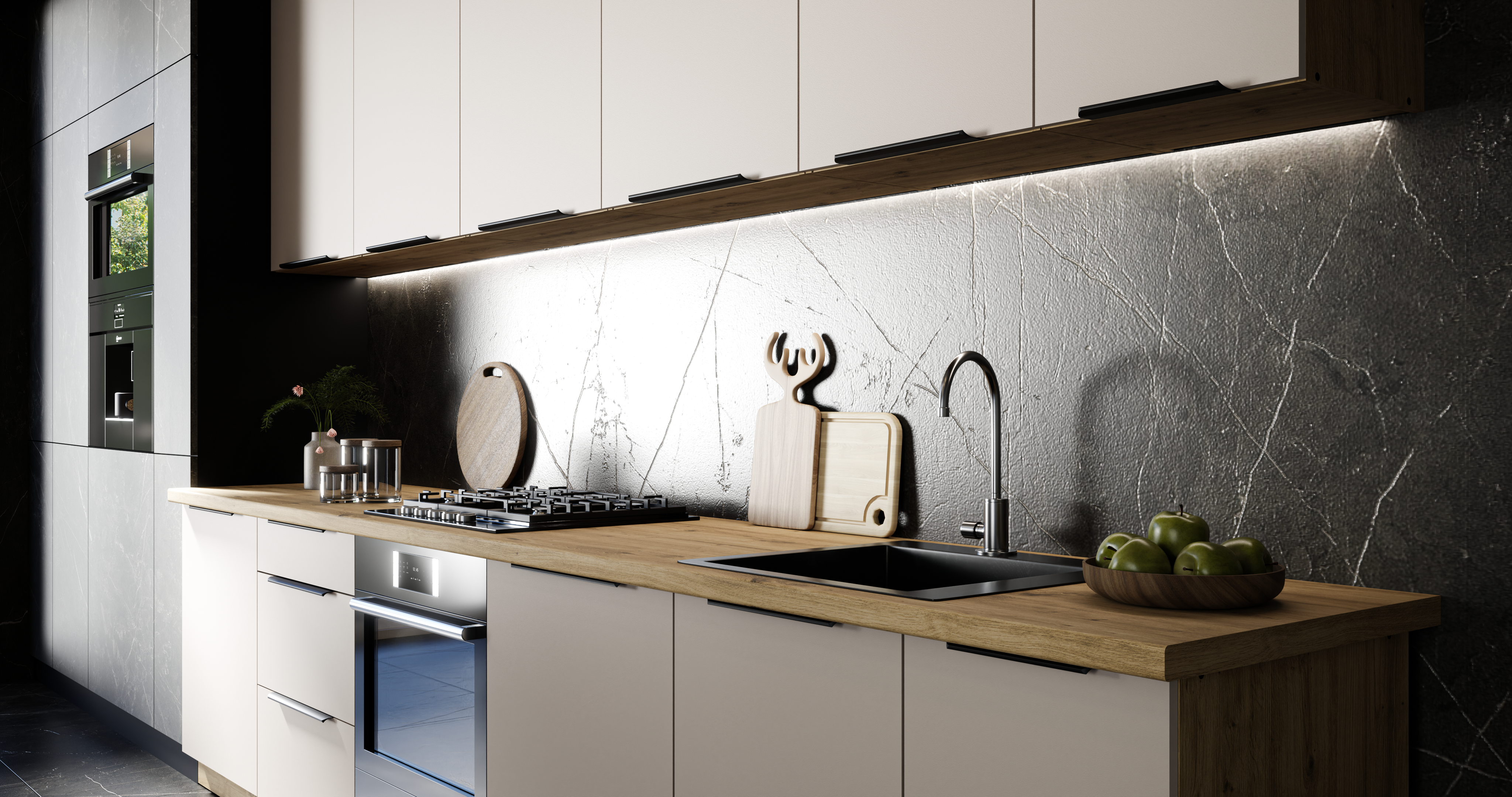 Kuhinjski sastav Solea odlikuje se visokokvalitetnim materijalima i promišljenom shemom boja. Okvir od laminirane ploče debljine 16 mm osigurava izdržljivost i dugotrajnu upotrebu, dok boja korpusa u nijansi artisan hrasta dodaje dašak prirodne topline. Fronta u elegantnom kašmiru pruža sofisticiran izgled koji se odlično uklapa s modernim ili klasičnim dekorativnim elementima vašeg doma.
