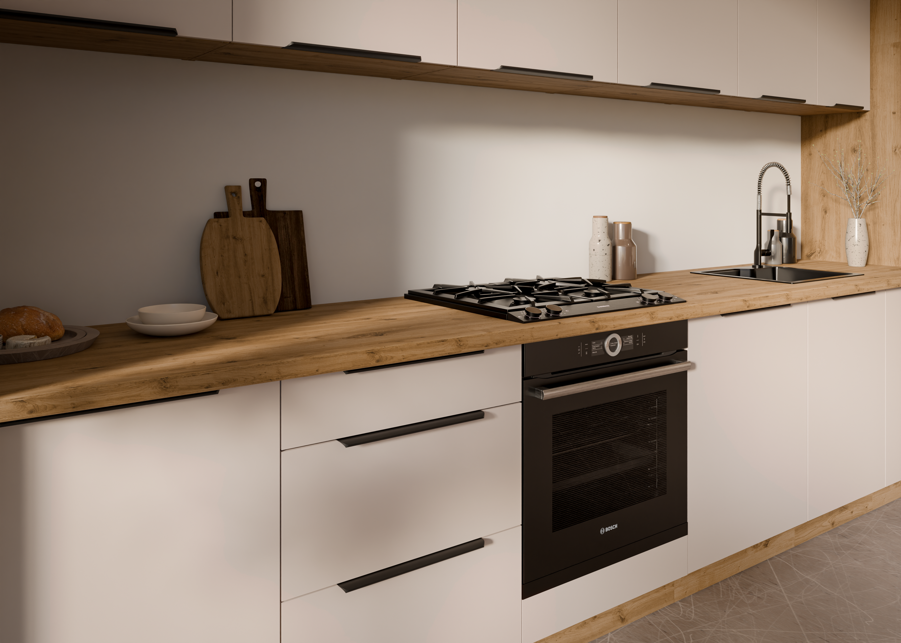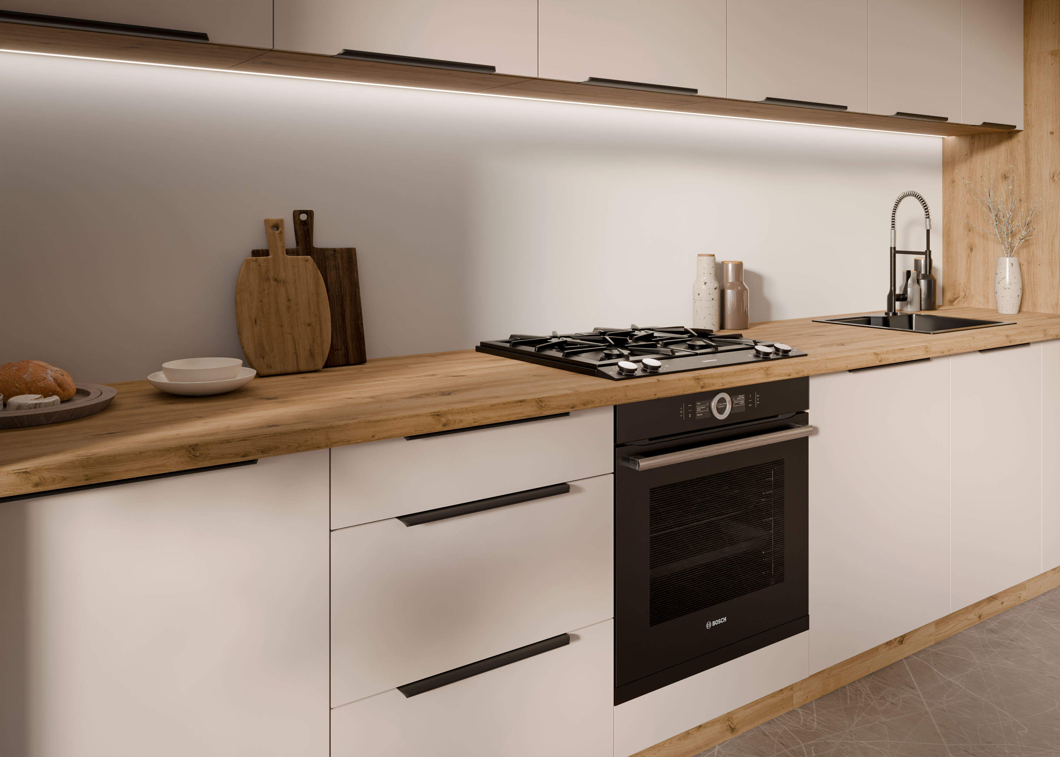 Kuhinjski set Solea odlikuje se visokokvalitetnim materijalima i promišljenom shemom boja. Okvir od laminirane ploče debljine 16 mm osigurava izdržljivost i dugotrajnu upotrebu, dok boja korpusa u nijansi artisan hrasta dodaje dašak prirodne topline. Fronta u elegantnom kašmiru pruža sofisticiran izgled koji se savršeno uklapa s modernim ili klasičnim dekorativnim elementima vašeg doma.
