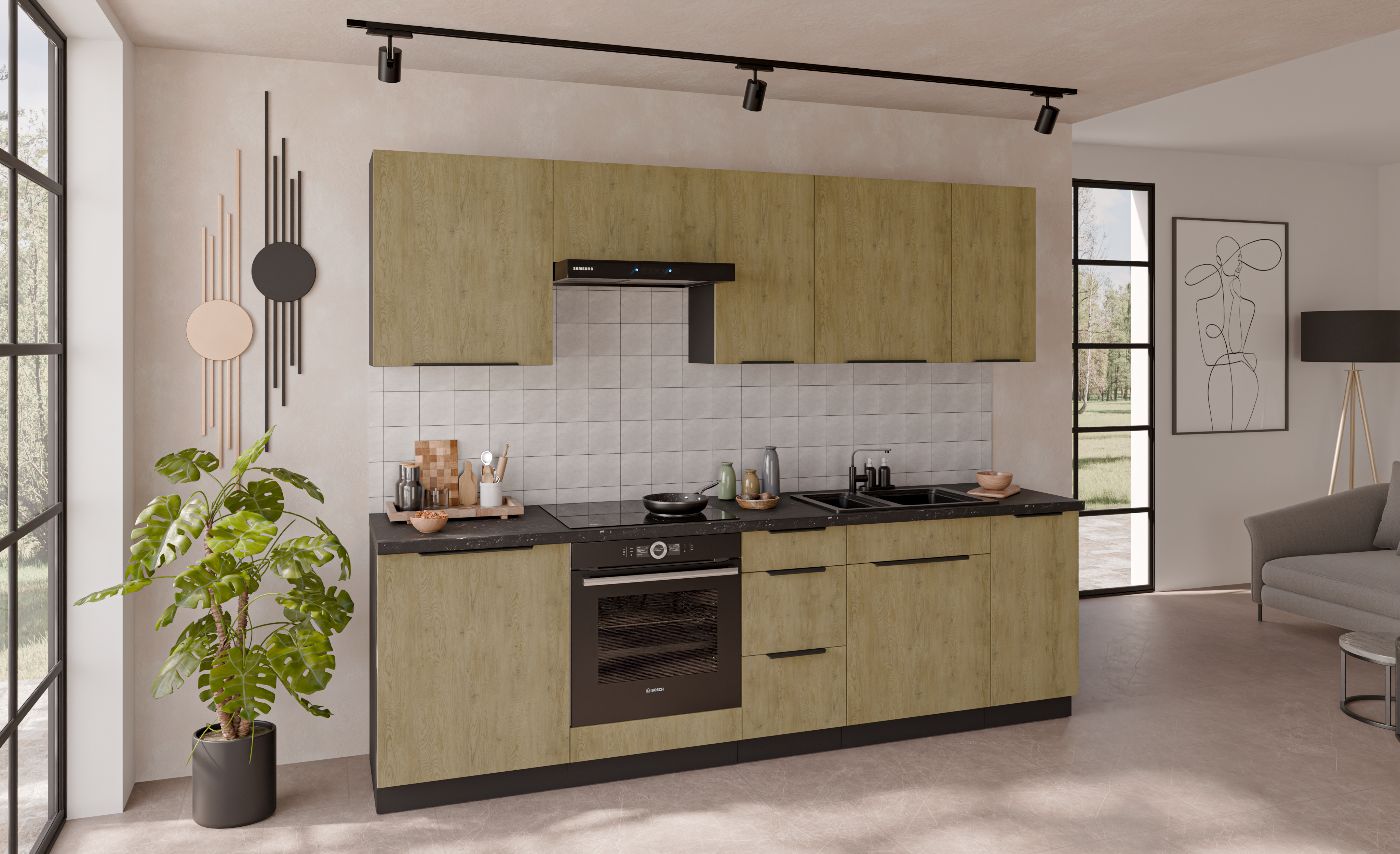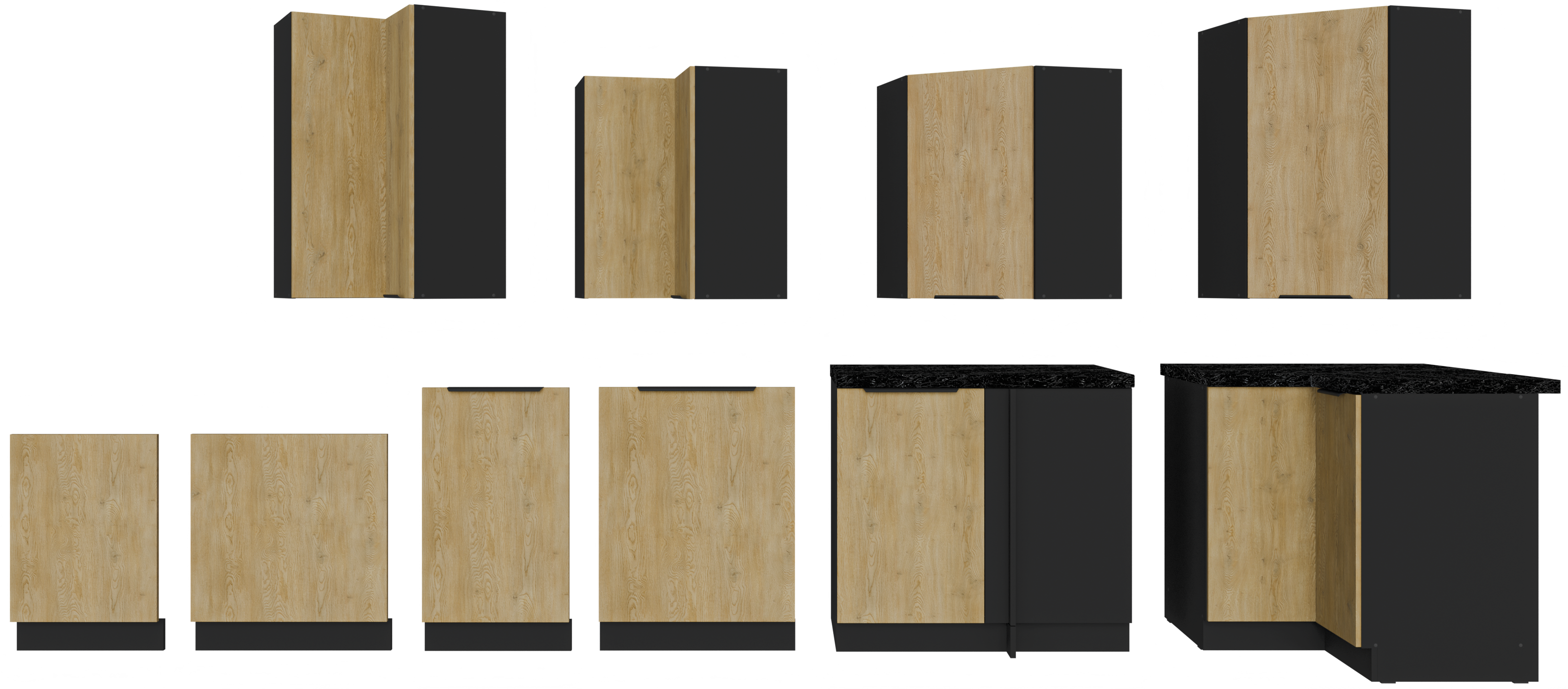 Kuhinjski set Cremona odlikuje se materijalom od laminirane ploče debljine 16 mm, što osigurava izdržljivost i dug vijek trajanja. Fronte u boji cremona hrasta dodaju dašak prirodnog šarma, dok korpus u crnoj boji pruža profinjenu i modernu estetiku. Ova kombinacija boja donosi topao osjećaj u svaki dom.