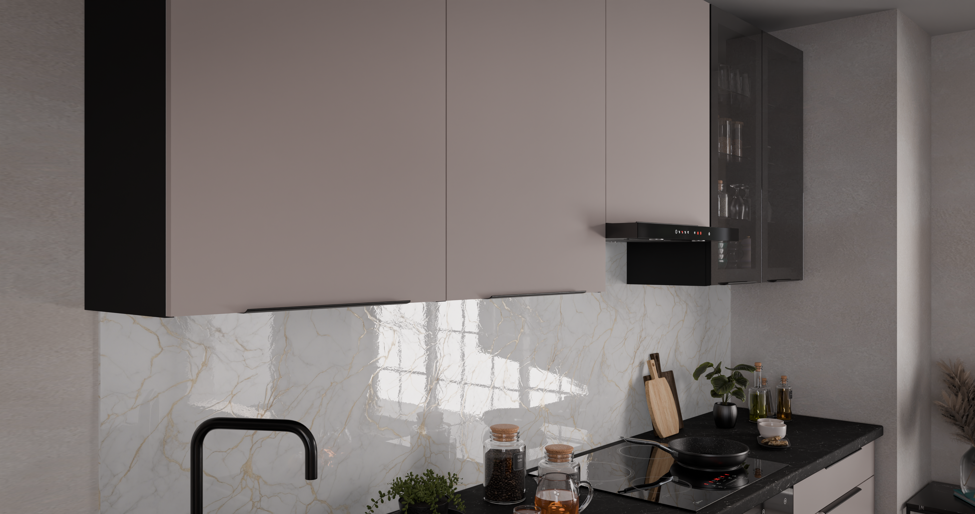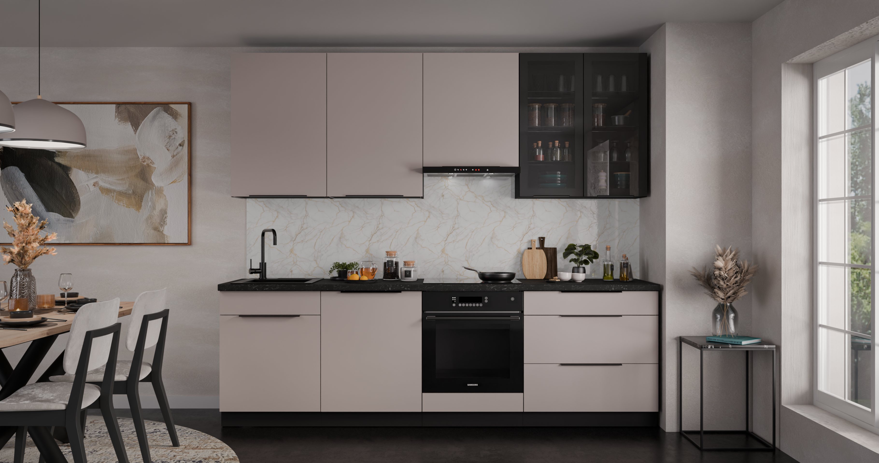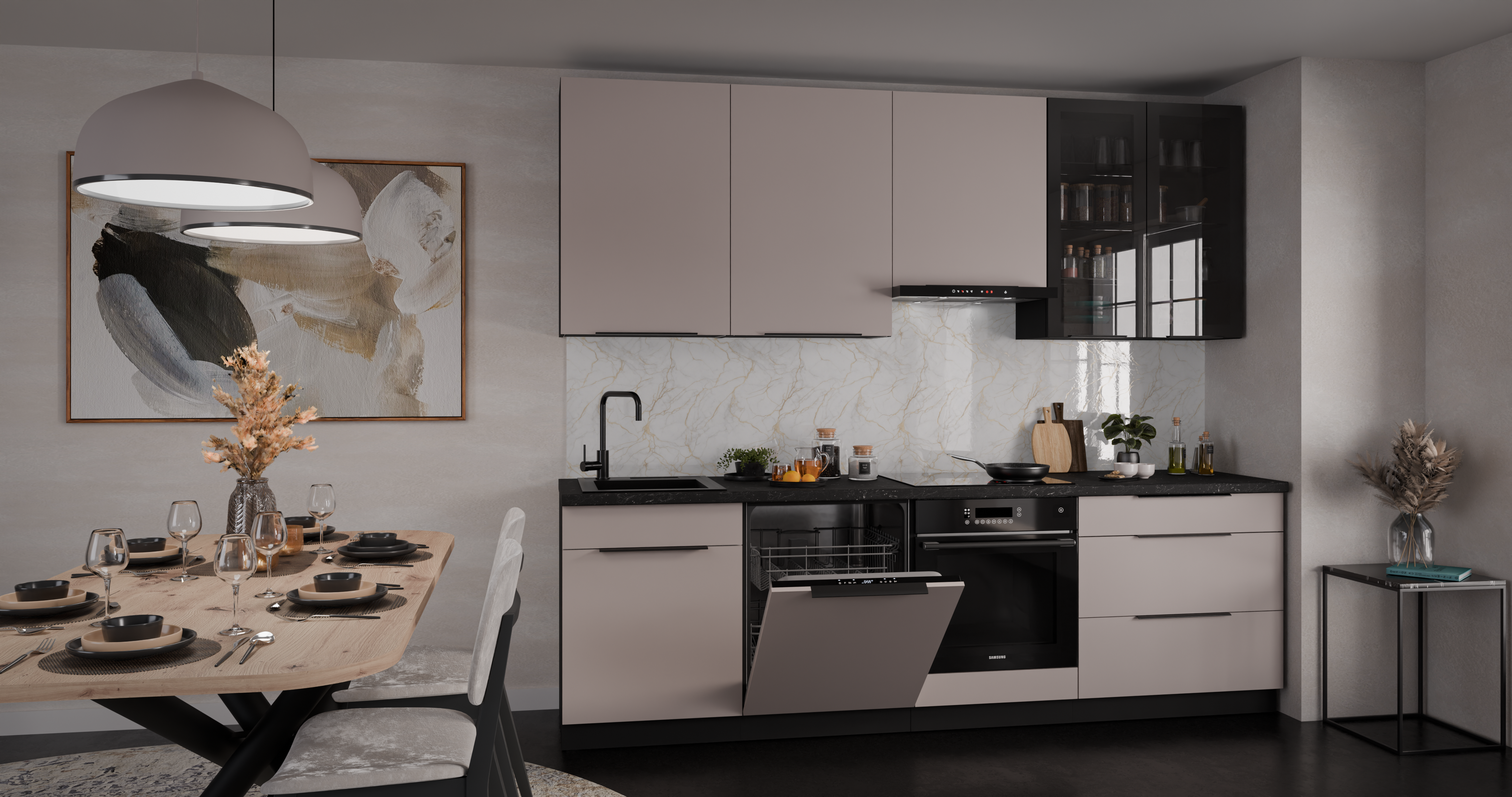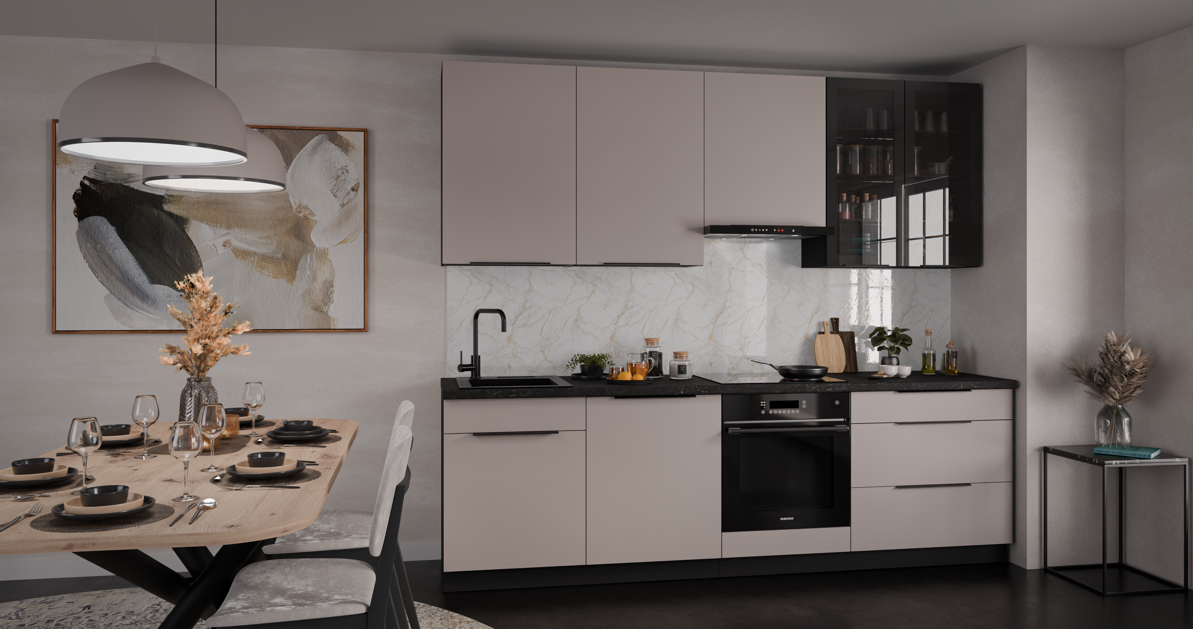 Stvorite kuhinju koja spaja moderan dizajn, funkcionalnost i kvalitetnu izradu. Ovaj kuhinjski set širine 260 cm odličan je izbor za sve koji žele svoj prostor pretvoriti u estetski dovršeno i praktično okruženje, gdje su kuhanje i druženje pravi užitak. Elegantna kombinacija boja kašmira i crne dodaje dašak prestiža, dok detalji poput rubnih ručk UA-HEXA u crno–aluminijskoj izvedbi osiguravaju moderan izgled.