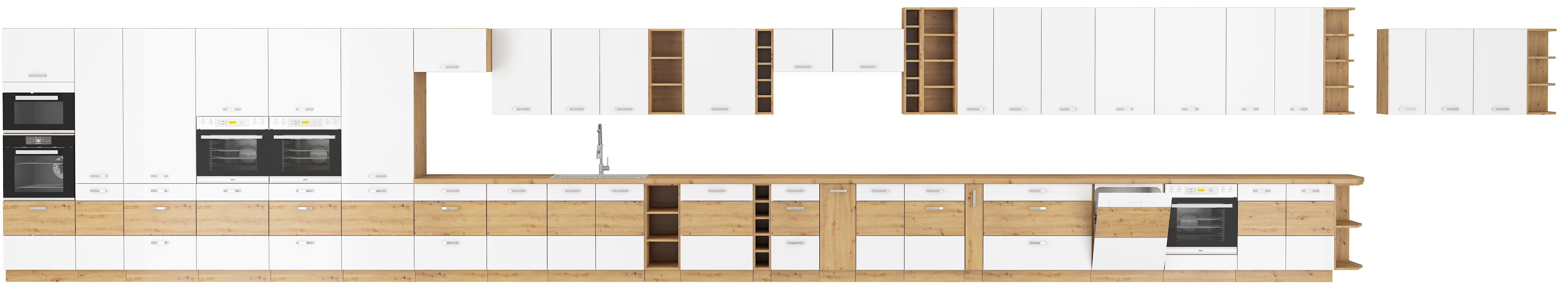 Ormarić je izrađen od kvalitetne laminirane ploče debljine 16 mm, što osigurava čvrstoću i dugotrajnost. Bijela sjajna fronta u kontrastu s prirodnom toplinom hrasta artisan stvara moderan, a ujedno ugodan izgled koji se odlično uklapa i u moderne i u klasične kuhinje. Srebrna mat ručka dodaje dašak elegancije, a pritom je praktična za svakodnevnu upotrebu.
