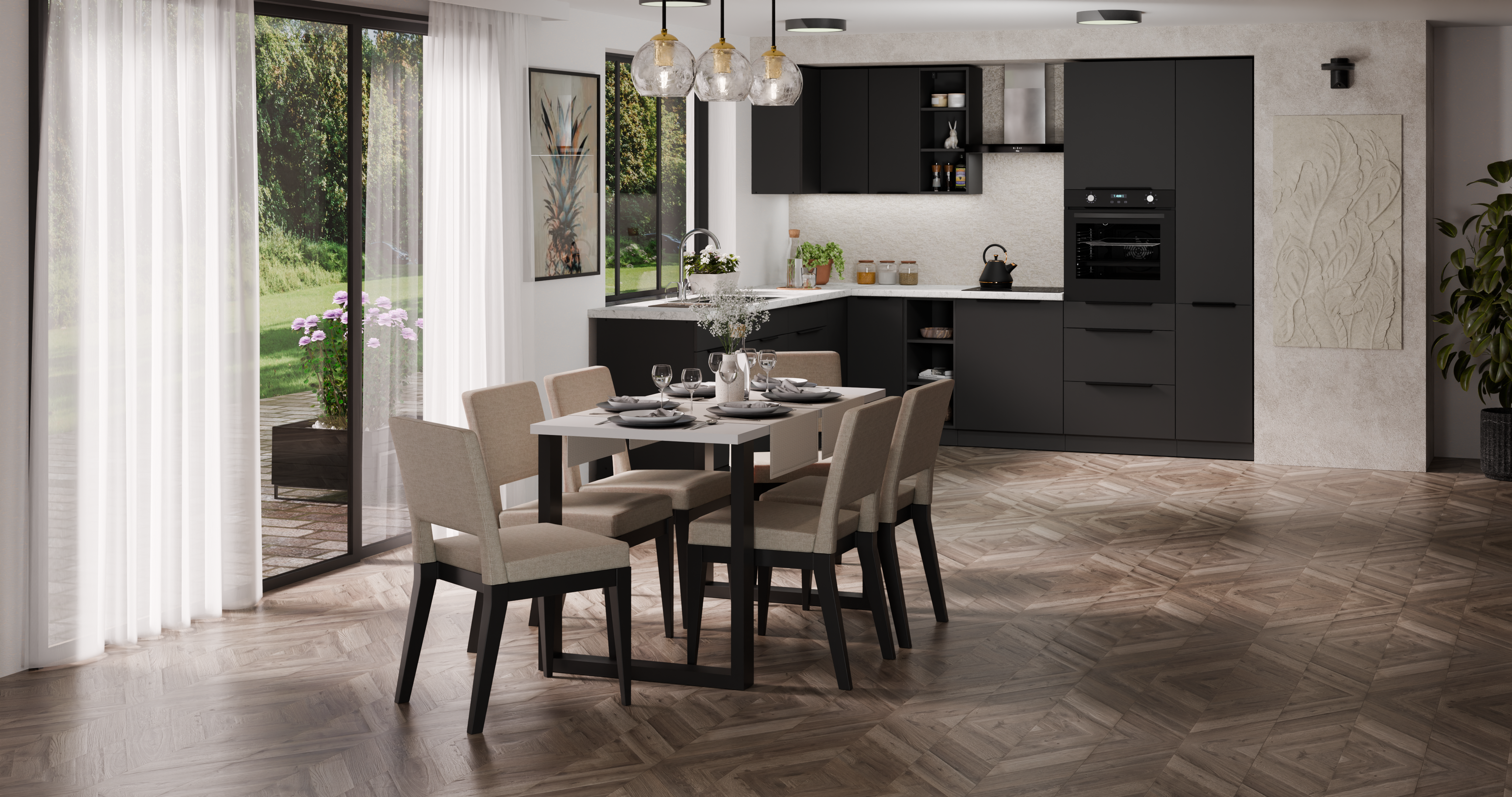 Estetski dorađena rubna ručka UA-HEXA u kombinaciji crne i aluminijske boje dodaje ormariću elegantan industrijski štih. Ručka nije samo vizualno privlačna, već i ergonomski oblikovana, što omogućuje udobno otvaranje i zatvaranje vrata. Površina u crnoj mat boji iznimno je otporna na ogrebotine i jednostavna za čišćenje, pa će vaša kuhinja uvijek izgledati besprijekorno.
