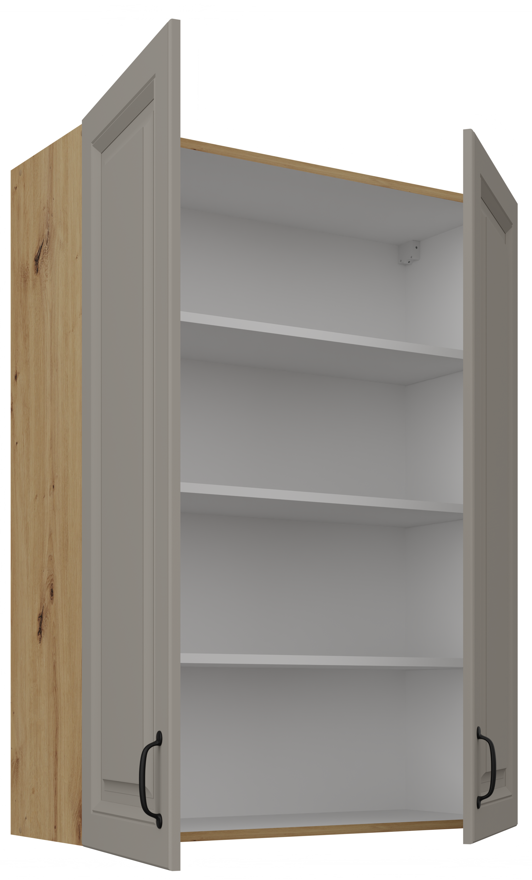 Dimenzija 80x31x107,5 cm ovaj gornji ormarić idealan je za manje ili veće kuhinjske postavke, jer omogućuje optimalno iskorištavanje prostora. Izrađen je od kvalitetne laminirane ploče, poznate po otpornosti na vlagu, ogrebotine i visoke temperature – što je u kuhinji od ključne važnosti. Površina u nijansi hrasta artisan u kombinaciji s mekom sivom bojom claygrey stvara topao, a moderan izgled koji se uklapa i u svijetle i u tamne kuhinjske dekore.