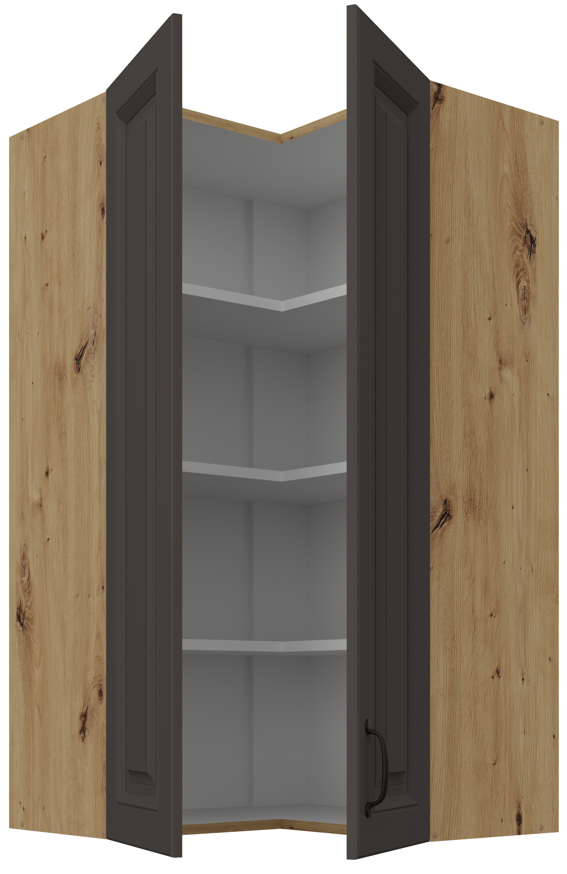 Gornji kutni ormarić Stilo u kombinaciji boja siva/hrast artisan savršen je izbor za sve koji cijene moderan dizajn, kvalitetnu izradu i praktičnost. Svojim dimenzijama 60x31x107,5 cm savršeno se uklapa u svaki kuhinjski prostor i omogućuje optimalno korištenje kutova koji su često neiskorišteni. Ovaj ormarić spaja estetiku prirodnog drva i modernu sivinu, stvarajući ugodnu, uravnoteženu i elegantnu atmosferu u vašem domu.
