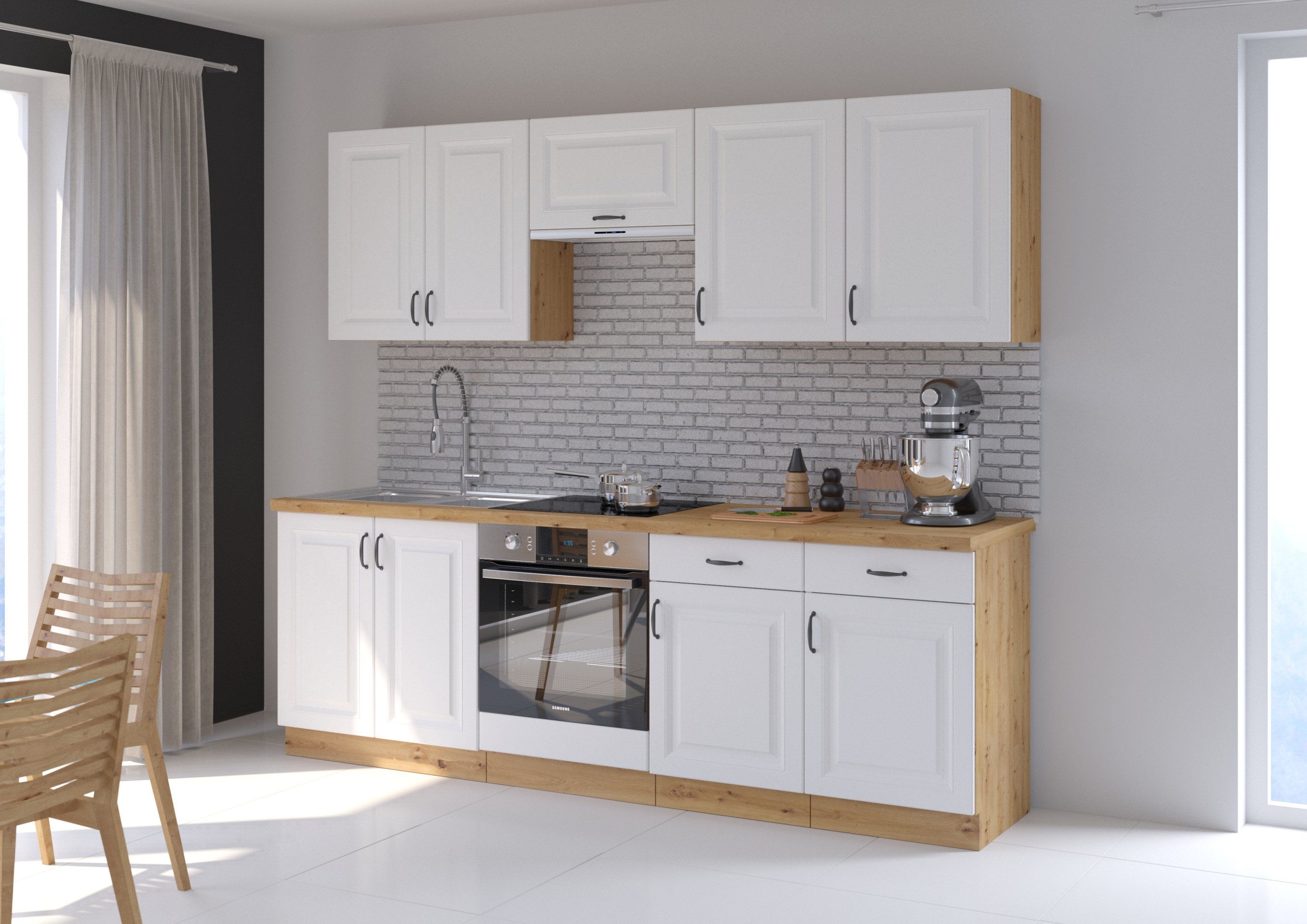 Kada zamišljate savršenu kuhinju, vjerojatno želite prostor koji spaja funkcionalnost, estetiku i profinjenu toplinu domaćeg ugođaja. Upravo to nudi kuhinjski sastav Stilo u kombinaciji bijela/hrast artisan. Riječ je o elegantnom rješenju za sve koji cijene kvalitetnu izradu, jednostavnost suvremenih linija i bezvremensku ljepotu prirodnih tonova drva. S duljinom od 240 cm savršeno se uklapa u manje ili srednje velike kuhinjske prostore, bez žrtvovanja praktičnosti i udobnosti.