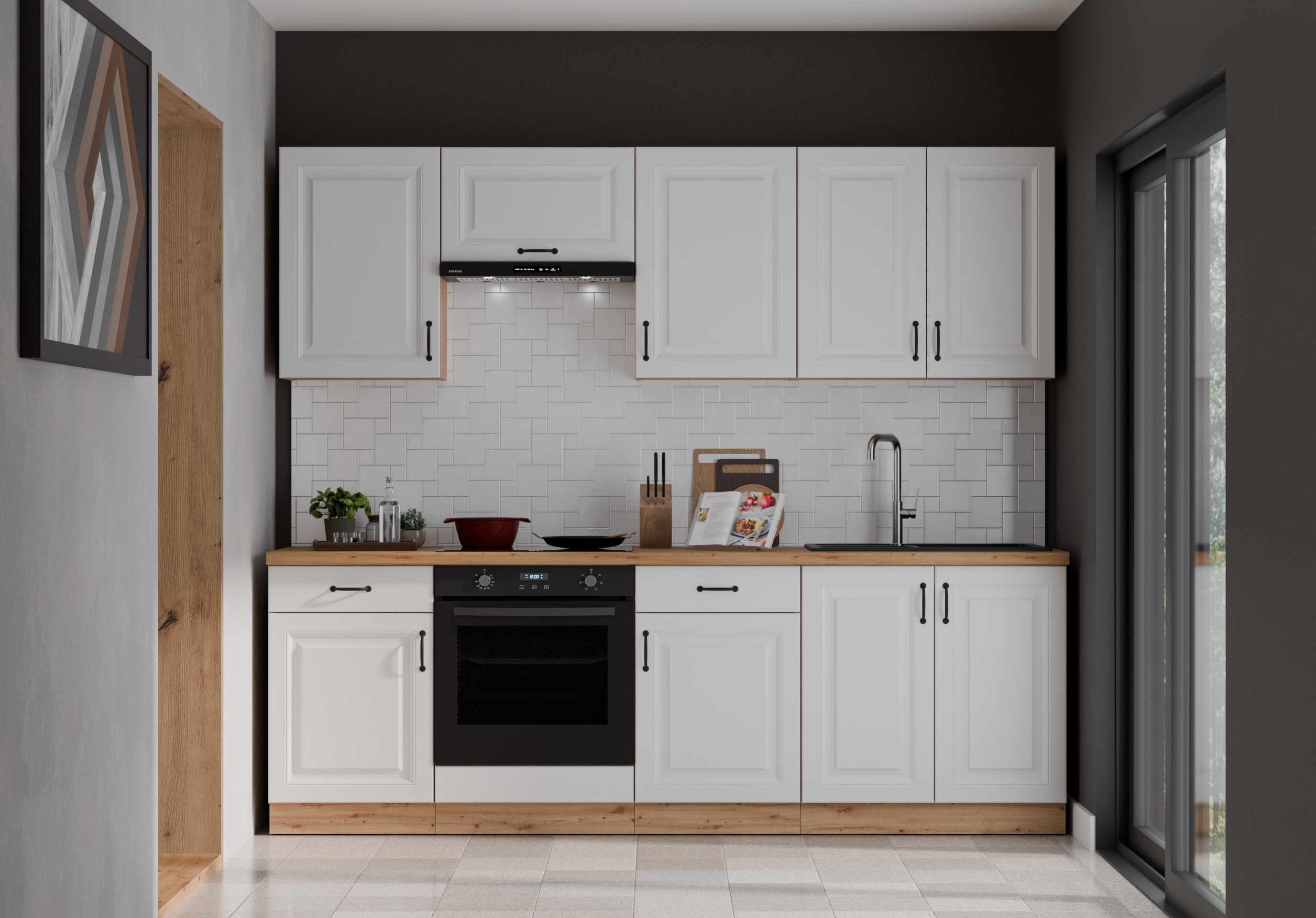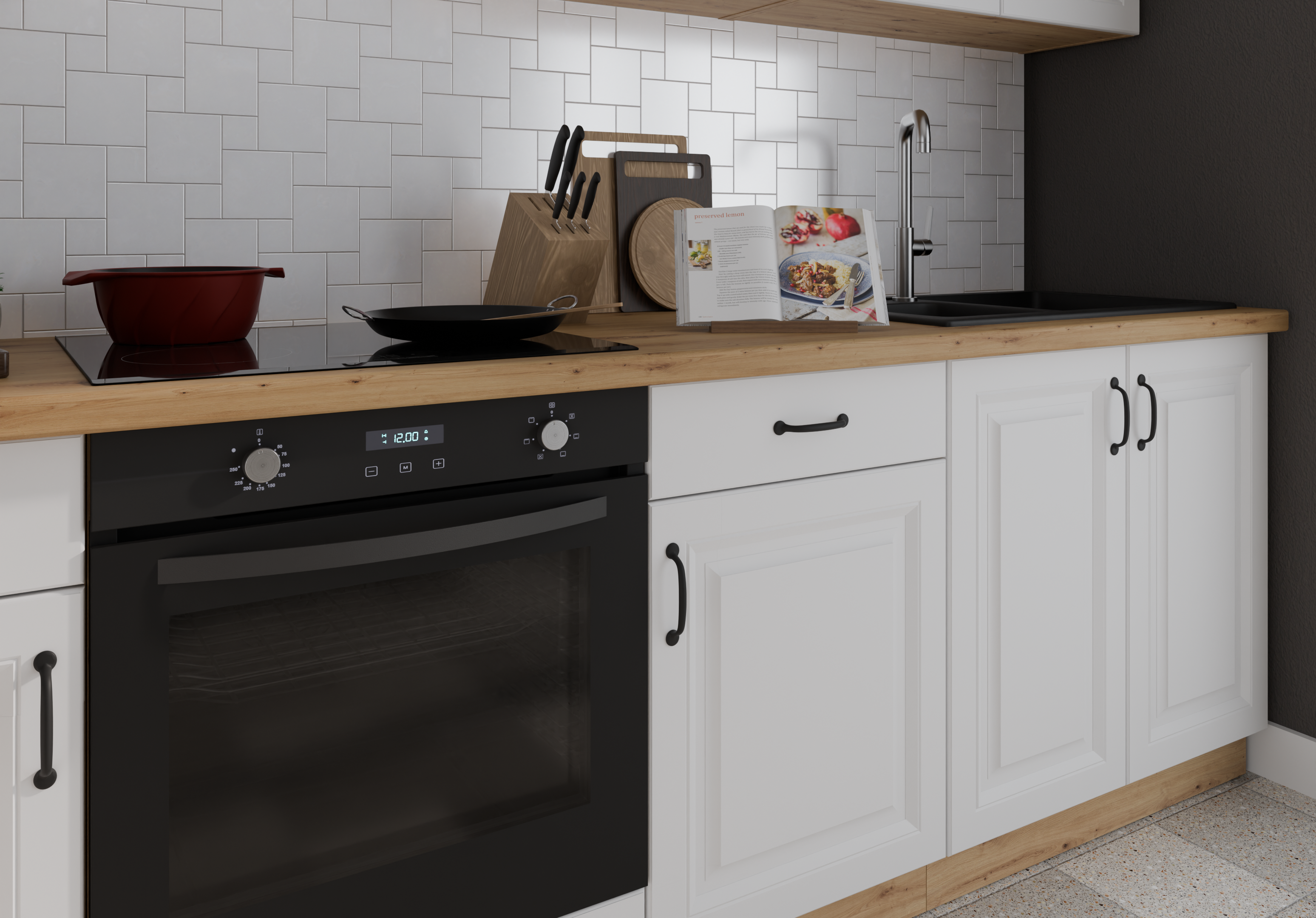 Svaki detalj je promišljeno osmišljen. Fronte od kvalitetne MDF ploče u mat bijeloj boji naglašene su blagim rezkanjem koje dodaje dubinu i vizualni karakter. Crne metalne ručke (96 mm) daju namještaju moderan industrijski štih, a ujedno su ergonomske i ugodne za korištenje. Radna ploča debljine 38 mm u dekoru R20315RU artisan upotpunjuje cjelinu strukturiranom površinom otpornijom na prašinu, vlagu i toplinu.