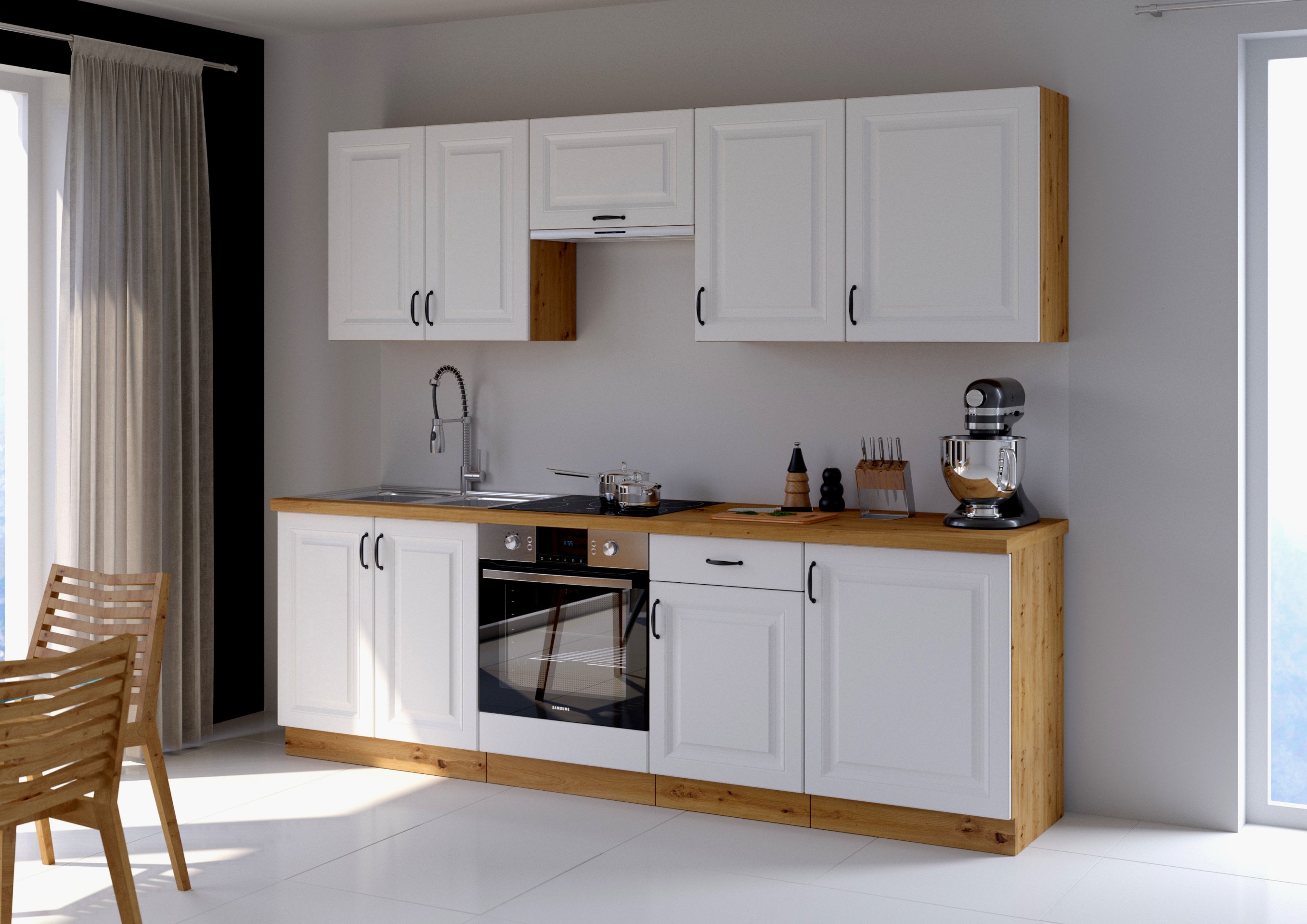 Kada zamišljate savršenu kuhinju, vjerojatno želite prostor koji spaja funkcionalnost, estetiku i profinjenu toplinu domaćeg ugođaja. Upravo to nudi kuhinjski set Stilo u kombinaciji bijela/hrast artisan. Riječ je o elegantnom rješenju za sve koji cijene kvalitetnu izradu, jednostavnost suvremenih linija i bezvremensku ljepotu prirodnih nijansi drva. S dužinom od 250 cm savršeno se uklapa u manje ili srednje velike kuhinjske prostore, bez žrtvovanja praktičnosti i udobnosti.