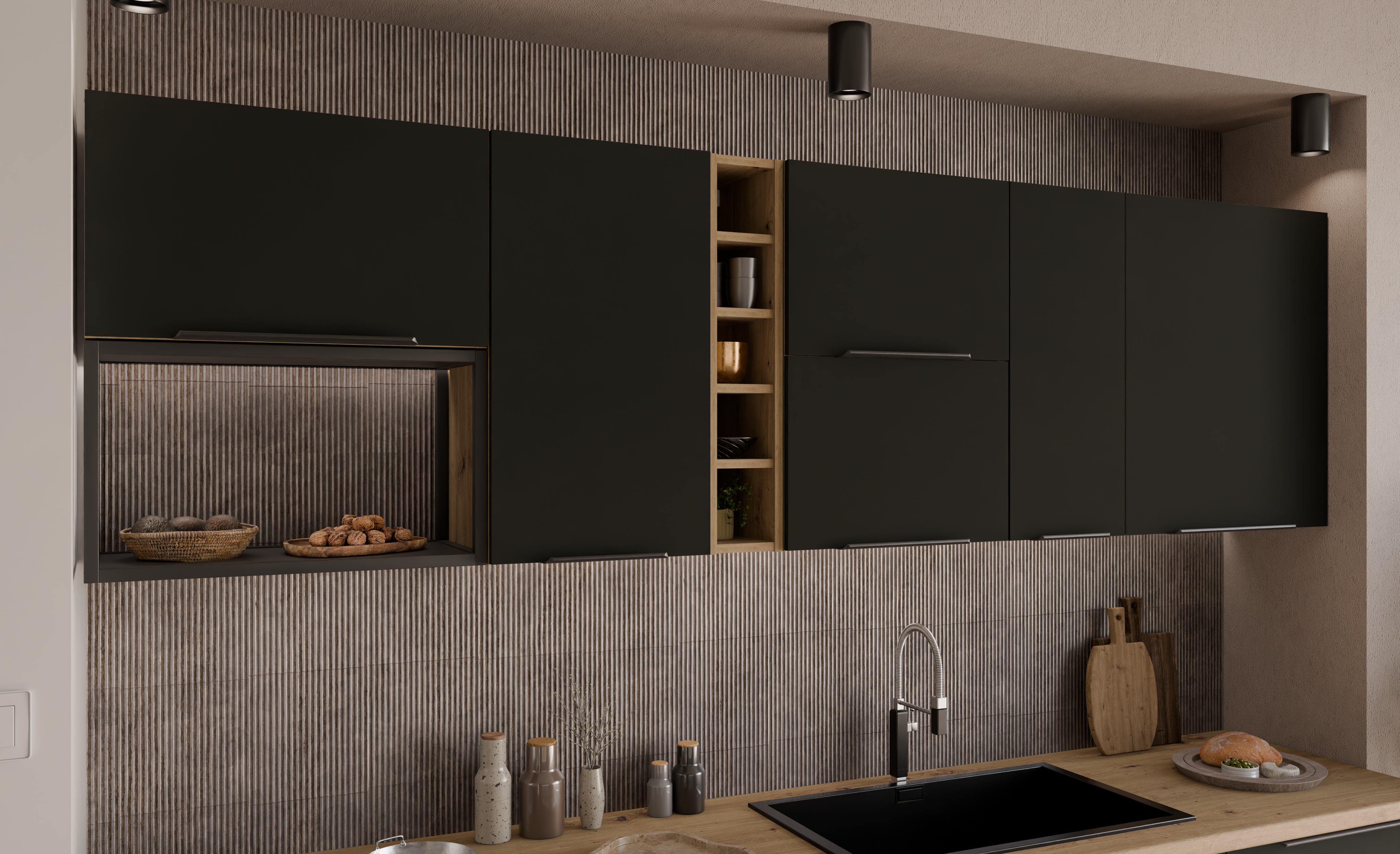 Svaki detalj pažljivo je odabran kako bi dopunio cjelokupnu estetiku i poboljšao korisničko iskustvo. Crno-aluminijski ručkice Edge UA-HEXA svojim minimalističkim izgledom dodaju elegantan završetak, dok različiti razmaci od 64 mm do 320 mm omogućuju savršenu prilagodbu vašim potrebama. Posebnu pozornost dizajneri su posvetili i praktičnosti – sustavi za tiho zatvaranje fronti i ladica osiguravaju glatko i bešumno djelovanje, što će oduševiti sve koji cijene udobnost i kvalitetnu izradu.